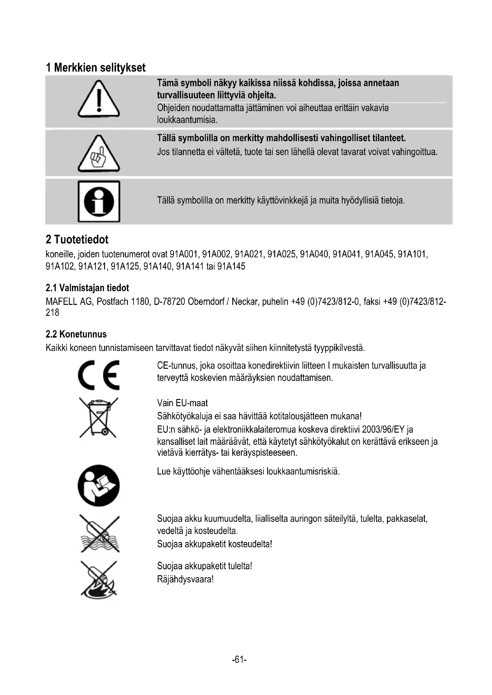 Kaikki koneen tunnistamiseen tarvittavat tiedot näkyvät siihen kiinnitetystä tyyppikilvestä. CE-tunnus, joka osoittaa konedirektiivin liitteen I mukaisten turvallisuutta ja terveyttä koskevien määräyksien noudattamisen. Vain EU-maat Sähkötyökaluja ei saa hävittää kotitalousjätteen mukana! EU:n sähkö- ja elektroniikkalaiteromua koskeva direktiivi 2003/96/EY ja kansalliset lait määräävät, että käytetyt sähkötyökalut on kerättävä erikseen ja vietävä kierrätys- tai keräyspisteeseen. Lue käyttöohje vähentääksesi loukkaantumisriskiä. Suojaa akku kuumuudelta, liialliselta auringon säteilyltä, tulelta, pakkaselat, vedeltä ja kosteudelta. Suojaa akkupaketit kosteudelta! Suojaa akkupaketit tulelta! Räjähdysvaara!-62-