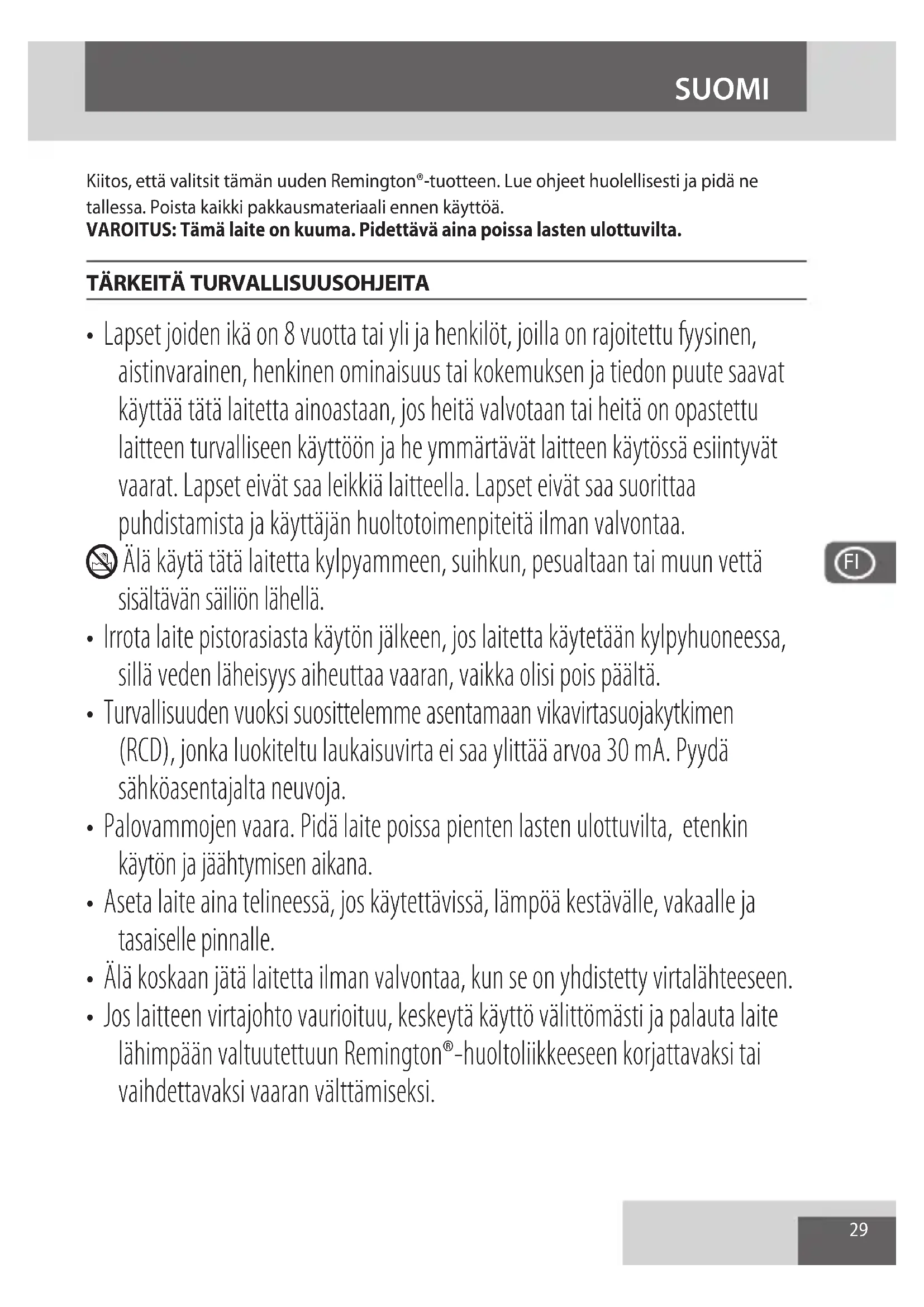 - Jos laitteen virtajohto vaurioituu, keskeytä käyttö välittömästi ja palauta laite lähimpään valtuutettuun Remington®-huoltoliikkeeseen korjattavaksi tai vaihdettavaksi vaaran välttämiseksi. SUOMI