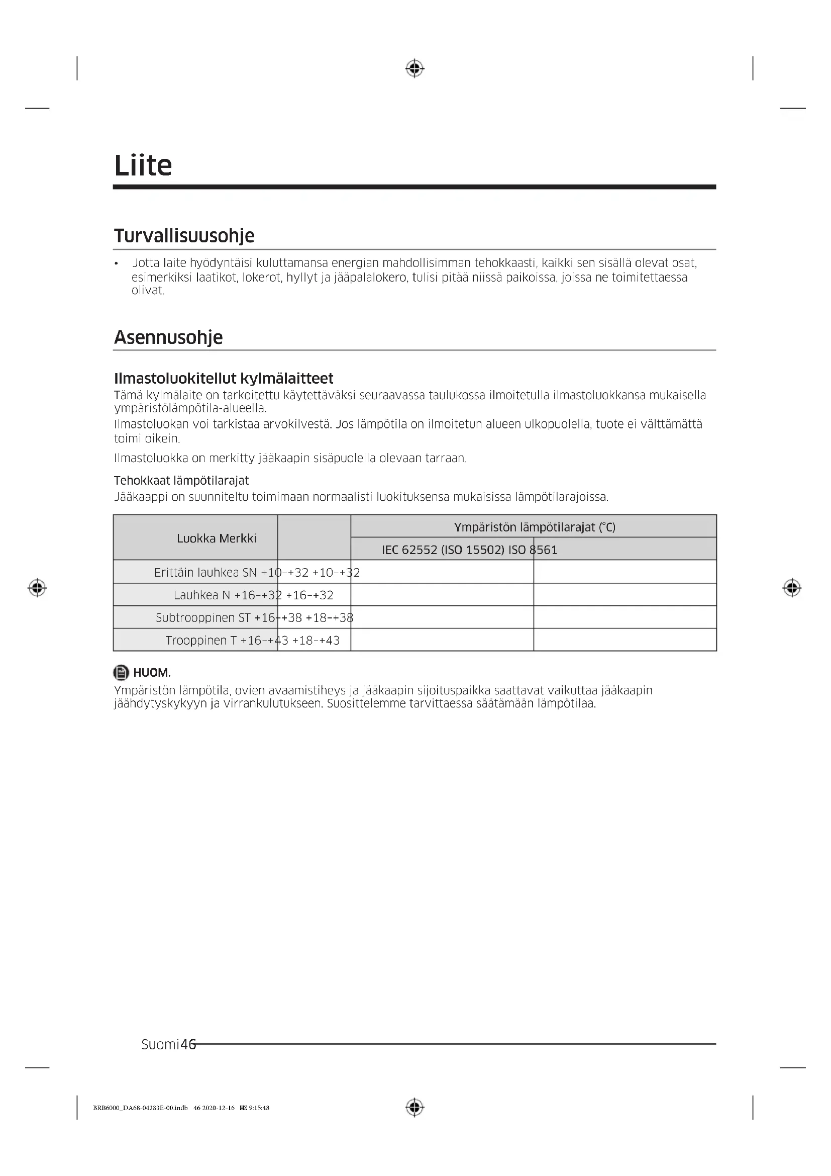 Erittäin lauhkea SN +10–+32 +10–+32 Lauhkea N +16–+32 +16–+32 Subtrooppinen ST +16–+38 +18–+38 Trooppinen T +16–+43 +18–+43 HUOM. Ympäristön lämpötila, ovien avaamistiheys ja jääkaapin sijoituspaikka saattavat vaikuttaa jääkaapin jäähdytyskykyyn ja virrankulutukseen. Suosittelemme tarvittaessa säätämään lämpötilaa. BRB6000_DA68-04283E-00.indb 46 2020-12-16 9:15:48Suomi 47 Lämpötilaohje Suositeltu lämpötila Ihanteellinen säilytyslämpötila-asetus: