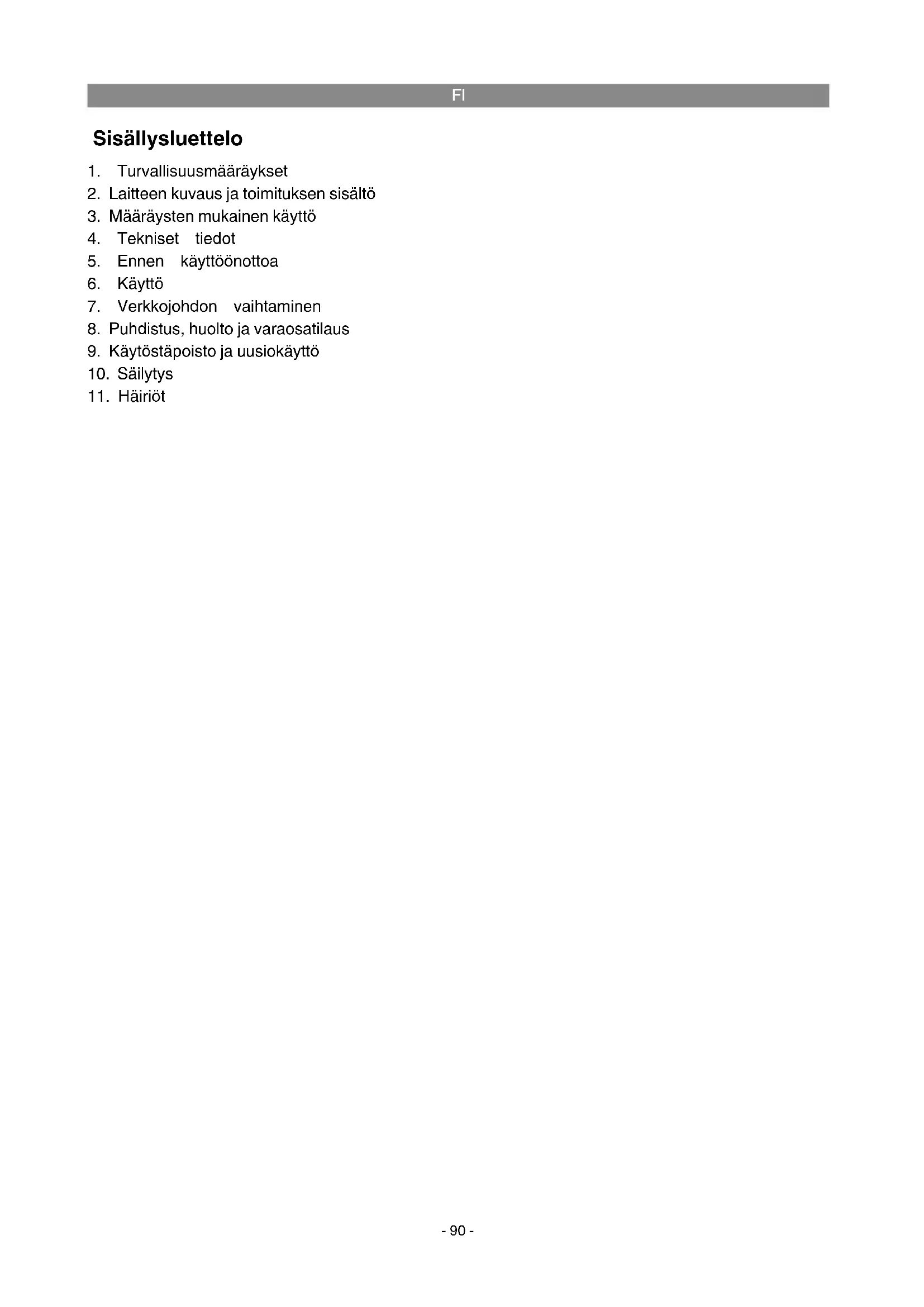 - laitteessa esiintyneet vauriot, jotka aiheutuvat asennusohjeen noudattamatta jättämisestä tai asi- antuntemattomasta asennuksesta, käyttöohjeen noudattamatta jättämisestä (kuten esim. liitäntä väärään verkkojännitteeseen tai virtalajiin) tai huolto- ja turvallisuusmääräysten laiminlyönnistä tai laitteen altistamista epänormaaleille ympäristöolosuhteille tai puutteellisesta hoidosta ja huollosta. - laitteessa esiintyneet vauriot, jotka aiheutuvat määräysten vastaisesta tai virheellisestä käytöstä (esim. laitteen ylikuormitus tai hyväksymättömien liitostyökalujen tai varusteiden käyttö), vieraiden esineiden tunkeutumisesta laitteeseen (esim. hiekka, kivet tai pöly, kuljetusvauriot), väkivoiman käy- töstä tai ulkopuolisista tekijöistä (esim. putoamisesta aiheutuneet vahingot). - laitteessa tai sen osissa esiintyneet vauriot, jotka aiheutuvat käytöstä johtuvasta, tavanomaisesta tai muuten tavallisesta kulumisesta.