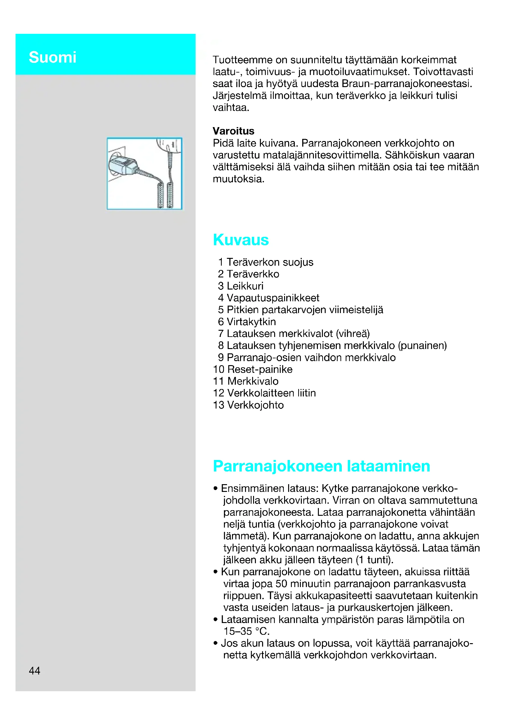 Series 360°Complete 5647453_8975_70_S4-74 Seite 46 Dienstag, 7. März 2006 12:27 1247 Parranajo-osien vaihdon merkkivalo vilkkuu ja sammuu, kun nollaus on suoritettu. Manuaalinen nollaus voidaan tehdä milloin tahansa. Akkujen tehokkuuden säilyttäminen Jotta akkujen varauskyky pysyisi mahdollisimman hyvänä, niiden varaus täytyy tyhjentää kokonaan normaa- lissa käytössä noin 6 kuukauden välein. Lataa tämän jälkeen parranajokoneen akut täyteen. Älä säilytä laitetta pitkään yli 50 °C:een lämpötilassa. Ympäristöseikkoihin liittyviä tietoja Tässä laitteessa on ladattavat akut. Ympäristönsuojelullisista syistä tuotetta ei saa hävittää kotitalousjätteen mukana käyttöiän päättyessä. Hävitä tuote viemällä se Braun- huoltoliikkeeseen tai asianmukaiseen keräyspisteeseen. Tiedot voivat muuttua ilman ennakkoilmoitusta. Tämä tuote täyttää EU-direktiivin 89/336/EEC mukaiset EMC-vaatimukset sekä matalajännitettä koskevat säännökset (73/23 EEC). Katso sähkömääräyksiä koskevat tiedot matalajännitesovittimesta. 5647453_8975_70_S4-74 Seite 47 Dienstag, 7. März 2006 12:27 1248 Ürünlerimiz, yüksek kalite, fonksiyonellik ve µ∂k dizayn ilkelerine baπl∂ kal∂narak tasarlanm∂µt∂r. Yeni Braun t∂raµ makinenizden memnun kalacaπ∂n∂z∂ umar∂z. Sistem size elek ve b∂çaπ∂n∂z∂ ne zaman deπiµtirmeniz gerektiπini söy- leyecektir. Önemli Makinenizi kuru tutun. T∂raµ makinenizin ekstra düµük voltaj için güvenlik saπlayan adaptor içeren özel kablo seti vard∂r. Bu setin hiçbir parças∂n∂ deπiµtirmeyin veya baµka amaçlar için kullanmay∂n aksi taktirde elektrik µoku mey- dana gelebilir. Tan∂mlar 1 Elek koruma kapaπ∂ 2 T∂raµ makinesi eleπi 3 Kesici b∂çaklar 4 Serbest b∂rakma düπmeleri 5 Uzun tüy düzeltici 6 Anahtar 7 Ωarj ∂µ∂klar∂ (yeµil) 8 Düµük µarj seviye ∂µ∂π∂ (k∂rm∂z∂) 9 Yedek parçalar için deπiµim ∂µ∂π∂ 10 S∂f∂rlama düπmesi 11 Pilot ∂µ∂π∂ 12 T∂raµ makinesi soketi 13 Özel kablo seti Tıraµ makinesini µarj etme