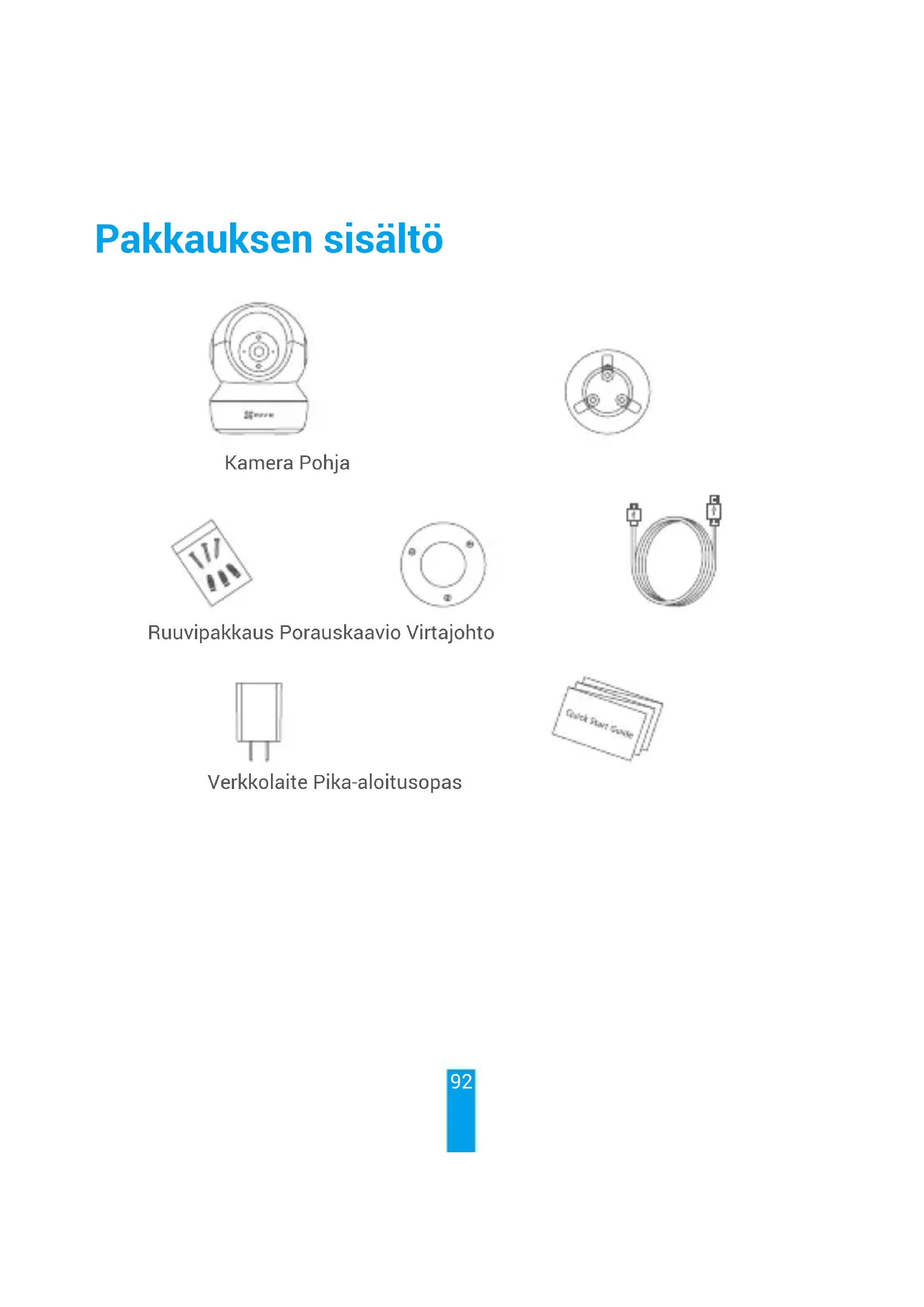 Installér kameraet Montér kameraet på foden, og drej det med uret, indtil det sidder fast. Efter installation af kameraet skal du gå ind i EZVIZ-appen og vende kamerabilledet. Besøg www.ezvizlife.com for at få ere oplysninger.92 Pakkauksen sisältö Kamera Pohja Ruuvipakkaus Porauskaavio Virtajohto Verkkolaite Pika-aloitusopas93 Perustiedot Micro SD -korttipaikka Nollauspainike Mikrofoni LED-merkkivalo Nimi Kuvaus LED-merkkivalo • Tasaisesti palava punainen: kamera käynnistyy.