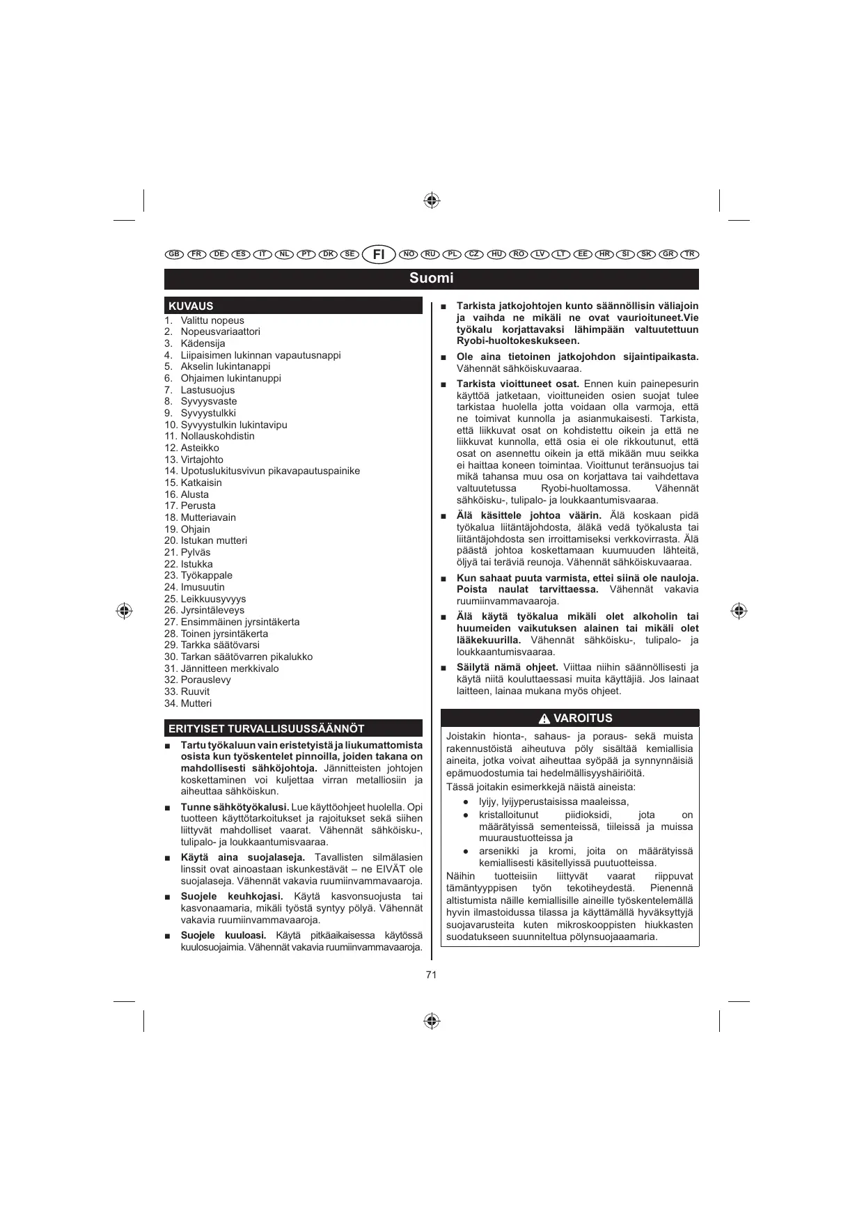 Älä heitä raaka-aineita kotitalousjätteisiin, vaan vie ne kierrätykseen. Ympäristönsuojelun kannalta työkalu, lisäva r usteet ja pakkausmateriaali on lajiteltava. SYMBOLI Turvavaroitus