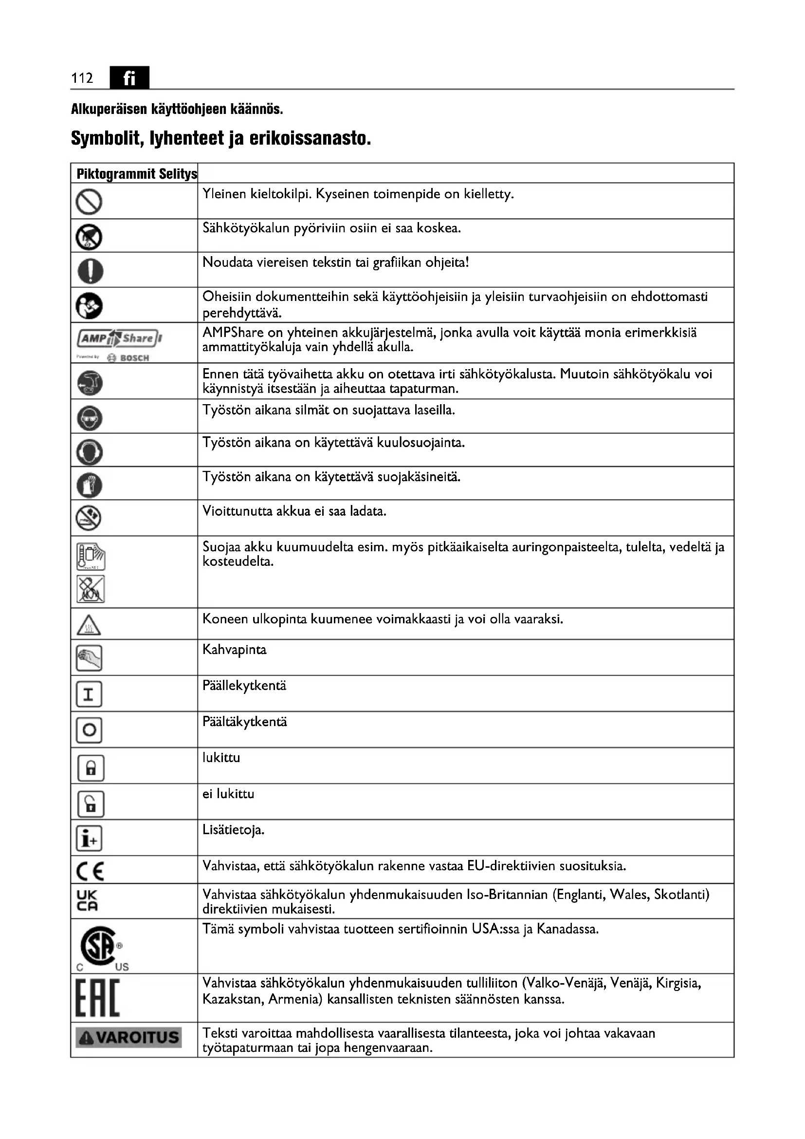 Alkuperäisen käyttöohjeen käännös. Symbolit, lyhenteet ja erikoissanasto. Piktogrammit Selitys Yleinen kieltokilpi. Kyseinen toimenpide on kielletty. Sähkötyökalun pyöriviin osiin ei saa koskea. Noudata viereisen tekstin tai grafiikan ohjeita! Oheisiin dokumentteihin sekä käyttöohjeisiin ja yleisiin turvaohjeisiin on ehdottomasti perehdyttävä. AMPShare on yhteinen akkujärjestelmä, jonka avulla voit käyttää monia erimerkkisiä ammattityökaluja vain yhdellä akulla. Ennen tätä työvaihetta akku on otettava irti sähkötyökalusta. Muutoin sähkötyökalu voi käynnistyä itsestään ja aiheuttaa tapaturman. Työstön aikana silmät on suojattava laseilla. Työstön aikana on käytettävä kuulosuojainta. Työstön aikana on käytettävä suojakäsineitä. Vioittunutta akkua ei saa ladata. Suojaa akku kuumuudelta esim. myös pitkäaikaiselta auringonpaisteelta, tulelta, vedeltä ja kosteudelta. Koneen ulkopinta kuumenee voimakkaasti ja voi olla vaaraksi. Kahvapinta Päällekytkentä Päältäkytkentä lukittu ei lukittu Lisätietoja. Vahvistaa, että sähkötyökalun rakenne vastaa EU-direktiivien suosituksia. Vahvistaa sähkötyökalun yhdenmukaisuuden Iso-Britannian (Englanti, Wales, Skotlanti) direktiivien mukaisesti. Tämä symboli vahvistaa tuotteen sertifioinnin USA:ssa ja Kanadassa. Vahvistaa sähkötyökalun yhdenmukaisuuden tulliliiton (Valko-Venäjä, Venäjä, Kirgisia, Kazakstan, Armenia) kansallisten teknisten säännösten kanssa. Teksti varoittaa mahdollisesta vaarallisesta tilanteesta, joka voi johtaa vakavaan työtapaturmaan tai jopa hengenvaaraan. max.50°C113