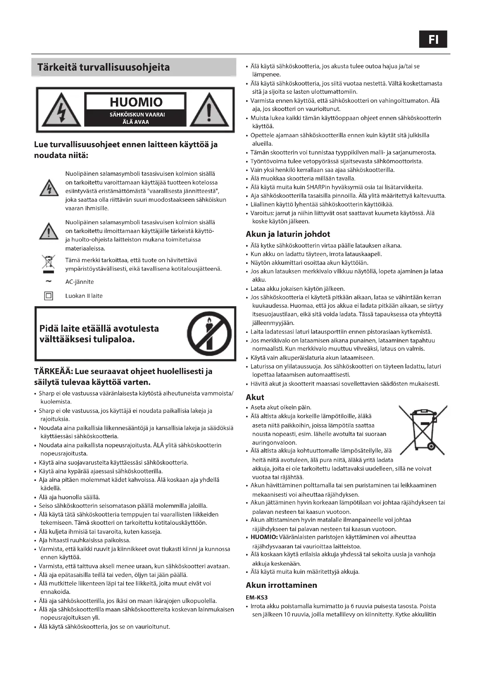 - Sharp ei ole vastuussa vääränlaisesta käytöstä aiheutuneista vammoista/kuolemista.• Sharp ei ole vastuussa, jos käyttäjä ei noudata paikallisia lakeja ja rajoituksia.• Noudata aina paikallisia liikennesääntöjä ja kansallisia lakeja ja säädöksiä käyttäessäsi sähköskootteria.• Noudata aina paikallista nopeusrajoitusta. ÄLÄ ylitä sähköskootterin nopeusrajoitusta.• Käytä aina suojavarusteita käyttäessäsi sähköskootteria.• Käytä aina kypärää ajaessasi sähköskootterilla.• Aja aina pitäen molemmat kädet kahvoissa. Älä koskaan aja yhdellä kädellä.• Älä aja huonolla säällä.• Seiso sähköskootterin seisomatason päällä molemmilla jaloilla.• Älä käytä tätä sähköskootteria temppujen tai vaarallisten liikkeiden tekemiseen. Tämä skootteri on tarkoitettu kotitalouskäyttöön.• Älä kuljeta ihmisiä tai tavaroita, kuten kasseja.• Aja hitaasti ruuhkaisissa paikoissa.• Varmista, että kaikki ruuvit ja kiinnikkeet ovat tiukasti kiinni ja kunnossa ennen käyttöä.• Varmista, että taittuva akseli menee uraan, kun sähköskootteri avataan.• Älä aja epätasaisilla teillä tai veden, öljyn tai jään päällä.• Älä mutkittele liikenteen läpi tai tee liikkeitä, joita muut eivät voi ennakoida.• Älä aja sähköskootterilla, jos ikäsi on maan ikärajojen ulkopuolella.• Älä aja sähköskootterilla maan sähköskoottereita koskevan lainmukaisen nopeusrajoituksen yli.• Älä käytä sähköskootteria, jos se on vaurioitunut.• Älä käytä sähköskootteria, jos akusta tulee outoa hajua ja/tai se lämpenee.• Älä käytä sähköskootteria, jos siitä vuotaa nestettä. Vältä koskettamasta sitä ja sijoita se lasten ulottumattomiin.• Varmista ennen käyttöä, että sähköskootteri on vahingoittumaton. Älä aja, jos skootteri on vaurioitunut.• Muista lukea kaikki tämän käyttöoppaan ohjeet ennen sähköskootterin käyttöä.• Opettele ajamaan sähköskootterilla ennen kuin käytät sitä julkisilla alueilla.• Tämän skootterin voi tunnistaa tyyppikilven malli- ja sarjanumerosta.• Työntövoima tulee vetopyörässä sijaitsevasta sähkömoottorista.• Vain yksi henkilö kerrallaan saa ajaa sähköskootterilla.• Älä muokkaa skootteria millään tavalla.• Älä käytä muita kuin SHARPin hyväksymiä osia tai lisätarvikkeita.• Aja sähköskootterilla tasaisilla pinnoilla. Älä ylitä määritettyä kaltevuutta.• Liiallinen käyttö lyhentää sähköskootterin käyttöikää.• Varoitus: jarrut ja niihin liittyvät osat saattavat kuumeta käytössä. Älä koske käytön jälkeen. Akun ja laturin johdot