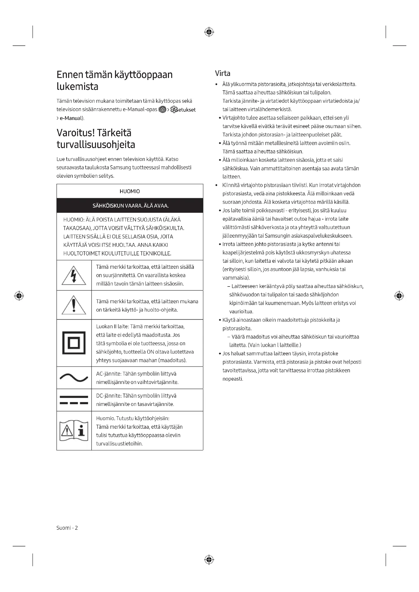 - Av sikkerhetsgrunner må du ikke prøve å ta ut batteriet selv. Hvis batteriet ikke tas ut på riktig måte, kan det føre til skade på batteriet og enheten, resultere i personskader og/eller gjøre enheten utrygg. Norsk - 8Denne siden er tom med hensikt.Ennen tämän käyttöoppaan lukemista Tämän television mukana toimitetaan tämä käyttöopas sekä televisioon sisäänrakennettu e-Manual-opas ( > Asetukset > e-Manual). Varoitus! Tärkeitä turvallisuusohjeita Lue turvallisuusohjeet ennen television käyttöä. Katso seuraavasta taulukosta Samsung tuotteessasi mahdollisesti olevien symbolien selitys. HUOMIO SÄHKÖISKUN VAARA. ÄLÄ AVAA. HUOMIO: ÄLÄ POISTA LAITTEEN SUOJUSTA (ÄLÄKÄ TAKAOSAA), JOTTA VOISIT VÄLTTYÄ SÄHKÖISKUILTA. LAITTEEN SISÄLLÄ EI OLE SELLAISIA OSIA, JOITA KÄYTTÄJÄ VOISI ITSE HUOLTAA. ANNA KAIKKI HUOLTOTOIMET KOULUTETUILLE TEKNIKOILLE. Tämä merkki tarkoittaa, että laitteen sisällä on suurjännitettä. On vaarallista koskea millään tavoin tämän laitteen sisäosiin. Tämä merkki tarkoittaa, että laitteen mukana on tärkeitä käyttö- ja huolto-ohjeita. LuokanII laite: Tämä merkki tarkoittaa, että laite ei edellytä maadoitusta. Jos tätä symbolia ei ole tuotteessa, jossa on sähköjohto, tuotteella ON oltava luotettava yhteys suojaavaan maahan (maadoitus). AC-jännite: Tähän symboliin liittyvä nimellisjännite on vaihtovirtajännite. DC-jännite: Tähän symboliin liittyvä nimellisjännite on tasavirtajännite. Huomio. Tutustu käyttöohjeisiin: Tämä merkki tarkoittaa, että käyttäjän tulisi tutustua käyttöoppaassa oleviin turvallisuustietoihin. Virta
