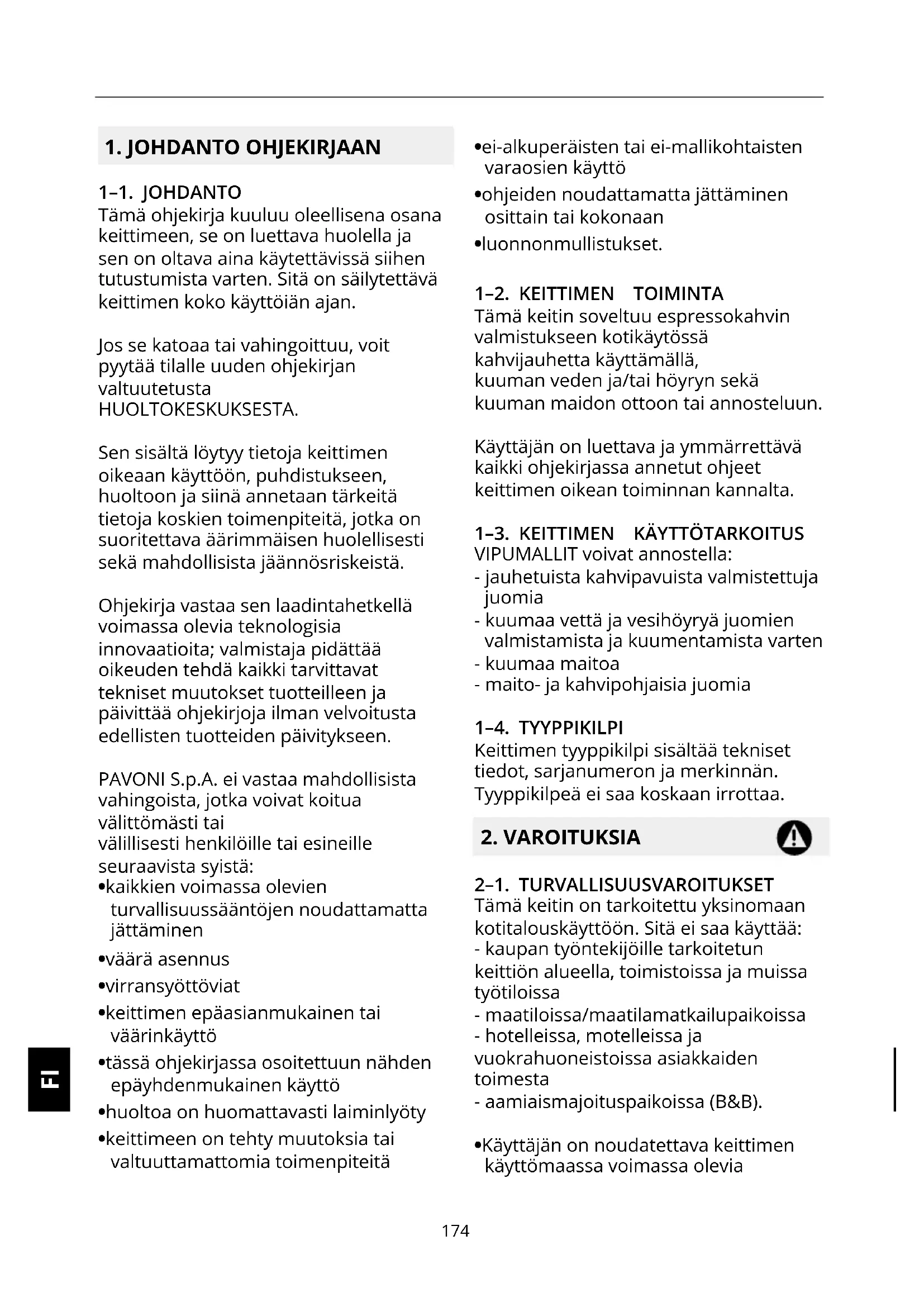 1–1. JOHDANTO Tämä ohjekirja kuuluu oleellisena osana keittimeen, se on luettava huolella ja sen on oltava aina käytettävissä siihen tutustumista varten. Sitä on säilytettävä keittimen koko käyttöiän ajan. Jos se katoaa tai vahingoittuu, voit pyytää tilalle uuden ohjekirjan valtuutetusta HUOLTOKESKUKSESTA. Sen sisältä löytyy tietoja keittimen oikeaan käyttöön, puhdistukseen, huoltoon ja siinä annetaan tärkeitä tietoja koskien toimenpiteitä, jotka on suoritettava äärimmäisen huolellisesti sekä mahdollisista jäännösriskeistä. Ohjekirja vastaa sen laadintahetkellä voimassa olevia teknologisia innovaatioita; valmistaja pidättää oikeuden tehdä kaikki tarvittavat tekniset muutokset tuotteilleen ja päivittää ohjekirjoja ilman velvoitusta edellisten tuotteiden päivitykseen. PAVONI S.p.A. ei vastaa mahdollisista vahingoista, jotka voivat koitua välittömästi tai välillisesti henkilöille tai esineille seuraavista syistä:
