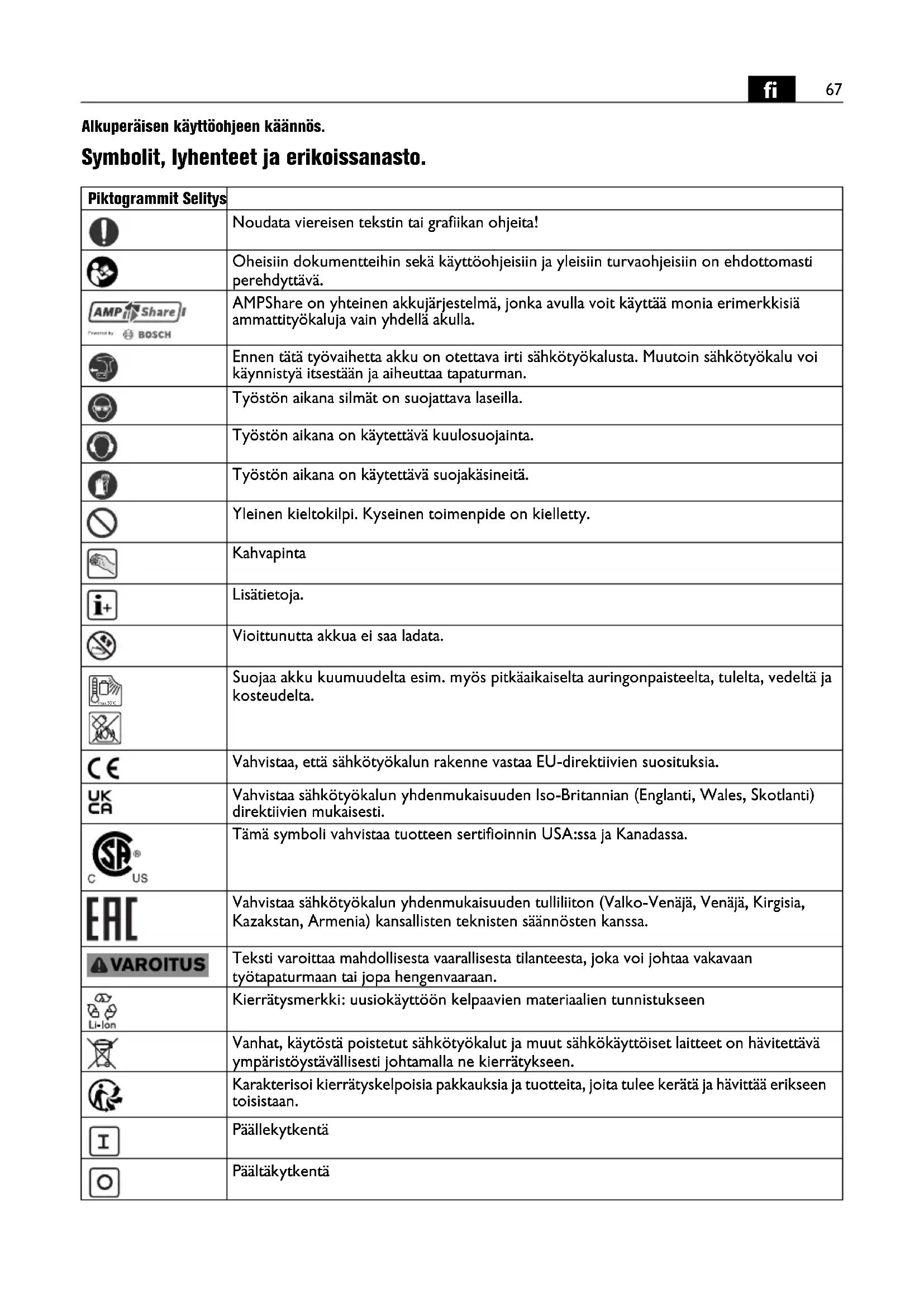 Alkuperäisen käyttöohjeen käännös. Symbolit, lyhenteet ja erikoissanasto. Piktogrammit Selitys Noudata viereisen tekstin tai grafiikan ohjeita! Oheisiin dokumentteihin sekä käyttöohjeisiin ja yleisiin turvaohjeisiin on ehdottomasti perehdyttävä. AMPShare on yhteinen akkujärjestelmä, jonka avulla voit käyttää monia erimerkkisiä ammattityökaluja vain yhdellä akulla. Ennen tätä työvaihetta akku on otettava irti sähkötyökalusta. Muutoin sähkötyökalu voi käynnistyä itsestään ja aiheuttaa tapaturman. Työstön aikana silmät on suojattava laseilla. Työstön aikana on käytettävä kuulosuojainta. Työstön aikana on käytettävä suojakäsineitä. Yleinen kieltokilpi. Kyseinen toimenpide on kielletty. Kahvapinta Lisätietoja. Vioittunutta akkua ei saa ladata. Suojaa akku kuumuudelta esim. myös pitkäaikaiselta auringonpaisteelta, tulelta, vedeltä ja kosteudelta. Vahvistaa, että sähkötyökalun rakenne vastaa EU-direktiivien suosituksia. Vahvistaa sähkötyökalun yhdenmukaisuuden Iso-Britannian (Englanti, Wales, Skotlanti) direktiivien mukaisesti. Tämä symboli vahvistaa tuotteen sertifioinnin USA:ssa ja Kanadassa. Vahvistaa sähkötyökalun yhdenmukaisuuden tulliliiton (Valko-Venäjä, Venäjä, Kirgisia, Kazakstan, Armenia) kansallisten teknisten säännösten kanssa. Teksti varoittaa mahdollisesta vaarallisesta tilanteesta, joka voi johtaa vakavaan työtapaturmaan tai jopa hengenvaaraan. Kierrätysmerkki: uusiokäyttöön kelpaavien materiaalien tunnistukseen Vanhat, käytöstä poistetut sähkötyökalut ja muut sähkökäyttöiset laitteet on hävitettävä ympäristöystävällisesti johtamalla ne kierrätykseen. Karakterisoi kierrätyskelpoisia pakkauksia ja tuotteita, joita tulee kerätä ja hävittää erikseen toisistaan. Päällekytkentä Päältäkytkentä max.50°C68