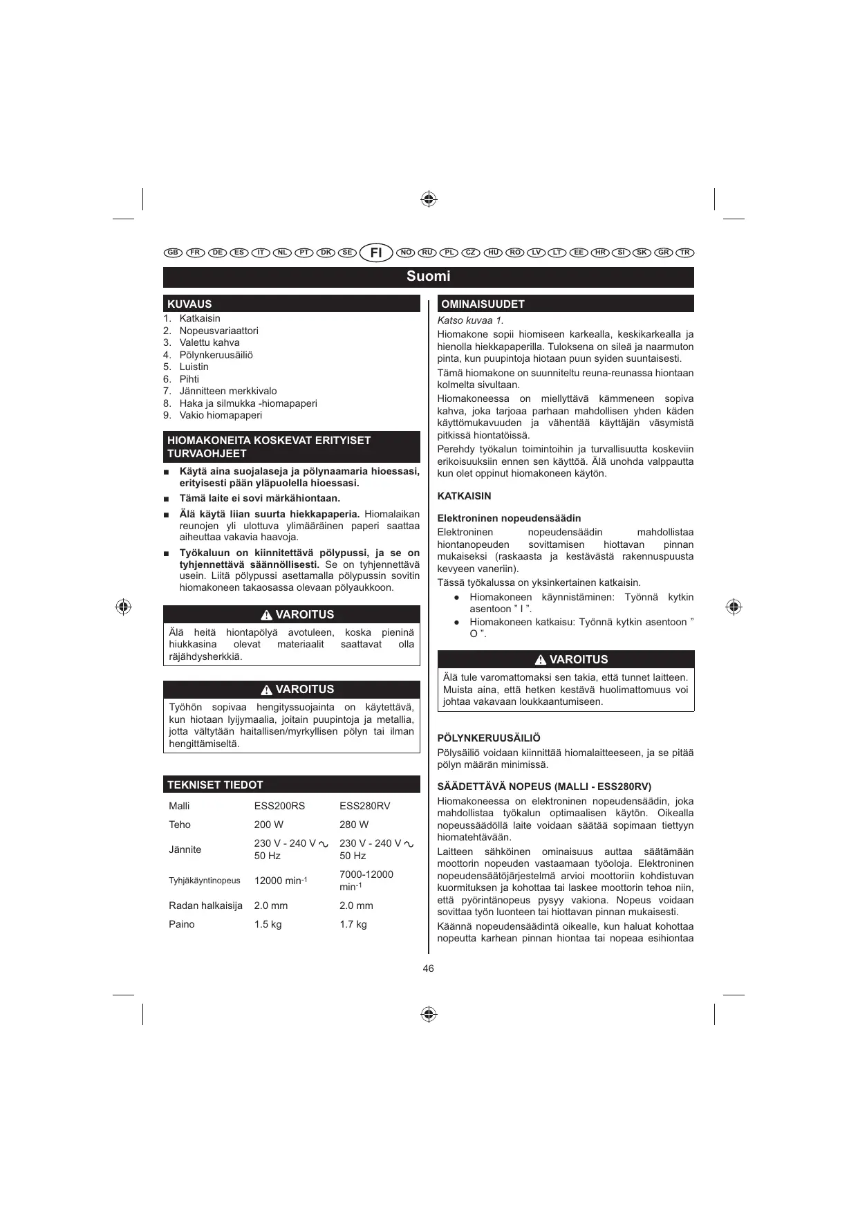 Työkaluun on kiinnitettävä pölypussi, ja se on tyhjennettävä säännöllisesti. Se on tyhjennettävä usein. Liitä pölypussi asettamalla pölypussin sovitin hiomakoneen takaosassa olevaan pölyaukkoon. Elektroninen nopeudensäädin Elektroninen nopeudensäädin mahdollistaa hiontanopeuden sovittamisen hiottavan pinnan mukaiseksi (raskaasta ja kestävästä rakennuspuusta kevyeen vaneriin). Tässä työkalussa on yksinkertainen katkaisin. È Hiomakoneen käynnistäminen: Työnnä kytkin asentoon ” I ”. È Hiomakoneen katkaisu: Työnnä kytkin asentoon ” O ”. VAROITUS Älä heitä hiontapölyä avotuleen, koska pieninä hiukkasina olevat materiaalit saattavat olla räjähdysherkkiä. VAROITUS Älä tule varomattomaksi sen takia, että tunnet laitteen. Muista aina, että hetken kestävä huolimattomuus voi johtaa vakavaan loukkaantumiseen. VAROITUS Työhön sopivaa hengityssuojainta on käytettävä, kun hiotaan lyijymaalia, joitain puupintoja ja metallia, jotta vältytään haitallisen/myrkyllisen pölyn tai ilman hengittämiseltä.