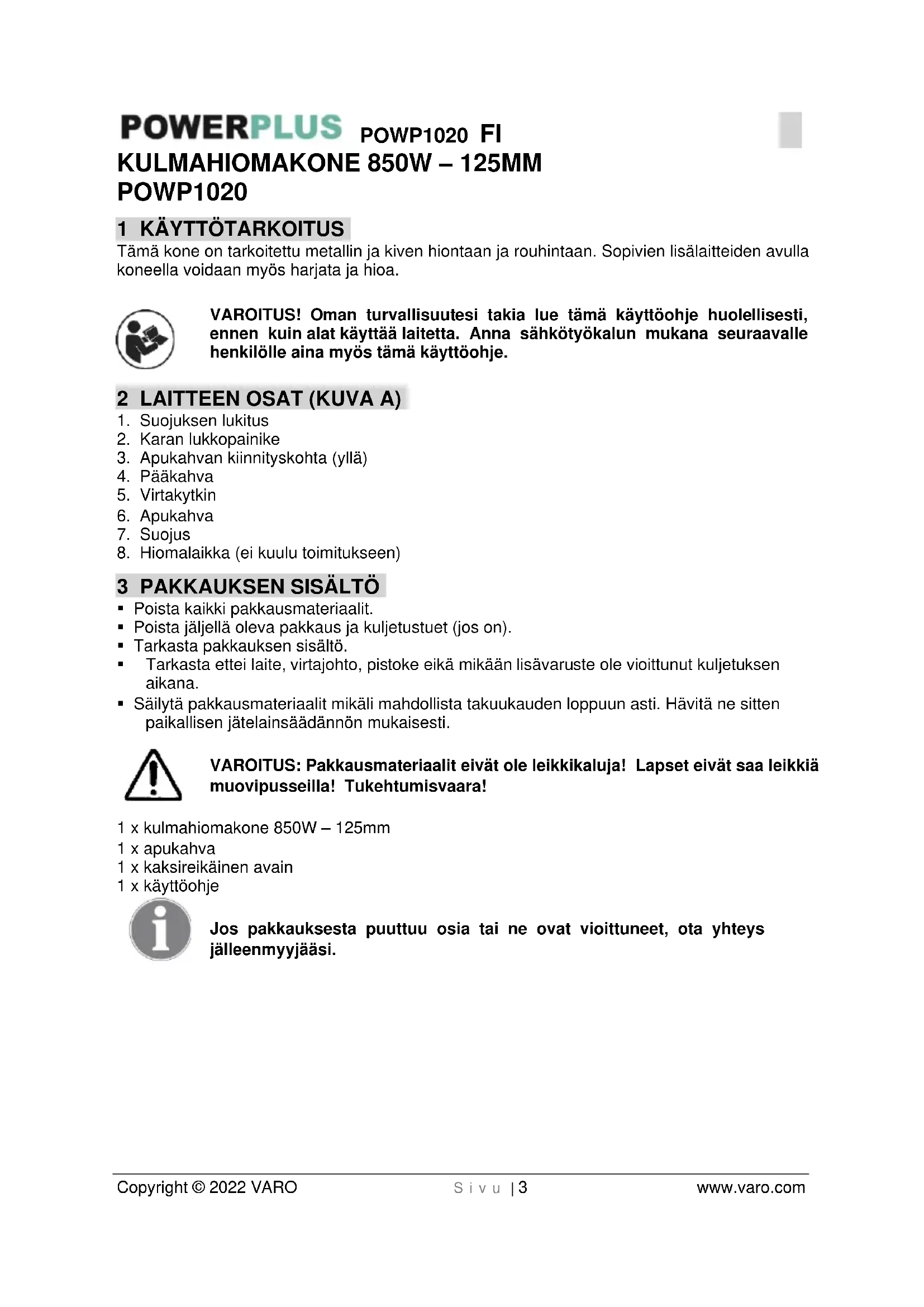 - Korjauta laitteesi ainoastaan pätevällä ammattihenkilöllä, joka käyttää vain alkuperäisiä varaosia. Näin varmistat, että laitteesi on turvallinen sitä käytettäessä.POWP1020 FI Copyright © 2022 VARO S i v u | 6 www.varo.com