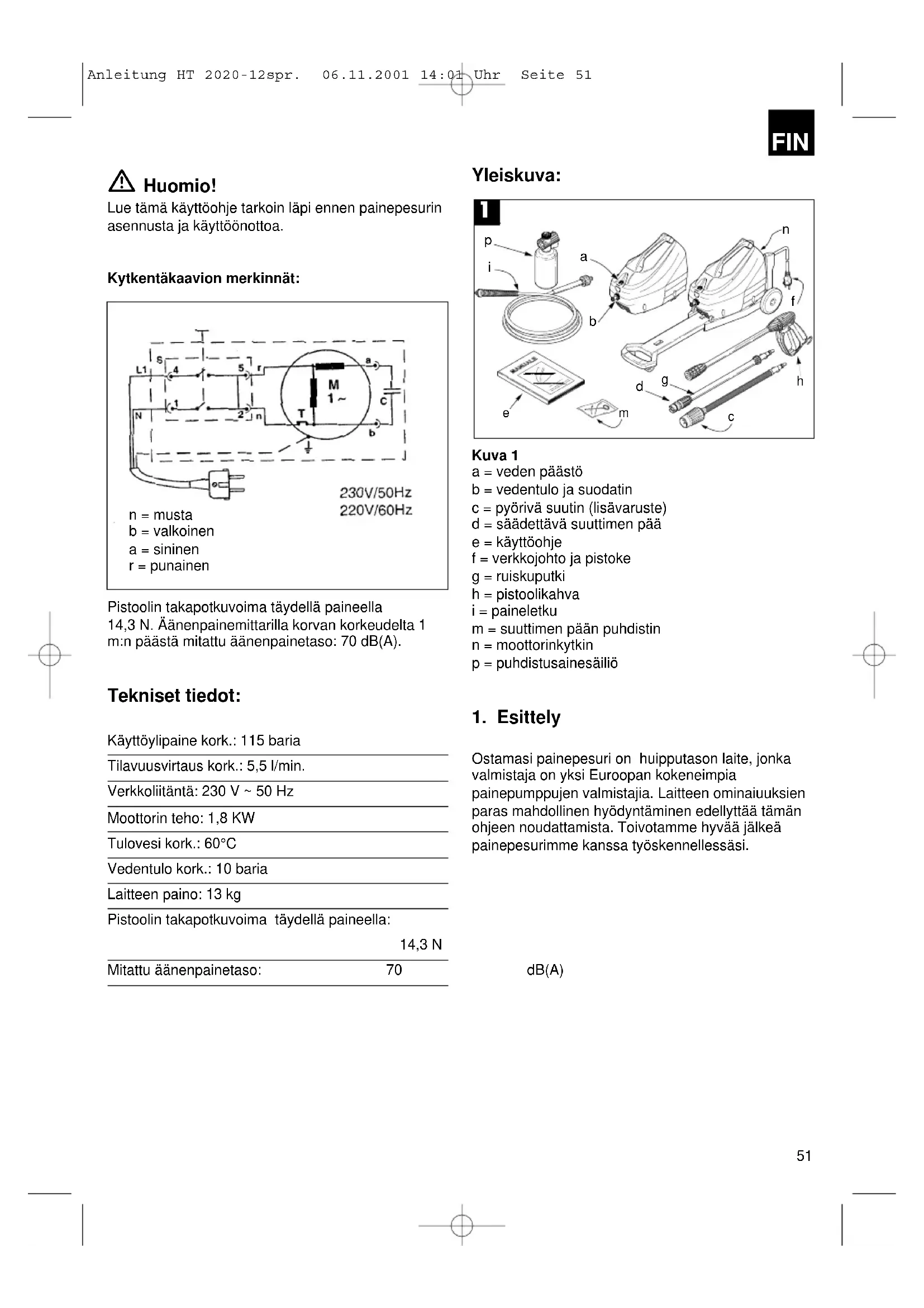 Häiriö Syy Poisto - Pumppu ei saavuta määrät tyä painetta - Paine vaihtelee - Äänekäs käyttö - Suutinpäästä pursuu vettä tai öljyä - Sähkömoottori ei käynnisty - Moottori surisee, mutta ei käynnisty - Virtajohto vahingoittunut - Suutin kulunut tai väärä - Vedensuodatin likainen - Vedentuonti ei riitä - Ilman imu - Pumppua ei huuhdottu - Säätöpää säädetty väärin - Vettä imetään ulkoisesta säiliöstä - Veden lämpötila liian korkea - Suutin tukossa - Lämpötila liian korkea - Ilman imu - Tiivisteet kuluneet - Jännite puuttuu - Verkkojännite alle annetun alimman arvon - Jatkojohdon aiheuttama jännitehäviö (läpimitta pieni, pituus liian suuri) - Painepesuria ei ole käytetty pitkään aikaan - Vaihda suutin - Puhdista suodatin - Avaa vesihana täysin - Tarkista liitännät - Sammuta painepesuri ja paina laukaisinta, kunnes vesisuihku on tasamuotoinen. Käynnistä uudelleen. - Vedä päätä taaksepäin - Liitä painepesuri vesijohtoon - Laske lämpötilaa - Käytä puhdistinta - Laske lämpötilaa - Tarkista veden tulo- ja poisto liitännät - Vaihda tiivisteet - Tarkista, onko pistorasiassa ja järjestelmässä jännite - Tarkista, että jännitejohto on oikeantyyppinen - Noudata jatkojohdosta annettuja ohjeita - Kierrä moottori vapaaksi ruuviavaimella takasivun reiän kautta (kuva 6b) - Ota yhteys huoltopalveluun. Jos moottori sammuu käytön aikana eikä käynnisty uudelleen, odota 2-3 minuuttia ennen uudelleen käynnistämistä. Tässä tapauksessa moottorin turvakytkin on lauennut. Jos häiriö tulee toistuvasti, ota yhteys huoltopalveluun. Anleitung HT 2020-12spr. 06.11.2001 14:01 Uhr Seite 57 OBS! Vennligst les denne bruksanvisningen nøye før De installerer og tar i bruk høytrykkspyleren. Koplingsskjema-betegnelse: Reaksjonskraft til pistolen er 14,3 N på det høyeste trykket. Lydtrykknivå målt med lydmåler i ørehøyde på 1 m avstand: 70 dB(A). Tekniske data: Driftstrykk maks. bar: 115 Maksimalt vannforbruk: 5,5 l/min. Strømforsyning: 230 V -50 Hz Motorkapasitet kW: 1,8 Maks. vanntemperatur: 60°C Maks. vanntrykk: 10 bar Apparatvekt: 13 kg Reaksjonskraft på pistolen ved høyeste trykk: 14,3 N Målt støynivå: 70 dB(A). Oversikt Fig. 1 a = Vannutløp b = Vanninnløp med filter c = Rotordyse (ekstra-utstyr) d = Innstillbart dysehode e = Bruksanvisning f = Tilkoplingsledning med støpsel g = Strålerør h = Pistolhåndtak i = Høytrykkslange m =Dysehoderenser n = Motorbryter p = Rengjøringsmiddelbeholder