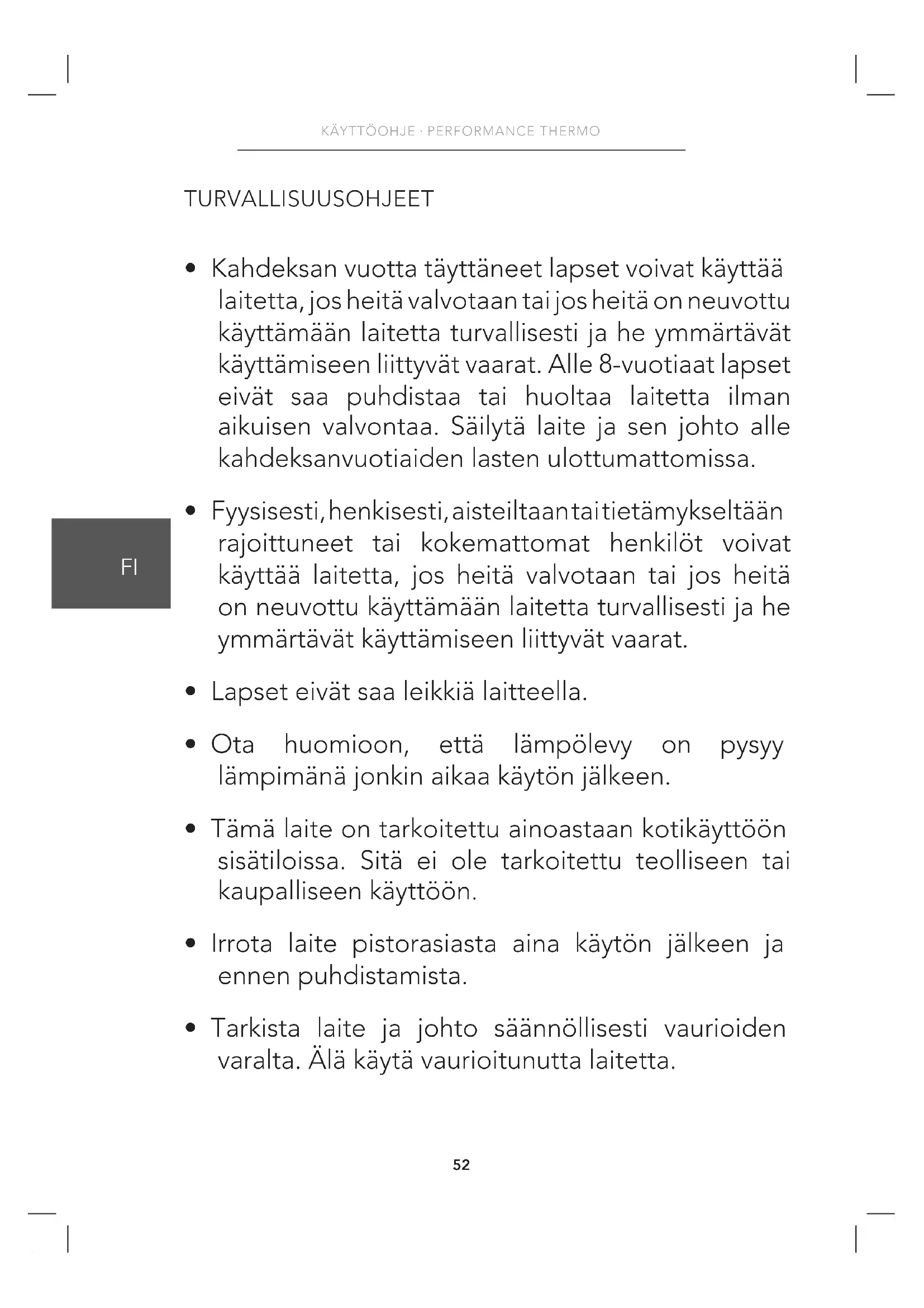 - Kahdeksan vuotta täyttäneet lapset voivat käyttää laitetta, jos heitä valvotaan tai jos heitä on neuvottu käyttämään laitetta turvallisesti ja he ymmärtävät käyttämiseen liittyvät vaarat. Alle 8-vuotiaat lapset eivät saa puhdistaa tai huoltaa laitetta ilman aikuisen valvontaa. Säilytä laite ja sen johto alle kahdeksanvuotiaiden lasten ulottumattomissa.