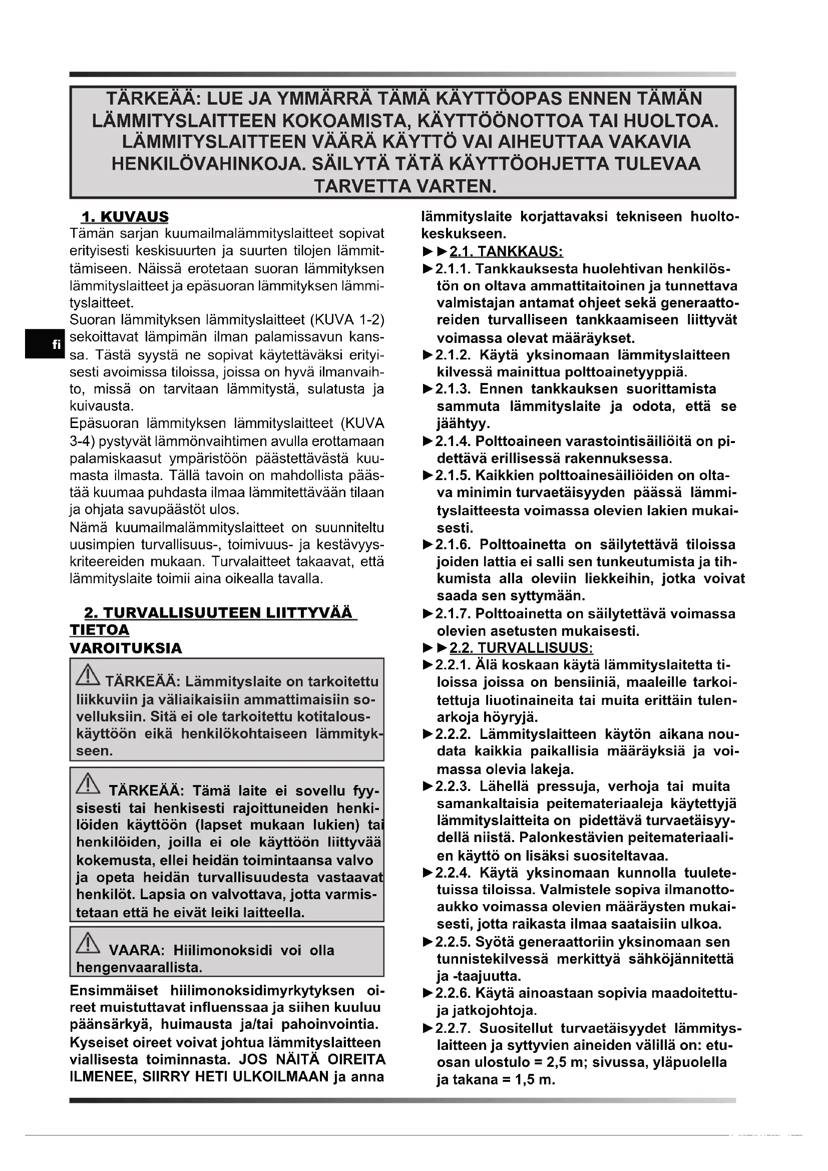 TIETOA VAROITUKSIA TÄRKEÄÄ: Lämmityslaite on tarkoitettu liikkuviin ja väliaikaisiin ammattimaisiin so- velluksiin. Sitä ei ole tarkoitettu kotitalous- käyttöön eikä henkilökohtaiseen lämmityk- seen. TÄRKEÄÄ: Tämä laite ei sovellu fyy- sisesti tai henkisesti rajoittuneiden henki- löiden käyttöön (lapset mukaan lukien) tai henkilöiden, joilla ei ole käyttöön liittyvää kokemusta, ellei heidän toimintaansa valvo ja opeta heidän turvallisuudesta vastaavat henkilöt. Lapsia on valvottava, jotta varmis- tetaan että he eivät leiki laitteella. VAARA: Hiilimonoksidi voi olla hengenvaarallista. Ensimmäiset hiilimonoksidimyrkytyksen oi- reet muistuttavat inuenssaa ja siihen kuuluu päänsärkyä, huimausta ja/tai pahoinvointia. Kyseiset oireet voivat johtua lämmityslaitteen viallisesta toiminnasta. JOS NÄITÄ OIREITA ILMENEE, SIIRRY HETI ULKOILMAAN ja anna lämmityslaite korjattavaksi tekniseen huolto- keskukseen. ►►2.1. TANKKAUS: ►2.1.1. Tankkauksesta huolehtivan henkilös- tön on oltava ammattitaitoinen ja tunnettava valmistajan antamat ohjeet sekä generaatto- reiden turvalliseen tankkaamiseen liittyvät voimassa olevat määräykset. ►2.1.2. Käytä yksinomaan lämmityslaitteen kilvessä mainittua polttoainetyyppiä. ►2.1.3. Ennen tankkauksen suorittamista sammuta lämmityslaite ja odota, että se jäähtyy. ►2.1.4. Polttoaineen varastointisäiliöitä on pi- dettävä erillisessä rakennuksessa. ►2.1.5. Kaikkien polttoainesäiliöiden on olta- va minimin turvaetäisyyden päässä lämmi- tyslaitteesta voimassa olevien lakien mukai- sesti. ►2.1.6. Polttoainetta on säilytettävä tiloissa joiden lattia ei salli sen tunkeutumista ja tih- kumista alla oleviin liekkeihin, jotka voivat saada sen syttymään. ►2.1.7. Polttoainetta on säilytettävä voimassa olevien asetusten mukaisesti. ►►2.2. TURVALLISUUS: ►2.2.1. Älä koskaan käytä lämmityslaitetta ti- loissa joissa on bensiiniä, maaleille tarkoi- tettuja liuotinaineita tai muita erittäin tulen- arkoja höyryjä. ►2.2.2. Lämmityslaitteen käytön aikana nou- data kaikkia paikallisia määräyksiä ja voi- massa olevia lakeja. ►2.2.3. Lähellä pressuja, verhoja tai muita samankaltaisia peitemateriaaleja käytettyjä lämmityslaitteita on pidettävä turvaetäisyy- dellä niistä. Palonkestävien peitemateriaali- en käyttö on lisäksi suositeltavaa. ►2.2.4. Käytä yksinomaan kunnolla tuulete- tuissa tiloissa. Valmistele sopiva ilmanotto- aukko voimassa olevien määräysten mukai- sesti, jotta raikasta ilmaa saataisiin ulkoa. ►2.2.5. Syötä generaattoriin yksinomaan sen tunnistekilvessä merkittyä sähköjännitettä ja -taajuutta. ►2.2.6. Käytä ainoastaan sopivia maadoitettu- ja jatkojohtoja. ►2.2.7. Suositellut turvaetäisyydet lämmitys- laitteen ja syttyvien aineiden välillä on: etu- osan ulostulo = 2,5 m; sivussa, yläpuolella ja takana = 1,5 m.en