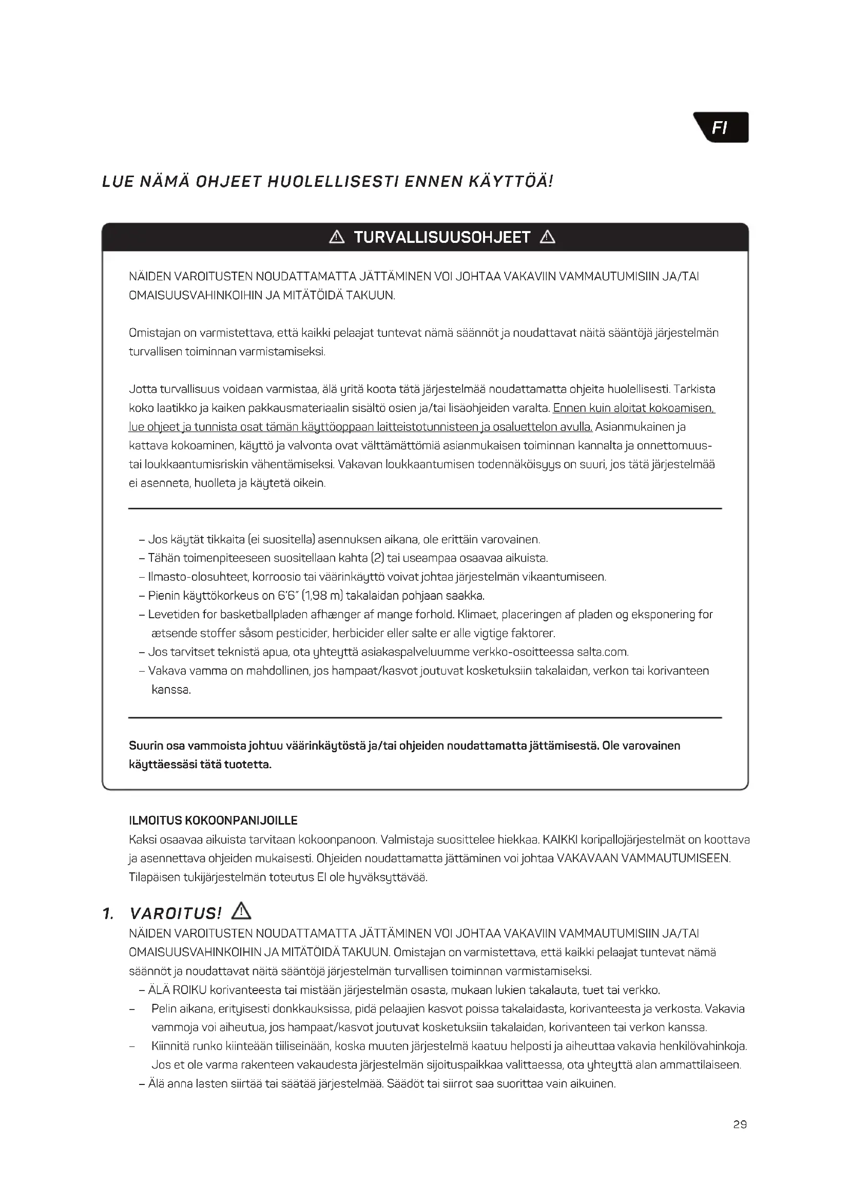 NÄIDEN VAROITUSTEN NOUDATTAMATTA JÄTTÄMINEN VOI JOHTAA VAKAVIIN VAMMAUTUMISIIN JA/TAI OMAISUUSVAHINKOIHIN JA MITÄTÖIDÄ TAKUUN. Omistajan on varmistettava, että kaikki pelaajat tuntevat nämä säännöt ja noudattavat näitä sääntöjä järjestelmän turvallisen toiminnan varmistamiseksi. – ÄLÄ ROIKU korivanteesta tai mistään järjestelmän osasta, mukaan lukien takalauta, tuet tai verkko. – Pelin aikana, erityisesti donkkauksissa, pidä pelaajien kasvot poissa takalaidasta, korivanteesta ja verkosta. Vakavia vammoja voi aiheutua, jos hampaat/kasvot joutuvat kosketuksiin takalaidan, korivanteen tai verkon kanssa. – Kiinnitä runko kiinteään tiiliseinään, koska muuten järjestelmä kaatuu helposti ja aiheuttaa vakavia henkilövahinkoja. Jos et ole varma rakenteen vakaudesta järjestelmän sijoituspaikkaa valittaessa, ota yhteyttä alan ammattilaiseen. – Älä anna lasten siirtää tai säätää järjestelmää. Säädöt tai siirrot saa suorittaa vain aikuinen. !30