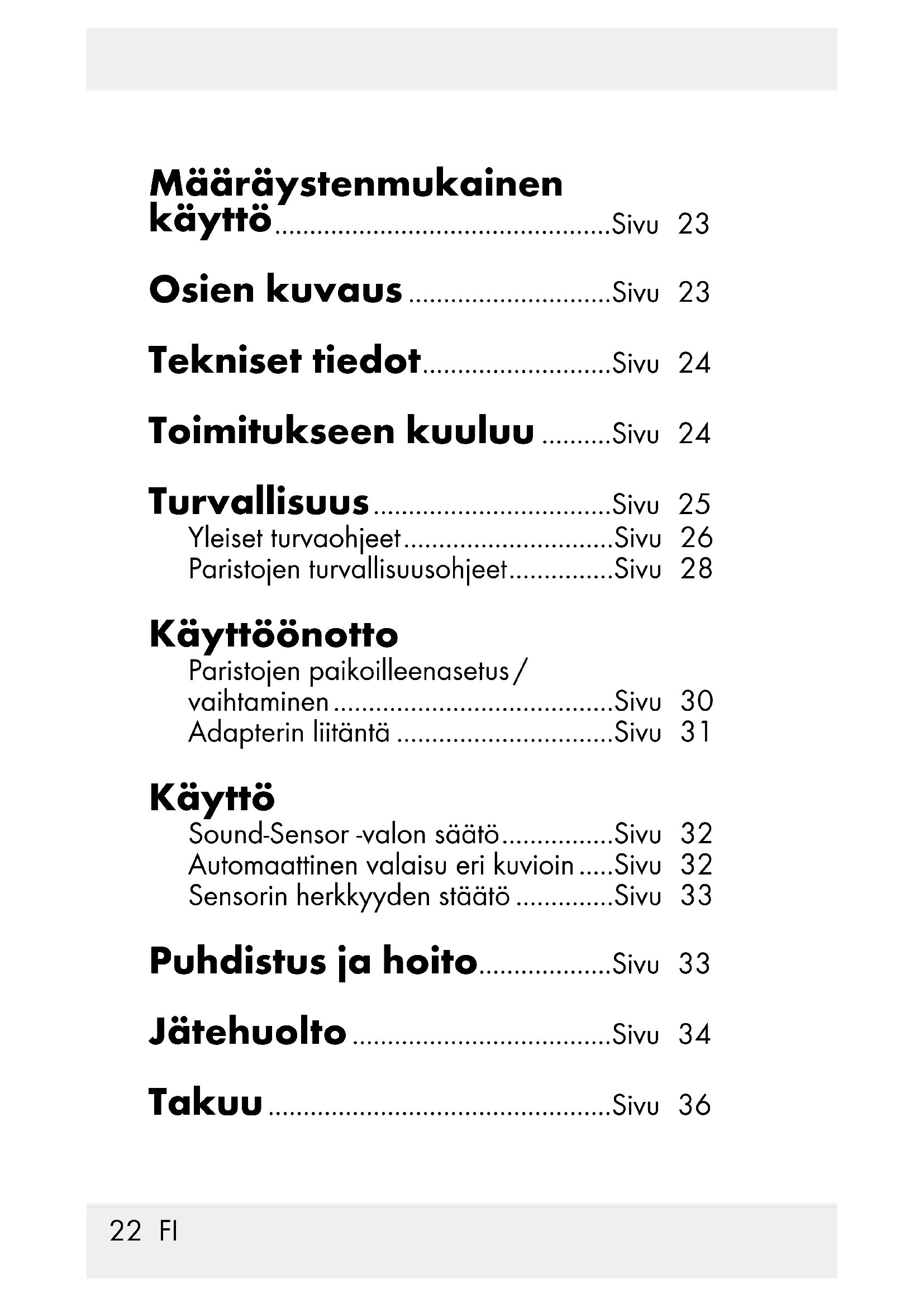 Puhdistus ja hoito Älä missään tapauksessa käytä nesteitä tai puhdistusaineita, sillä ne vioittavat laitetta. j Puhdista laite vain ulkopuolelta pehmeällä, kuivalla kankaalla. j Poista paristot, jos sound-sensor on pois käytöstä.34 FI