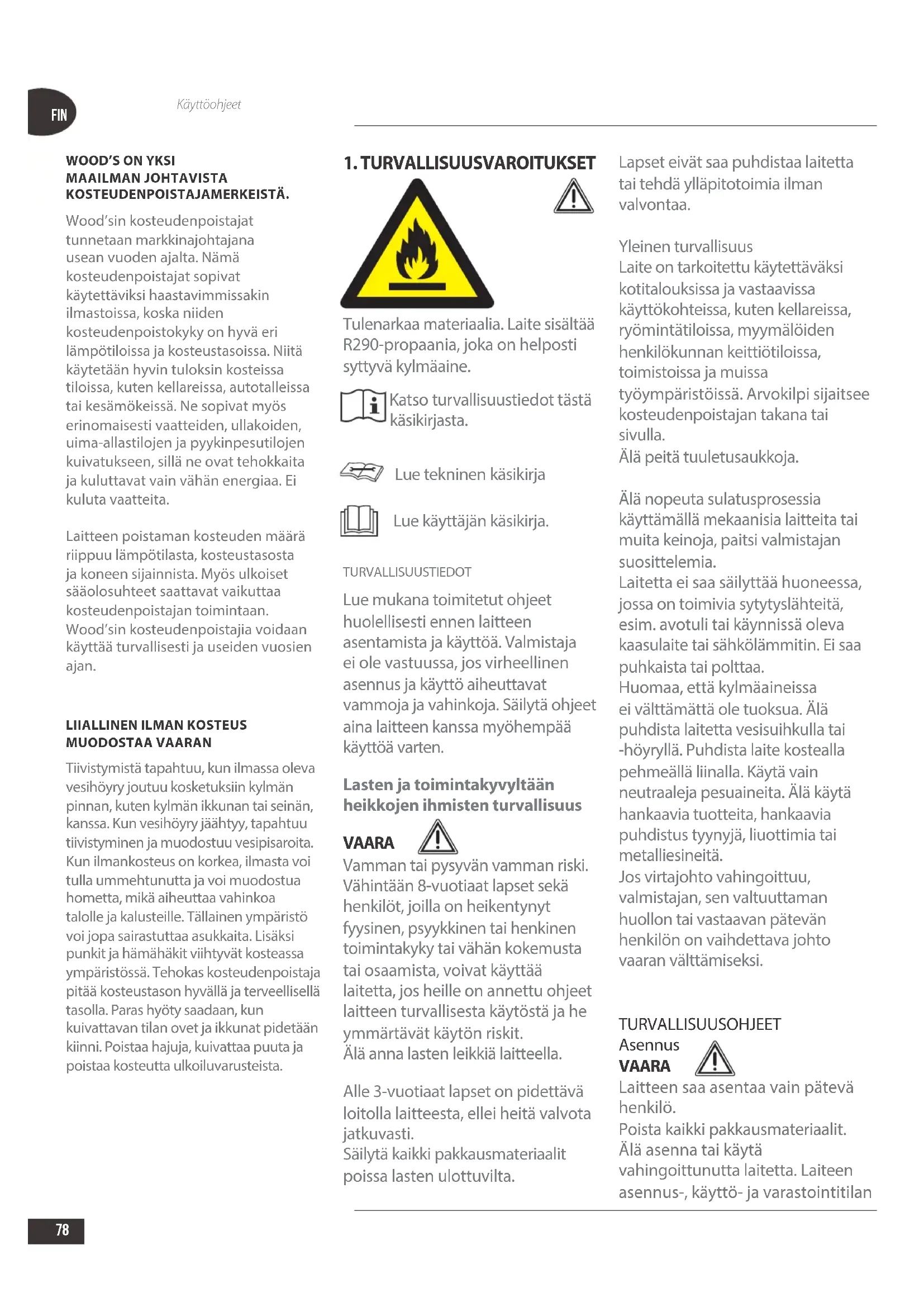 Tulenarkaa materiaalia. Laite sisältää R290-propaania, joka on helposti syttyvä kylmäaine. Katso turvallisuustiedot tästä käsikirjasta. Lue tekninen käsikirja Lue käyttäjän käsikirja. TURVALLISUUSTIEDOT Lue mukana toimitetut ohjeet huolellisesti ennen laitteen asentamista ja käyttöä. Valmistaja ei ole vastuussa, jos virheellinen asennus ja käyttö aiheuttavat vammoja ja vahinkoja. Säilytä ohjeet aina laitteen kanssa myöhempää käyttöä varten. Lasten ja toimintakyvyltään heikkojen ihmisten turvallisuus VAARA Vamman tai pysyvän vamman riski. Vähintään 8-vuotiaat lapset sekä henkilöt, joilla on heikentynyt fyysinen, psyykkinen tai henkinen toimintakyky tai vähän kokemusta tai osaamista, voivat käyttää laitetta, jos heille on annettu ohjeet laitteen turvallisesta käytöstä ja he ymmärtävät käytön riskit. Älä anna lasten leikkiä laitteella. Alle 3-vuotiaat lapset on pidettävä loitolla laitteesta, ellei heitä valvota jatkuvasti. Säilytä kaikki pakkausmateriaalit poissa lasten ulottuvilta. Lapset eivät saa puhdistaa laitetta tai tehdä ylläpitotoimia ilman valvontaa. Yleinen turvallisuus Laite on tarkoitettu käytettäväksi kotitalouksissa ja vastaavissa käyttökohteissa, kuten kellareissa, ryömintätiloissa, myymälöiden henkilökunnan keittiötiloissa, toimistoissa ja muissa työympäristöissä. Arvokilpi sijaitsee kosteudenpoistajan takana tai sivulla. Älä peitä tuuletusaukkoja. Älä nopeuta sulatusprosessia käyttämällä mekaanisia laitteita tai muita keinoja, paitsi valmistajan suosittelemia. Laitetta ei saa säilyttää huoneessa, jossa on toimivia sytytyslähteitä, esim. avotuli tai käynnissä oleva kaasulaite tai sähkölämmitin. Ei saa puhkaista tai polttaa. Huomaa, että kylmäaineissa ei välttämättä ole tuoksua. Älä puhdista laitetta vesisuihkulla tai -höyryllä. Puhdista laite kostealla pehmeällä liinalla. Käytä vain neutraaleja pesuaineita. Älä käytä hankaavia tuotteita, hankaavia puhdistus tyynyjä, liuottimia tai metalliesineitä. Jos virtajohto vahingoittuu, valmistajan, sen valtuuttaman huollon tai vastaavan pätevän henkilön on vaihdettava johto vaaran välttämiseksi. TURVALLISUUSOHJEET Asennus VAARA Laitteen saa asentaa vain pätevä henkilö. Poista kaikki pakkausmateriaalit. Älä asenna tai käytä vahingoittunutta laitetta. Laiteen asennus-, käyttö- ja varastointitilanFIN Käyttöohjeet