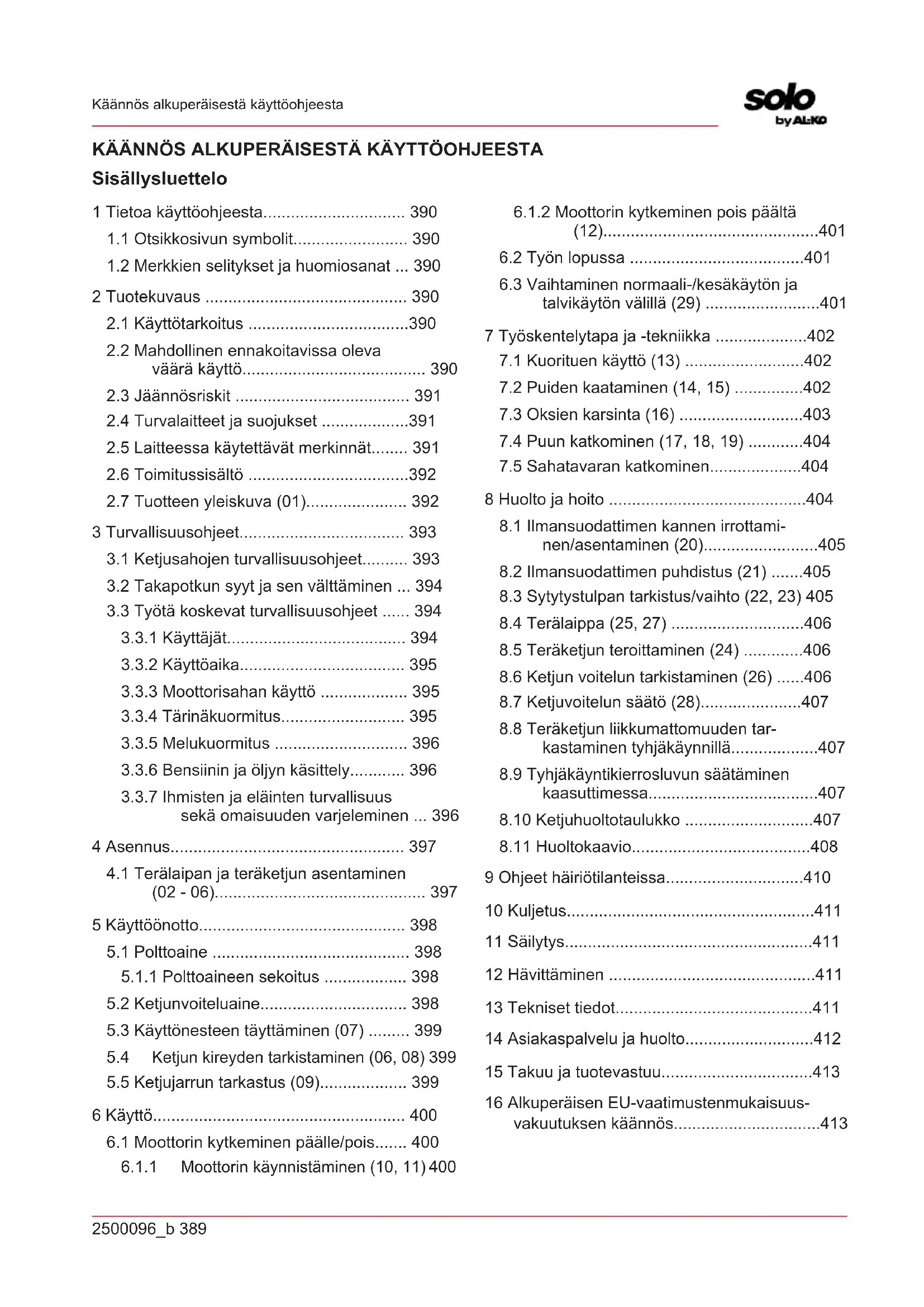 3.1 Ketjusahojen turvallisuusohjeet.......... 393