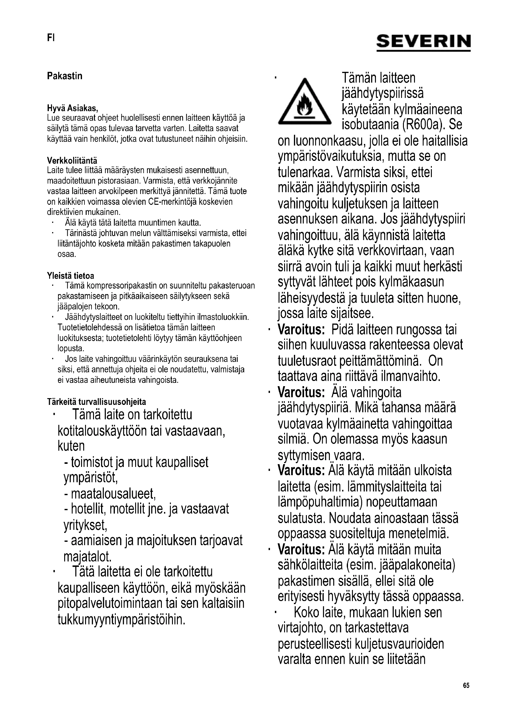 Tämän laitteen jäähdytyspiirissä käytetään kylmäaineena isobutaania (R600a). Se on luonnonkaasu, jolla ei ole haitallisia ympäristövaikutuksia, mutta se on tulenarkaa. Varmista siksi, ettei mikään jäähdytyspiirin osista vahingoitu kuljetuksen ja laitteen asennuksen aikana. Jos jäähdytyspiiri vahingoittuu, älä käynnistä laitetta äläkä kytke sitä verkkovirtaan, vaan siirrä avoin tuli ja kaikki muut herkästi syttyvät lähteet pois kylmäkaasun läheisyydestä ja tuuleta sitten huone, jossa laite sijaitsee. ∙ Varoitus: Pidä laitteen rungossa tai siihen kuuluvassa rakenteessa olevat tuuletusraot peittämättöminä. On taattava aina riittävä ilmanvaihto. ∙ Varoitus: Älä vahingoita jäähdytyspiiriä. Mikä tahansa määrä vuotavaa kylmäainetta vahingoittaa silmiä. On olemassa myös kaasun syttymisen vaara. ∙ Varoitus: Älä käytä mitään ulkoista laitetta (esim. lämmityslaitteita tai lämpöpuhaltimia) nopeuttamaan sulatusta. Noudata ainoastaan tässä oppaassa suositeltuja menetelmiä. ∙ Varoitus: Älä käytä mitään muita sähkölaitteita (esim. jääpalakoneita) pakastimen sisällä, ellei sitä ole erityisesti hyväksytty tässä oppaassa. ∙ Koko laite, mukaan lukien sen virtajohto, on tarkastettava perusteellisesti kuljetusvaurioiden varalta ennen kuin se liitetään66 142 x 208 mm verkkovirtaan. Mikäli tällainen vaurio löytyy, laitetta ei saa liittää verkkovirtaan. ∙ Valittaessa laitteen paikkaa, varmista ettei sähköjohto ole jäänyt kiinni tai vahingoittunut. ∙ Älä sijoita siirrettäviä pistorasioita tai siirrettäviä virtalähteitä laitteen perään. ∙ Tätä laitetta ei ole tarkoitettu räjähdysherkkien aineiden säilytykseen kuten aerosolipurkkien, joissa on tulenarkaa ponneainetta. ∙ Jos laite myydään, annetaan ulkopuoliselle tai hävitetään sopivassa kierrätyslaitoksessa, on kiinnitettävä huomiota eristyskaasuna toimivan syklopentaanin sekä kylmäaineen (R600a) olemassaoloon. Lisätietoa oikein kierrätyksestä on osassa Hävittäminen. ∙ Jotta turvallisuusmääräyksiä noudatetaan ja vaarat vältetään, vain valmistajan valtuuttama huoltohenkilöstö saa tehdä laitteeseen korjauksia tai muutoksia mukaan lukien virtajohdon vaihtamisen. ∙ Tätä laitetta saavat käyttää lapset (vähintään 8-vuotiaat) sekä henkilöt, joilla on fyysisesti, aistillisesti tai henkisesti rajoittunut toimintakyky tai joilla on puuttuvat tai vajavaiset tiedot laitteen toiminnasta, mikäli heitä valvotaan tai ohjataan laitteen käytössä ja he ymmärtävät täysin kaikki käyttöön liittyvät vaarat ja turvatoimenpiteet. ∙ Kolmesta kahdeksaan ikävuoteen olevat lapset saavat täyttää ja tyhjentää jäähdytyslaitteita. ∙ Lasten ei saa antaa leikkiä laitteella. ∙ Lasten ei saa antaa tehdä laitteen puhdistus- tai huoltotoimenpiteitä, elleivät he ole valvonnassa. ∙ Säännölliseen puhdistukseen suosittelemme lämpimän veden ja miedon puhdistusaineen käyttöä. Yksityiskohtaisia tietoja laitteen puhdistuksesta on osassa Sulattaminen ja puhdistus. Välttääksesi ruoan pilaantumisen, noudata seuraavia ohjeita: ∙ Oven avaaminen pitkäksi aikaa voi aiheuttaa huomattavan lämpötilan nousun laitteen lokeroissa. ∙ Siivoa usein pinnat, jotka ovat kosketuksessa ruokaan ja näkyvillä oleviin kuivatusjärjestelmiin. ∙ Jos jäähdyttävä laite jätetään tyhjäksi pitkäksi ajaksi, laita pois päältä, siivoa, kuivata ja jätä ovi auki välttääksesi homeen muodostumisen laitteessa. ∙ Jotta henkilövammojen tai pakastimen vaurioitumisen vaara vältetään, laitetta saadaan kuljettaa ainoastaan sen alkuperäispakkauksessa. Laitteen poistamiseen pakkauksesta sekä asennukseen tarvitaan 2 henkilöä. ∙ Varoitus: Pidä lapset poissa pakkausmateriaalien luota potentiaalisen vaaratilanteen esim. tukehtumisvaaran vuoksi. ∙ Laitteesta sulattamisen aikana poistettu jää ei sovellu ihmisten nautittavaksi. ∙ Virtajohto on tarkistettava säännöllisesti vaurioiden varalta. Jos johdossa on vikaa, laitetta ei saa enää käyttää. ∙ Älä aseta tulipalon vaaran välttämiseksi mitään lämpöä tuottavia sähkölaitteita pakastimen päälle. Älä sijoita mitään nestettä sisältäviä astioita laitteen päälle. Siten estetään nesteiden valuminen tai vuotaminen ja siten sähköeristyksen vaurioituminen. ∙ Tämä laite on tarkoitettu ainoastaan ruoan säilytykseen. ∙ Alkoholipitoisia aineita saadaan säilyttää vain kunnolla suljetuissa pakkauksissa ja pystysuorassa asennossa. ∙ Älä säilytä pakastimessa lasipulloissa mitään hiilihapollisia tai muita pakastuskelpoisia nesteitä: tällaiset pullot voivat haljeta pakastamisen aikana.67 142 x 208 mm ∙ Jotta vältetään ruokamyrkytyksen vaara, älä nauti ruokaa sen säilytysajan umpeutumisen jälkeen. Sulatettuja ruokia ei saa pakastaa uudelleen. ∙ Älä nojaa äläkä kohdista kohtuutonta painoa hyllyihin, osastoihin ja oveen jne. ∙ Suojaa pakastimen sisustaa aina avoimilta liekeiltä ja muilta syttymislähteiltä. ∙ Irrota pistoke seinäpistorasiasta - kun ilmenee mikä tahansa vika. - ennen laitteen sulattamista. - puhdistuksen ajaksi. - ennen huolto- tai korjaustöiden suorittamista. ∙ Kun irrotat pistotulpan pistorasiasta, älä vedä liitäntäjohdosta vaan tartu aina pistotulppaan. ∙ Ellei laitetta käytetä pitkään aikaan, suositellaan sen oven pitämistä auki. ∙ Valmistaja pidättää itsellään oikeuden teknisiin muutoksiin. Rakenne