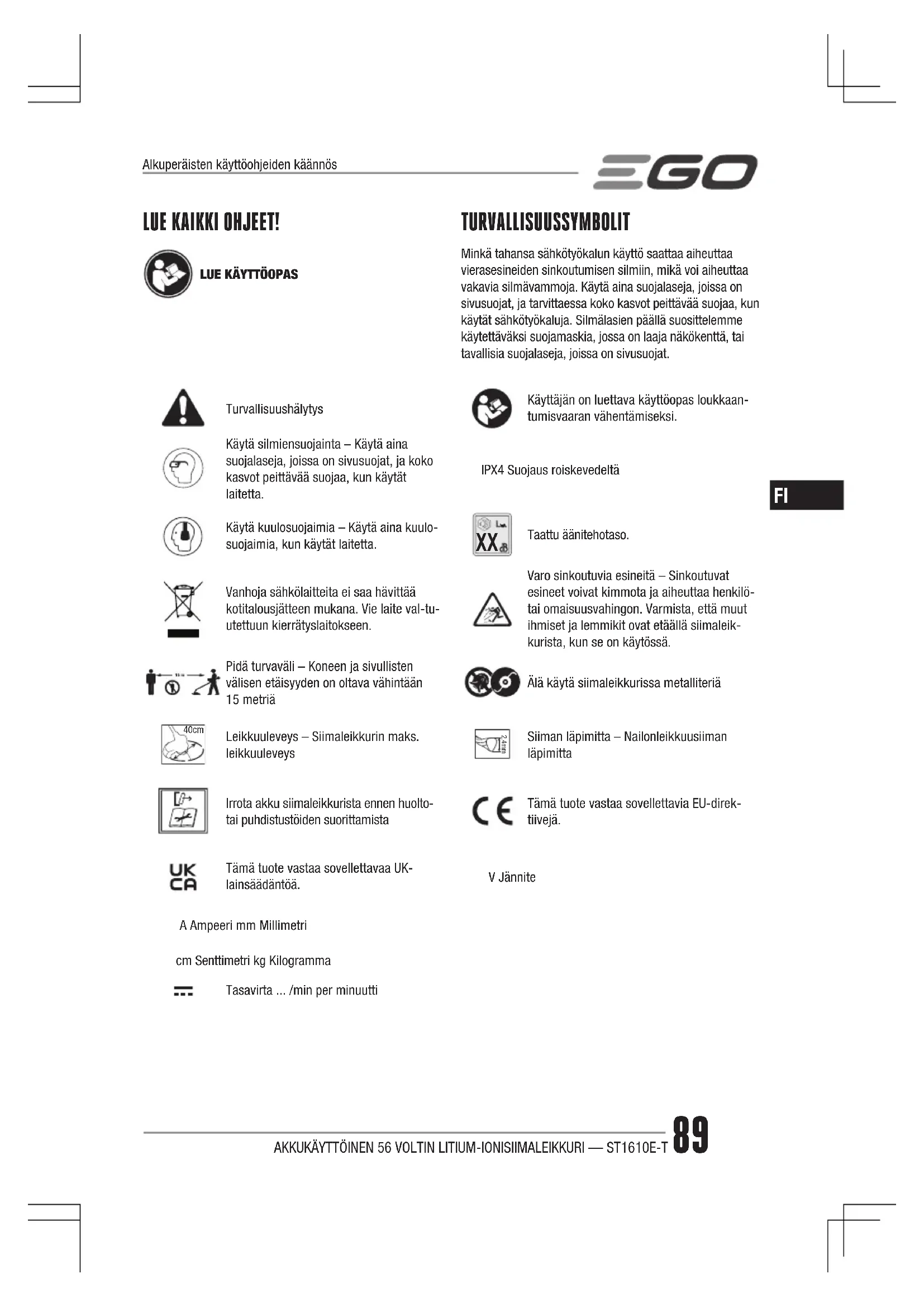 Taattu äänitehotaso.Vanhoja sähkölaitteita ei saa hävittää kotitalousjätteen mukana. Vie laite val-tu-utettuun kierrätyslaitokseen.Varo sinkoutuvia esineitä – Sinkoutuvat esineet voivat kimmota ja aiheuttaa henkilö- tai omaisuusvahingon. Varmista, että muut ihmiset ja lemmikit ovat etäällä siimaleik-kurista, kun se on käytössä.Pidä turvaväli – Koneen ja sivullisten välisen etäisyyden on oltava vähintään 15 metriäÄlä käytä siimaleikkurissa metalliteriä 40cm Leikkuuleveys – Siimaleikkurin maks. leikkuuleveys 2.4mmSiiman läpimitta – Nailonleikkuusiiman läpimittaIrrota akku siimaleikkurista ennen huolto- tai puhdistustöiden suorittamistaTämä tuote vastaa sovellettavia EU-direk-tiivejä.Tämä tuote vastaa sovellettavaa UK-lainsäädäntöä.V JänniteA Ampeeri mm Millimetricm Senttimetri kg KilogrammaTasavirta ... /min per minuuttiAKKUKÄYTTÖINEN 56 VOLTIN LITIUM-IONISIIMALEIKKURI — ST1610E-T90