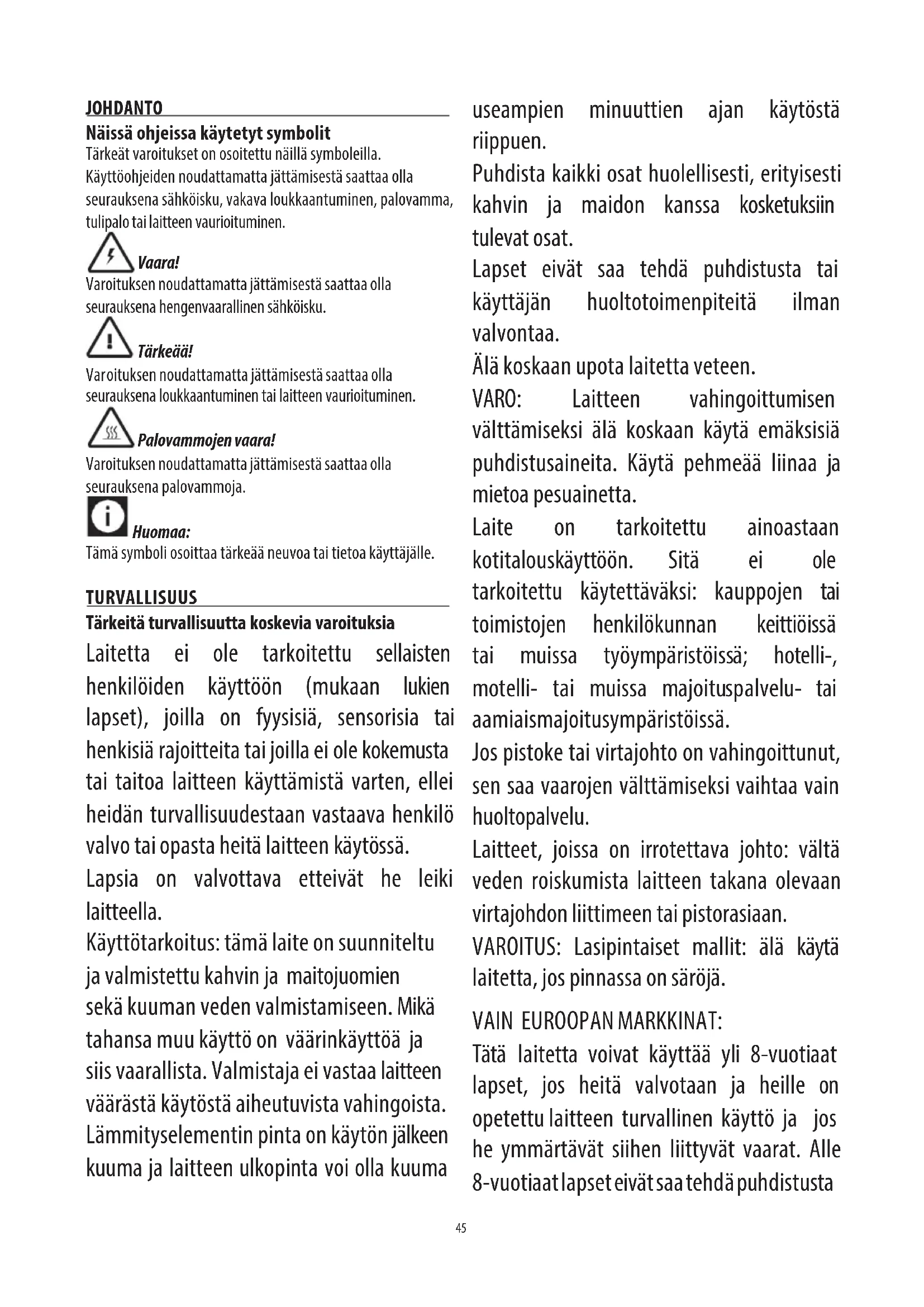 DA45 JOHDANTO Näissä ohjeissa käytetyt symbolit Tärkeät varoitukset on osoitettu näillä symboleilla. Käyttöohjeiden noudattamatta jättämisestä saattaa olla seurauksena sähköisku, vakava loukkaantuminen, palovamma, tulipalo tai laitteen vaurioituminen. Vaara! Varoituksen noudattamatta jättämisestä saattaa olla seurauksena hengenvaarallinen sähköisku. Tärkeää! Var oituksen noudattamatta jättämisestä saattaa olla seurauksena loukkaantuminen tai laitteen vaurioituminen. Palovammojen vaara! Varoituksen noudattamatta jättämisestä saattaa olla seurauksena palovammoja. Huomaa: Tämä symboli osoittaa tärkeää neuvoa tai tietoa käyttäjälle. TURVALLISUUS Tärkeitä turvallisuutta koskevia varoituksia Laitetta ei ole tarkoitettu sellaisten henkilöiden käyttöön (mukaan lukien lapset), joilla on fyysisiä, sensorisia tai henkisiä rajoitteita tai joilla ei ole kokemusta tai taitoa laitteen käyttämistä varten, ellei heidän turvallisuudestaan vastaava henkilö valvo tai opasta heitä laitteen käytössä. Lapsia on valvottava etteivät he leiki laitteella. Käyttötarkoitus: tämä laite on suunniteltu ja valmistettu kahvin ja maitojuomien sekä kuuman veden valmistamiseen. Mikä tahansa muu käyttö on väärinkäyttöä ja siis vaarallista. Valmistaja ei vastaa laitteen väärästä käytöstä aiheutuvista vahingoista. Lämmityselementin pinta on käytön jälkeen kuuma ja laitteen ulkopinta voi olla kuuma useampien minuuttien ajan käytöstä riippuen. Puhdista kaikki osat huolellisesti, erityisesti kahvin ja maidon kanssa kosketuksiin tulevat osat. Lapset eivät saa tehdä puhdistusta tai käyttäjän huoltotoimenpiteitä ilman valvontaa. Älä koskaan upota laitetta veteen. VARO: Laitteen vahingoittumisen välttämiseksi älä koskaan käytä emäksisiä puhdistusaineita. Käytä pehmeää liinaa ja mietoa pesuainetta. Laite on tarkoitettu ainoastaan kotitalouskäyttöön. Sitä ei ole tarkoitettu käytettäväksi: kauppojen tai toimistojen henkilökunnan keittiöissä tai muissa työympäristöissä; hotelli-, motelli- tai muissa majoituspalvelu- tai aamiaismajoitusympäristöissä. Jos pistoke tai virtajohto on vahingoittunut, sen saa vaarojen välttämiseksi vaihtaa vain huoltopalvelu. Laitteet, joissa on irrotettava johto: vältä veden roiskumista laitteen takana olevaan virtajohdon liittimeen tai pistorasiaan. VAROITUS: Lasipintaiset mallit: älä käytä laitetta, jos pinnassa on säröjä. VAIN EUROOPAN MARKKINAT: Tätä laitetta voivat käyttää yli 8-vuotiaat lapset, jos heitä valvotaan ja heille on opetettu laitteen turvallinen käyttö ja jos he ymmärtävät siihen liittyvät vaarat. Alle 8-vuotiaat lapset eivät saa tehdä puhdistusta46 tai käyttäjän huoltotoimenpiteitä ilman valvontaa. Pidä laite ja virtajohto alle 8- vuotiaiden lasten ulottumattomissa. Laitteita ei ole tarkoitettu sellaisten henkilöiden käyttöön, joilla on fyysisiä, sensorisia tai henkisiä rajoitteita tai joilla ei ole kokemusta tai taitoa laitteen turvallista käyttämistä varten, ellei heidän turvallisuudestaan vastaava henkilö valvo tai opasta heitä laitteen käytössä. Lapset eivät saa leikkiä laitteella. Kytke laite aina irti sähköverkosta kun sitä ei käytetä ja ennen sen puhdistamista. Tällä merkillä merkityt pinnat kuumenevat käytön aikana (merkki on vain joissain malleissa). Vaara! Tämä on sähkölaite, joten on tärkeää noudattaa seuraavia turvallisuusvaroituksia: