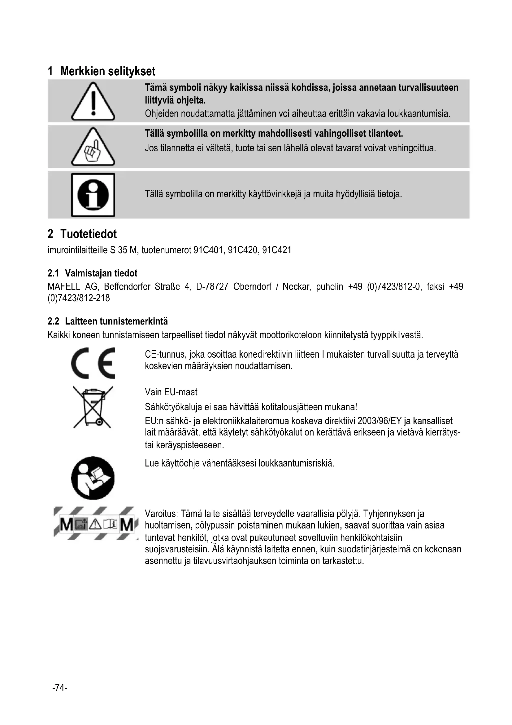 - Laitteen tyyppikilpeen merkityn jännitteen tulee olla sama kuin verkkojännite. - Verkkopistorasia tulee olla varmistettu talossa olevalla oikean kokoisella sulakkeella (16 A).-77- - Älä ota laitetta käyttöön, jos: - Laitteessa on tunnistettavia vahingoittumia (säröjä/murtumia), - Verkkoliitäntäjohto on viallinen tai sen pinnalla on halkeamia tai vanhenemisilmiöitä, - Epäillään, että siinä voi olla sisäinen vika (putoamisen jälkeen). - Älä käytä vahingoittuneita jatkojohtoja. - Älä kohdista suulaketta, letkua tai putkea ihmisiin tai eläimiin. - Erityistä varovaisuutta tarvitaan portaita imuroitaessa. Varmista, että seisonta-asentosi on tukeva. - Laitteessa olevaa pistorasiaa saa käyttää vain käyttöohjeessa annettuihin tarkoituksiin. - Älä koskaan työskentele ilman määräysten mukaisia turvalaitteita äläkä muuta laitteessa mitään, millä olisi vaikutusta turvallisuuteen. - Jos laitetta käytetään ulkona, suosittelemme vuotovirtakytkimen asentamista. - Vialliset johdot ja pistokkeet on vaihdettava heti uusiin. Vaihdon saa tehdä vain Mafell tai valtuutettu MAFELL-asiakaspalveluverstas, turvallisuuteen liittyvien vaarannuksien välttämiseksi. - Lapset ja nuoret eivät saa käyttää tätä laitetta. Tästä poikkeuksena ovat asiantuntevan henkilön valvonnassa olevat nuoret. - Kytke laite pois päältä ennen jokaista huoltoa ja jokaisen käytön jälkeen ja vedä verkkopistoke irti pistorasiasta. - Tarkasta ennen jokaista työtä, ovatko imuletkut kunnolla kiinnitetty ja, että ne eivät ole vahingoittuneet. - Älä vedä pistoketta irti pistorasiasta kaapelista vetämällä. - Vedä verkkopistoke irti pistorasiasta ennen laitteen puhdistamista, tyhjentämistä tai häiriöiden poistamista. - Huolehdi siitä, että kaapeli on suojattuna öljyltä ja kuumuudelta eikä tule vahingoitetuksi ylitse ajamalla, puristamalla, vetäisemällä tai muulla sellaisella. - Ota huomioon ympäristövaikutukset. Älä aseta laitetta alttiiksi sateelle jä vältä työskentelyä palonarkojen nesteiden ja kaasujen läheisyydessä. - Säilytä laitetta kuivissa ja suljetuissa tiloissa, poissa lasten ulottuvilta. - Laitteen säännöllinen puhdistus on tärkeä turvallisuustekijä. Vedä ennen näiden töiden aloittamista verkkopistoke irti. - Laite tulee asettaa tasaiselle alustalle siten, että se ei voi kaatua tai vieriä pois (lukitse kääntyvät pyörät). - Puhdistetun ilman saa johtaa takaisin vain niihin työtiloihin, joista ilma on imuroitu; s.o. sähkötyökalua ja imurointilaitetta saa käyttää vain samassa työtilassa. - Kytke laite heti pois päältä, jos siitä tulee vaahtoa tai vettä. Tyhjennä säiliö ja tarvittaessa poimusuodatin. - Hapot, asetoni ja liuotinaineet voivat syövyttää laitteen osia. - Älä jätä laitetta ilman valvontaa. Jos työtauko on pitempi, irrota verkkopistoke pistorasiasta. - Jos laitteen verkkoliitäntäjohto vahingoittuu, se on korvattava valmistajalta tai hänen asiakaspalvelultaan saatavalla liitäntäjohdolla. - Anna vain ammattilaisten suorittaa laitteen korjaukset, esim. asiakaspalvelu. Ilman ammattitaito korjatut laitteen vaarantavat käyttäjän turvallisuuden. - Käytä vain alkuoeräisiä MAFELL-vara-, varuste- ja lisävarusteosia. Muuten valmistajan takuu ja vastuu raukeaa.-78- 4 Varustus / säädöt