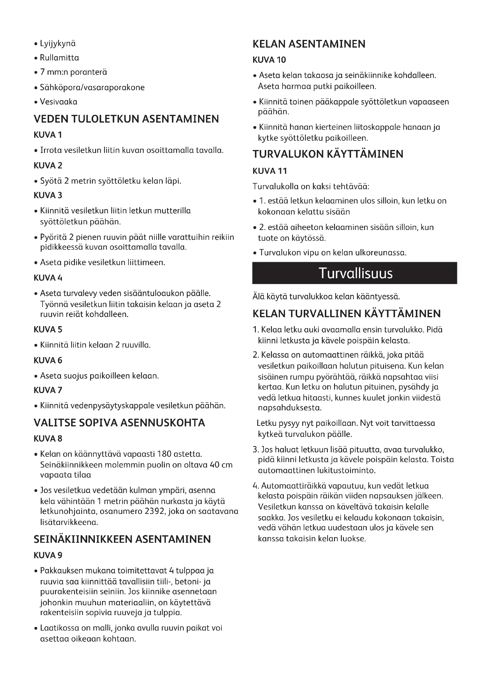 kelasta poispäin räikän viiden napsauksen jälkeen. Vesiletkun kanssa on käveltävä takaisin kelalle saakka. Jos vesiletku ei kelaudu kokonaan takaisin, vedä vähän letkua uudestaan ulos ja kävele sen kanssa takaisin kelan luokse.Varoitus! ÄLÄ TEE NÄIN: Älä päästä irti letkusta, kun se kelautuu takaisin. Älä päästä irti letkusta, jos automaattiräikkä ei napsahda paikoilleen. Älä yritä irrottaa kotelon ruuveja. TEE NÄIN: Estä pakkasvauriot irrottamalla kela seinästä talven ajaksi. Estä mahdollinen liukastuminen pitämällä kelan alla oleva maa mahdollisimman kuivana. Sulje hana, kun se ei ole käytössä. Jotta Auto Reelinne ei vahingoittuisi talvisäilytyksen aikana suosittelemme, että tyhjennätte letkuun jääneen veden. Letkun tyhjentäminen onnistuu seuraavien ohjeiden avulla: