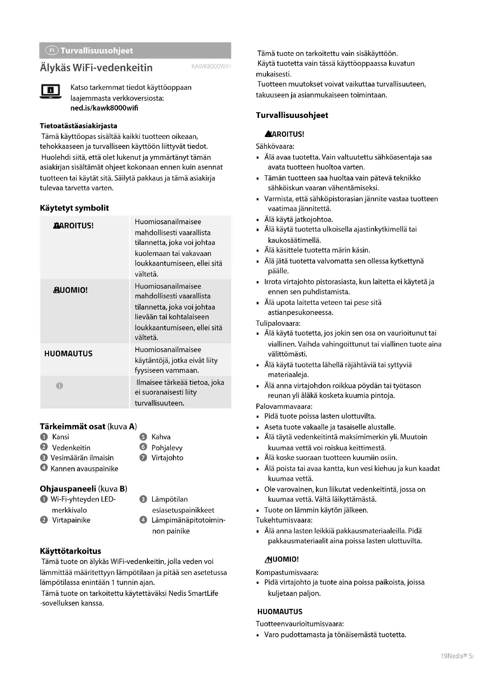Turvallisuusohjeet Älykäs WiFi-vedenkeitin KAWK8000WIFI Katso tarkemmat tiedot käyttöoppaan laajemmasta verkkoversiosta: ned.is/kawk8000wi Tietoa tästä asiakirjasta Tämä käyttöopas sisältää kaikki tuotteen oikeaan, tehokkaaseen ja turvalliseen käyttöön liittyvät tiedot. Huolehdi siitä, että olet lukenut ja ymmärtänyt tämän asiakirjan sisältämät ohjeet kokonaan ennen kuin asennat tuotteen tai käytät sitä. Säilytä pakkaus ja tämä asiakirja tulevaa tarvetta varten. Käytetyt symbolit VAROITUS! Huomiosana ilmaisee mahdollisesti vaarallista tilannetta, joka voi johtaa kuolemaan tai vakavaan loukkaantumiseen, ellei sitä vältetä. 1 HUOMIO! Huomiosana ilmaisee mahdollisesti vaarallista tilannetta, joka voi johtaa lievään tai kohtalaiseen loukkaantumiseen, ellei sitä vältetä. HUOMAUTUS Huomiosana ilmaisee käytäntöjä, jotka eivät liity fyysiseen vammaan. Ilmaisee tärkeää tietoa, joka ei suoranaisesti liity turvallisuuteen. Tärkeimmät osat (kuva A)
