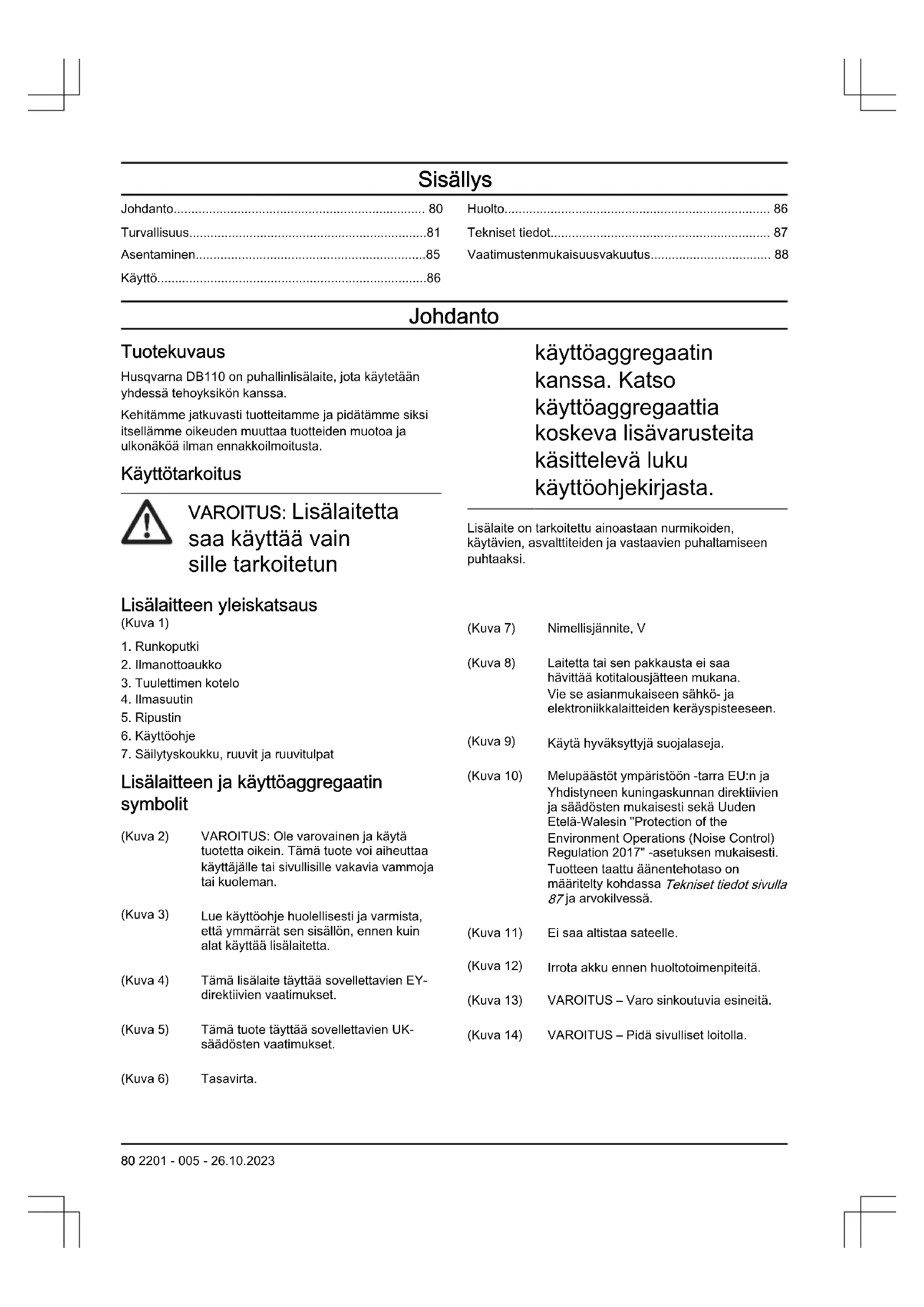 - 55014-1:2021, EN IEC 55014-2:2021. Vastavalt direktiivile 2000/14/EÜ, V lisa, vt jaotist Tehnilised andmed lk 78 deklareeritud heliväärtuste kohta teabe saamiseks. Huskvarna, 2023-08-15 Claes Losdal, Husqvarna AB uurimis- ja arendusjuht Tehnilise dokumentatsiooni eest vastutaja 2201 - 005 - 26.10.2023 79Sisällys Johdanto p. 80
