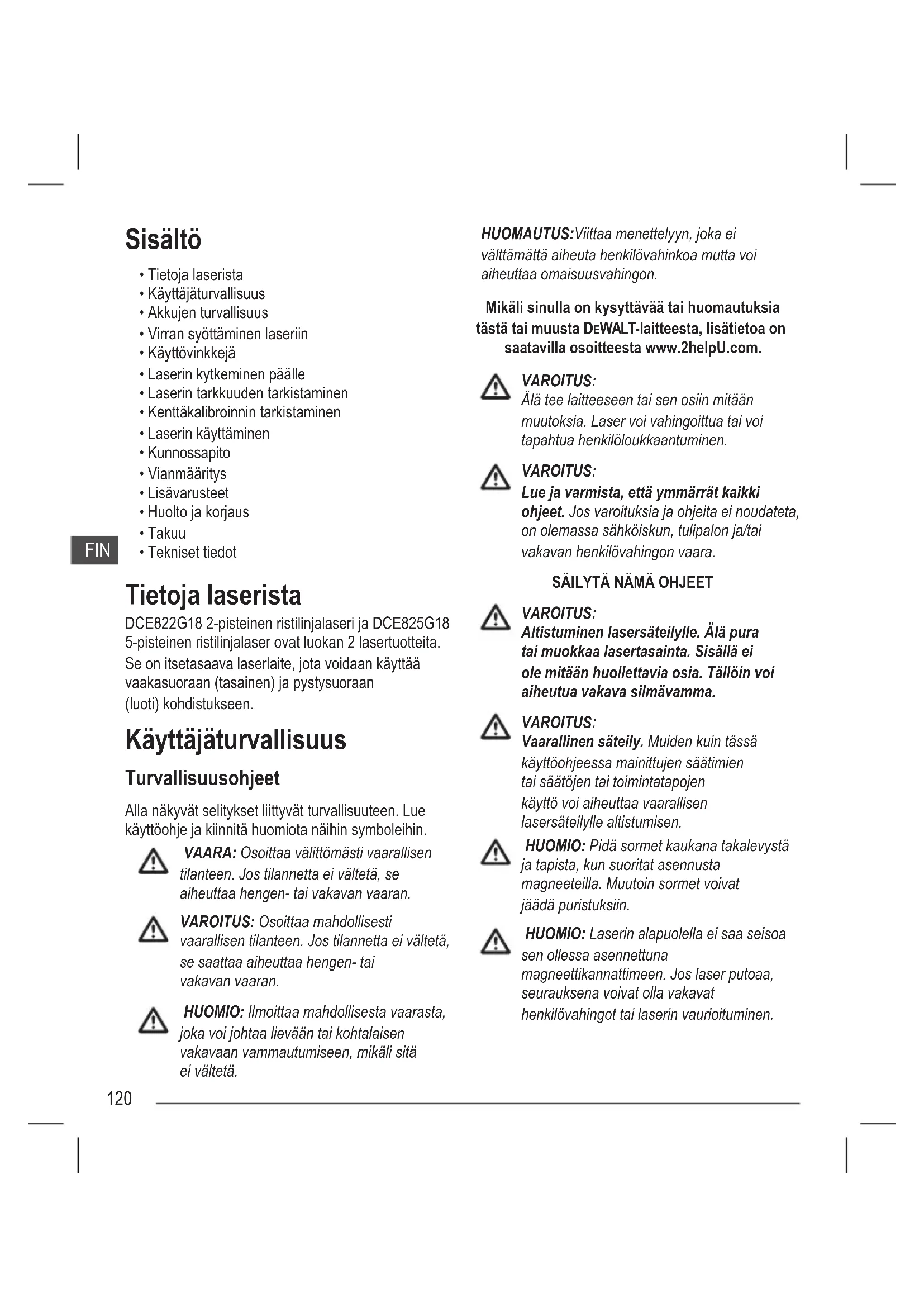 - Tekniset tiedot Tietoja laserista DCE822G18 2-pisteinen ristilinjalaseri ja DCE825G18 5-pisteinen ristilinjalaser ovat luokan 2 lasertuotteita. Se on itsetasaava laserlaite, jota voidaan käyttää vaakasuoraan (tasainen) ja pystysuoraan (luoti) kohdistukseen. Käyttäjäturvallisuus Turvallisuusohjeet Alla näkyvät selitykset liittyvät turvallisuuteen. Lue käyttöohje ja kiinnitä huomiota näihin symboleihin. VAARA: Osoittaa välittömästi vaarallisen tilanteen. Jos tilannetta ei vältetä, se aiheuttaa hengen- tai vakavan vaaran. VAROITUS: Osoittaa mahdollisesti vaarallisen tilanteen. Jos tilannetta ei vältetä, se saattaa aiheuttaa hengen- tai vakavan vaaran. HUOMIO: Ilmoittaa mahdollisesta vaarasta, joka voi johtaa lievään tai kohtalaisen vakavaan vammautumiseen, mikäli sitä ei vältetä. HUOMAUTUS: Viittaa menettelyyn, joka ei välttämättä aiheuta henkilövahinkoa mutta voi aiheuttaa omaisuusvahingon. Mikäli sinulla on kysyttävää tai huomautuksia tästä tai muusta DEWALT-laitteesta, lisätietoa on saatavilla osoitteesta www.2helpU.com. VAROITUS: Älä tee laitteeseen tai sen osiin mitään muutoksia. Laser voi vahingoittua tai voi tapahtua henkilöloukkaantuminen. VAROITUS: Lue ja varmista, että ymmärrät kaikki ohjeet. Jos varoituksia ja ohjeita ei noudateta, on olemassa sähköiskun, tulipalon ja/tai vakavan henkilövahingon vaara.