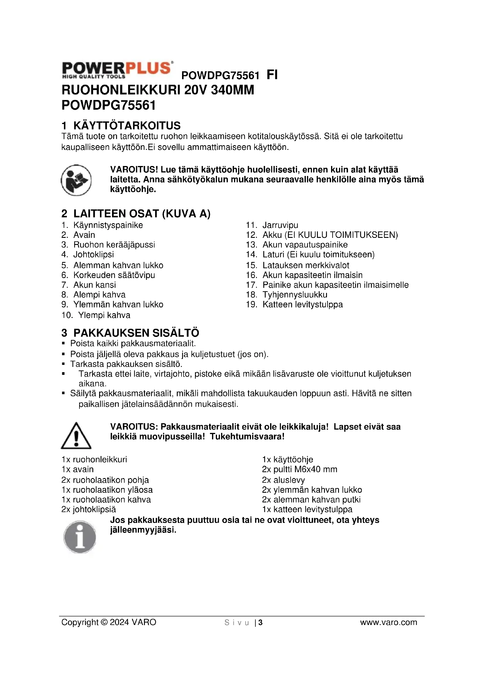 - Vaihda kuluneet tai vaurioituneet osat turvallisuuden varmistamiseksi. Käytä vain alkuperäisiä varaosia ja lisävarusteita.POWDPG75561 FI Copyright © 2024 VARO S i v u | 7 www.varo.com