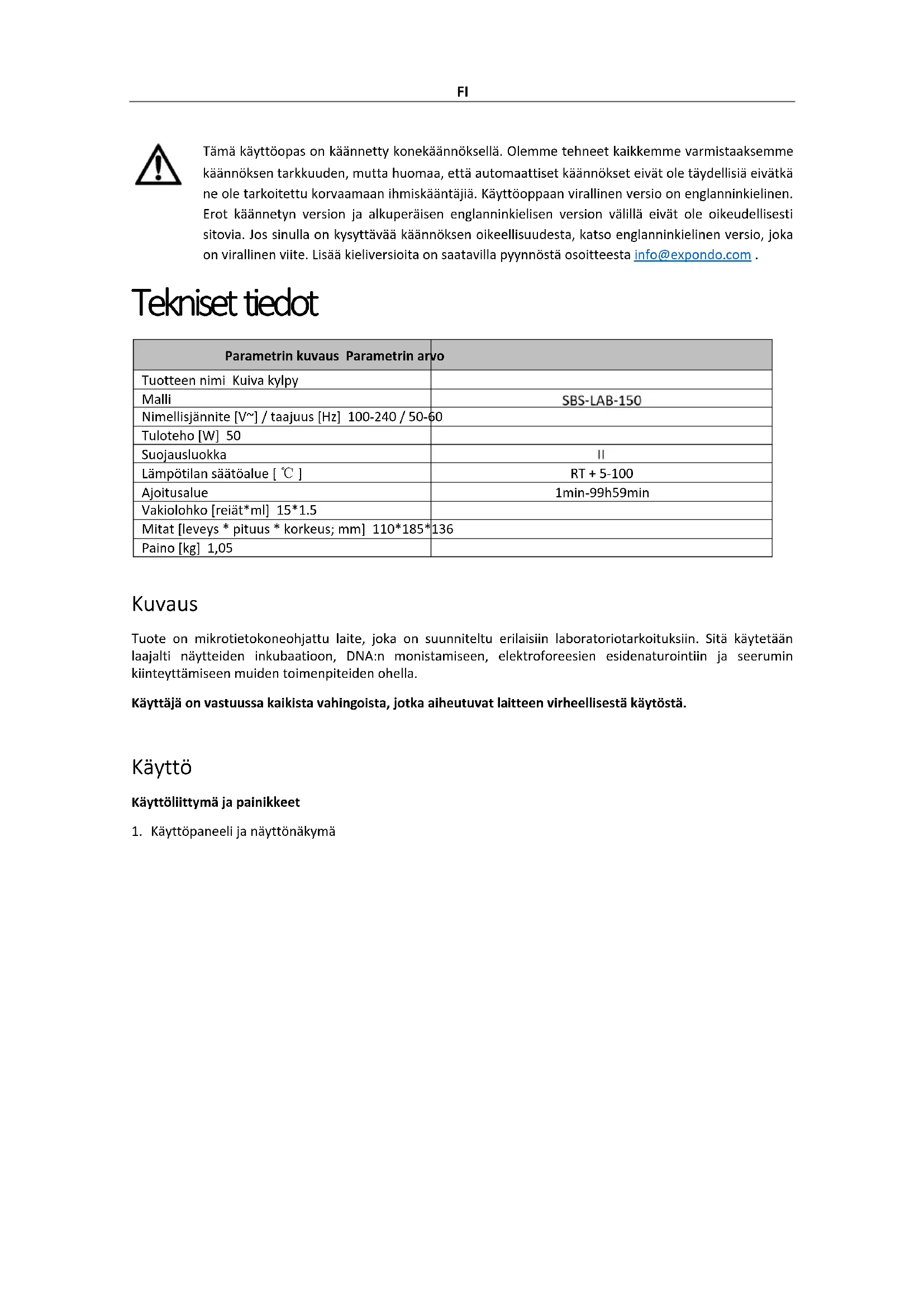 a) Paina -painike yhdistää lämpötilapisteet S1, S2, S3, S4 ja S5 monipisteyhteysohjelmiksi, kuten S1-S2, S1-S2-S3, S1-S2-S3-S4 tai S1-S2-S3 -S4-S5. HUOMIO! Monipisteohjelman lämpötilapiste voi alkaa vain S1:stä. b) Esim. Jos haluat asettaa yhteysohjelman S1-S2-S3-S4:lle, paina -painiketta. Näytössä näkyy nykyinen konfiguraatio, jossa S1 on aloitussolmu (jota ei voi muuttaa) ja S2 on loppusolmu (jota voidaan muokata). Paina -painiketta muuttaaksesi S2:n S4:ksi. Paina sitten - painiketta vahvistaaksesi asetuksen. Solmun kokoonpano näytetään muodossa S1-4, ja ohjelma kulkee S1-S2-S3-S4-sekvenssin läpi. c) Paina painiketta uudelleen suorittaaksesi S1-S2-S3-S4 nelipisteyhteysohjelman.FI Käytä monipisteohjelmaa HUOMIO! Kun olet valinnut päätesolmun, voit painaa -painiketta suorittaaksesi monipisteohjelman suoraan. Puhdistaminen ja huolto Puhdista instrumentin lohkoissa olevat kartiomaiset reiät puhtaalla, pehmeällä liinalla, joka on kostutettu pienellä määrällä vedetöntä alkoholia. Tämä varmistaa täydellisen kosketuksen ja tehokkaan lämmönjohtavuuden koeputken ja kartiomaisten reikien välillä samalla, kun estetään kontaminaatio. Jos instrumentin pinnalle tulee tahroja, puhdista se pehmeällä liinalla ja miedolla puhdistustahnalla. VAROITUS Varmista, että virta on katkaistu ennen laitteen puhdistamista. ÄLÄ päästä puhdistusaineita kapeneviin reikiin puhdistuksen aikana. Vältä syövyttävien puhdistusaineiden käyttöä instrumentin pinnalla. Käytettyjen laitteiden hävittäminen Älä hävitä laitetta yleisen kunnallisen jätehuollon kautta. Luovuta se sähkölaitteiden kierrätykseen erikoistuneeseen keräyspisteeseen. Tarkista tuotteessa, käyttöohjeessa ja pakkauksessa oleva symboli. Laitteen valmistuksessa käytetyt muovit voidaan kierrättää niiden merkintöjen mukaisesti. Kierrättämällä jätteet asianmukaisesti annat merkittävän panoksen ympäristönsuojeluun. Ota yhteyttä paikallisiin viranomaisiin saadaksesi tietoa paikallisista kierrätyslaitoksista.NL Deze gebruikershandleiding is vertaald met behulp van machinevertaling. Wij hebben er alles aan gedaan om ervoor te zorgen dat de vertaling nauwkeurig is, maar houd er rekening mee dat automatische vertalingen niet perfect zijn en niet bedoeld zijn om menselijke vertalers te vervangen. De officiële versie van de gebruikershandleiding is in het Engels. Eventuele verschillen tussen de vertaalde versie en de originele Engelse versie zijn niet juridisch bindend. Als u vragen hebt over de juistheid van de vertaling, raadpleeg dan de Engelse versie; dit is de officiële referentie. Versies in andere talen zijn op aanvraag verkrijgbaar via info@expondo.com . Technische gegevens Beschrijving parameter Waarde parameter Productnaam Droog bad Model Nominale spanning [V~] / frequentie [Hz] 100-240 / 50-60 Ingangsvermogen [W] 50 Beschermingsklasse Temperatuurregelbereik [ ℃ ] RT+ 5-100 Tijdsbereik 1min-99u59min Standaardblok [gaten*ml] 15*1.5 Afmetingen [breedte * lengte * hoogte; mm] 110*185*136 Gewicht [kg] 1,05 Beschrijving Het product is een microcomputergestuurd apparaat dat is ontworpen voor uiteenlopende laboratoriumtoepassingen. Het wordt onder andere veel gebruikt voor monsterincubatie, DNA-amplificatie, elektroforese vóór denaturatie en serumstolling. De gebruiker is aansprakelijk voor alle schade die voortvloeit uit onbedoeld gebruik van het apparaat. Anvendelse Bedieningsinterface en knoppen