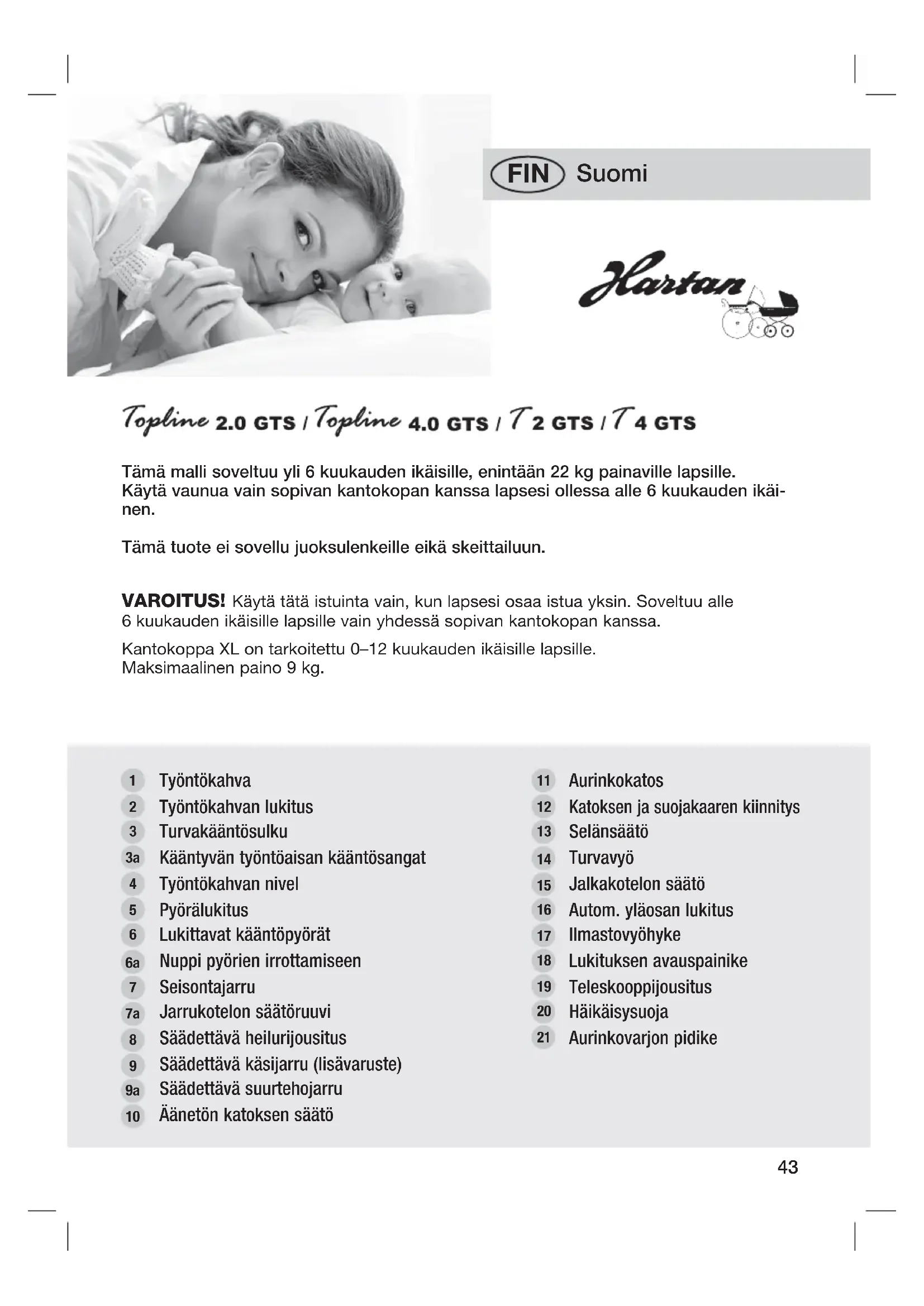Suomi FIN Tämä malli soveltuu yli 6 kuukauden ikäisille, enintään 22 kg painaville lapsille.Käytä vaunua vain sopivan kantokopan kanssa lapsesi ollessa alle 6 kuukauden ikäi- nen. Tämä tuote ei sovellu juoksulenkeille eikä skeittailuun.TyöntökahvaTyöntökahvan lukitusTurvakääntösulkuKääntyvän työntöaisan kääntösangatTyöntökahvan nivelPyörälukitusLukittavat kääntöpyörätNuppi pyörien irrottamiseenSeisontajarruJarrukotelon säätöruuviSäädettävä heilurijousitusSäädettävä käsijarru (lisävaruste)Säädettävä suurtehojarruÄänetön katoksen säätöAurinkokatosKatoksen ja suojakaaren kiinnitysSelänsäätöTurvavyöJalkakotelon säätöAutom. yläosan lukitusIlmastovyöhykeLukituksen avauspainikeTeleskooppijousitusHäikäisysuojaAurinkovarjon pidikeVAROITUS! Käytä tätä istuinta vain, kun lapsesi osaa istua yksin. Soveltuu alle 6kuukauden ikäisille lapsille vain yhdessä sopivan kantokopan kanssa.Kantokoppa XL on tarkoitettu 0–12 kuukauden ikäisille lapsille. Maksimaalinen paino 9 kg.