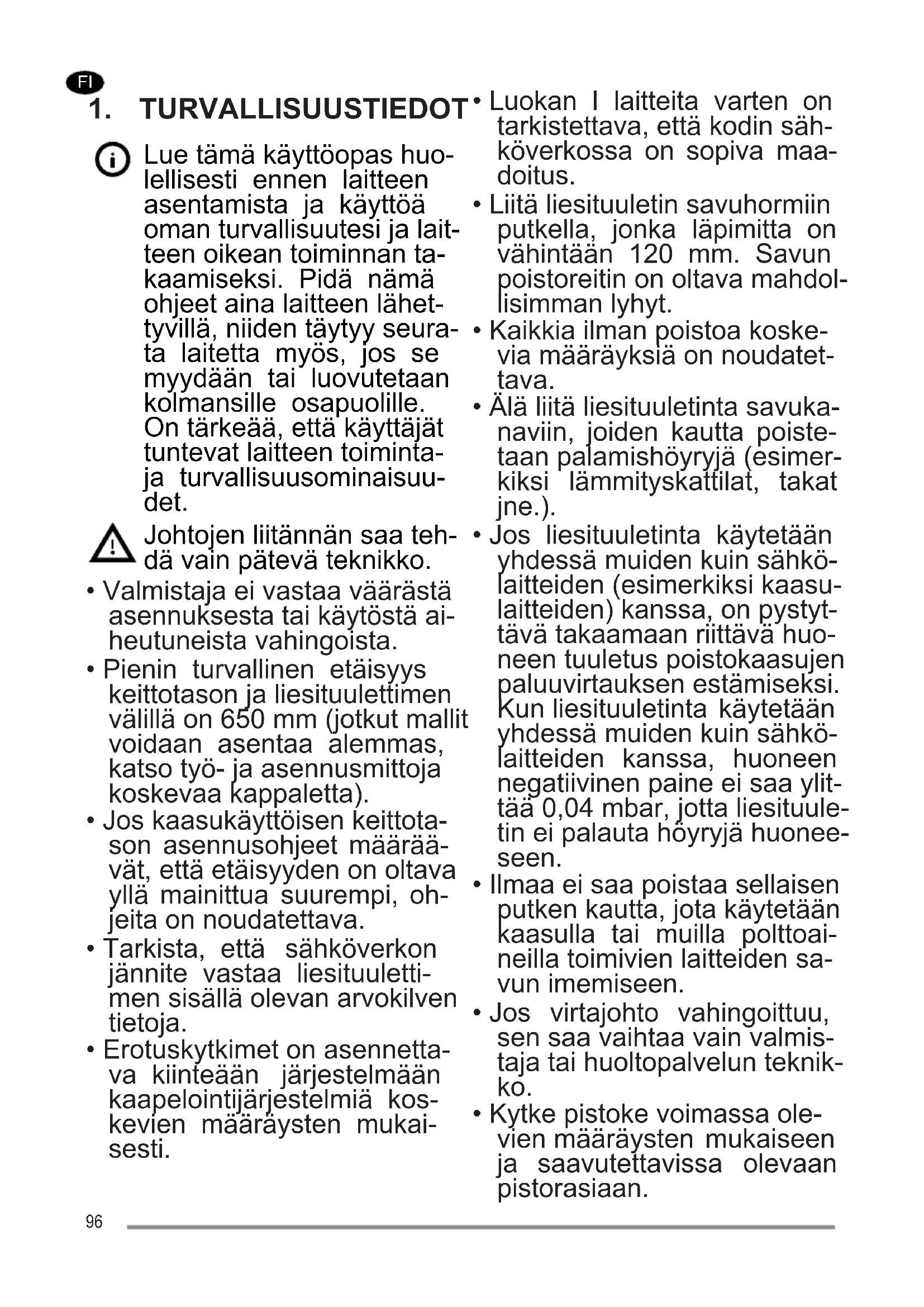 - Jos liesituuletinta käytetään yhdessä muiden kuin sähkö- laitteiden (esimerkiksi kaasu- laitteiden) kanssa, on pystyt- tävä takaamaan riittävä huo- neen tuuletus poistokaasujen paluuvirtauksen estämiseksi. Kun liesituuletinta käytetään yhdessä muiden kuin sähkö- laitteiden kanssa, huoneen negatiivinen paine ei saa ylit- tää 0,04 mbar, jotta liesituule- tin ei palauta höyryjä huonee- seen.