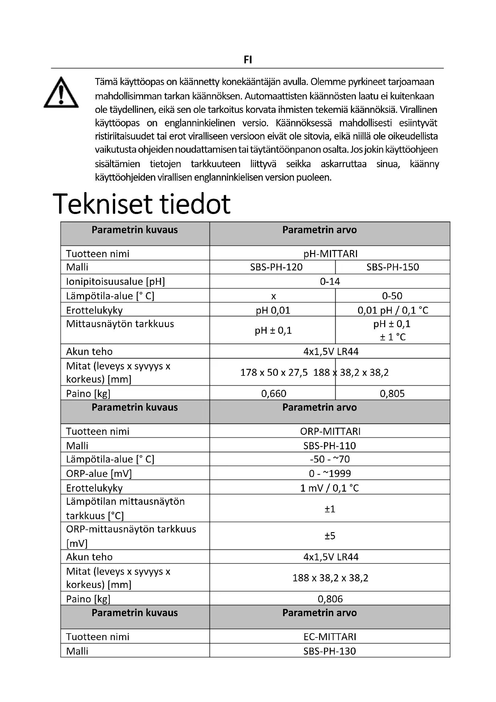 0-50 Erottelukyky pH 0,01 0,01 pH / 0,1 °C Mittausnäytön tarkkuus pH ± 0,1 pH ± 0,1 ± 1 °C Akun teho 4x1,5V LR44 Mitat (leveys x syvyys x korkeus) [mm] 178 x 50 x 27,5 188 x 38,2 x 38,2 Paino [kg] 0,660 0,805 Parametrin kuvaus Parametrin arvo Tuotteen nimi ORP-MITTARI Malli SBS-PH-110 Lämpötila-alue [° C] -50 - ~70 ORP-alue [mV]