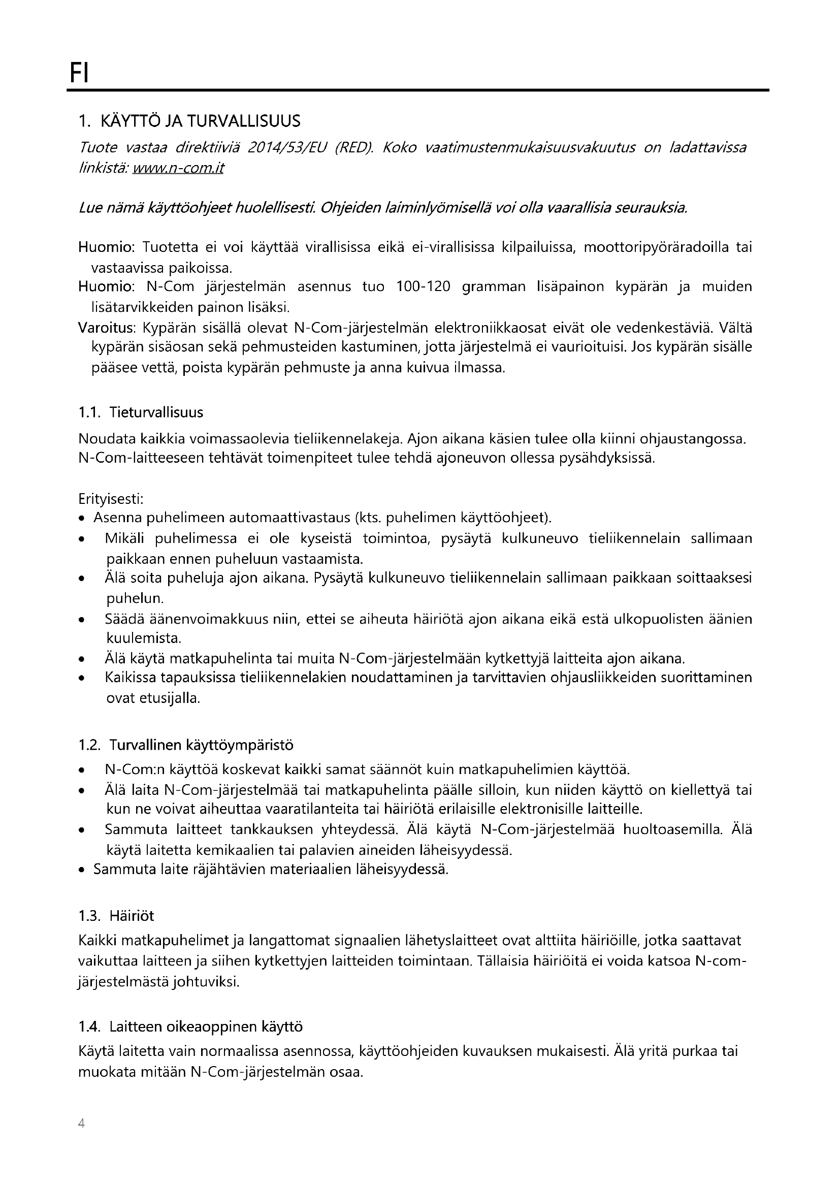 Tuote vastaa direktiiviä 2014/53/EU (RED). Koko vaatimustenmukaisuusvakuutus on ladattavissa linkistä: www.n-com.it Lue nämä käyttöohjeet huolellisesti. Ohjeiden laiminlyömisellä voi olla vaarallisia seurauksia. Huomio: Tuotetta ei voi käyttää virallisissa eikä ei-virallisissa kilpailuissa, moottoripyöräradoilla tai vastaavissa paikoissa. Huomio: N-Com järjestelmän asennus tuo 100-120 gramman lisäpainon kypärän ja muiden lisätarvikkeiden painon lisäksi. Varoitus: Kypärän sisällä olevat N-Com-järjestelmän elektroniikkaosat eivät ole vedenkestäviä. Vältä kypärän sisäosan sekä pehmusteiden kastuminen, jotta järjestelmä ei vaurioituisi. Jos kypärän sisälle pääsee vettä, poista kypärän pehmuste ja anna kuivua ilmassa. 1.1. Tieturvallisuus Noudata kaikkia voimassaolevia tieliikennelakeja. Ajon aikana käsien tulee olla kiinni ohjaustangossa. N-Com-laitteeseen tehtävät toimenpiteet tulee tehdä ajoneuvon ollessa pysähdyksissä. Erityisesti: