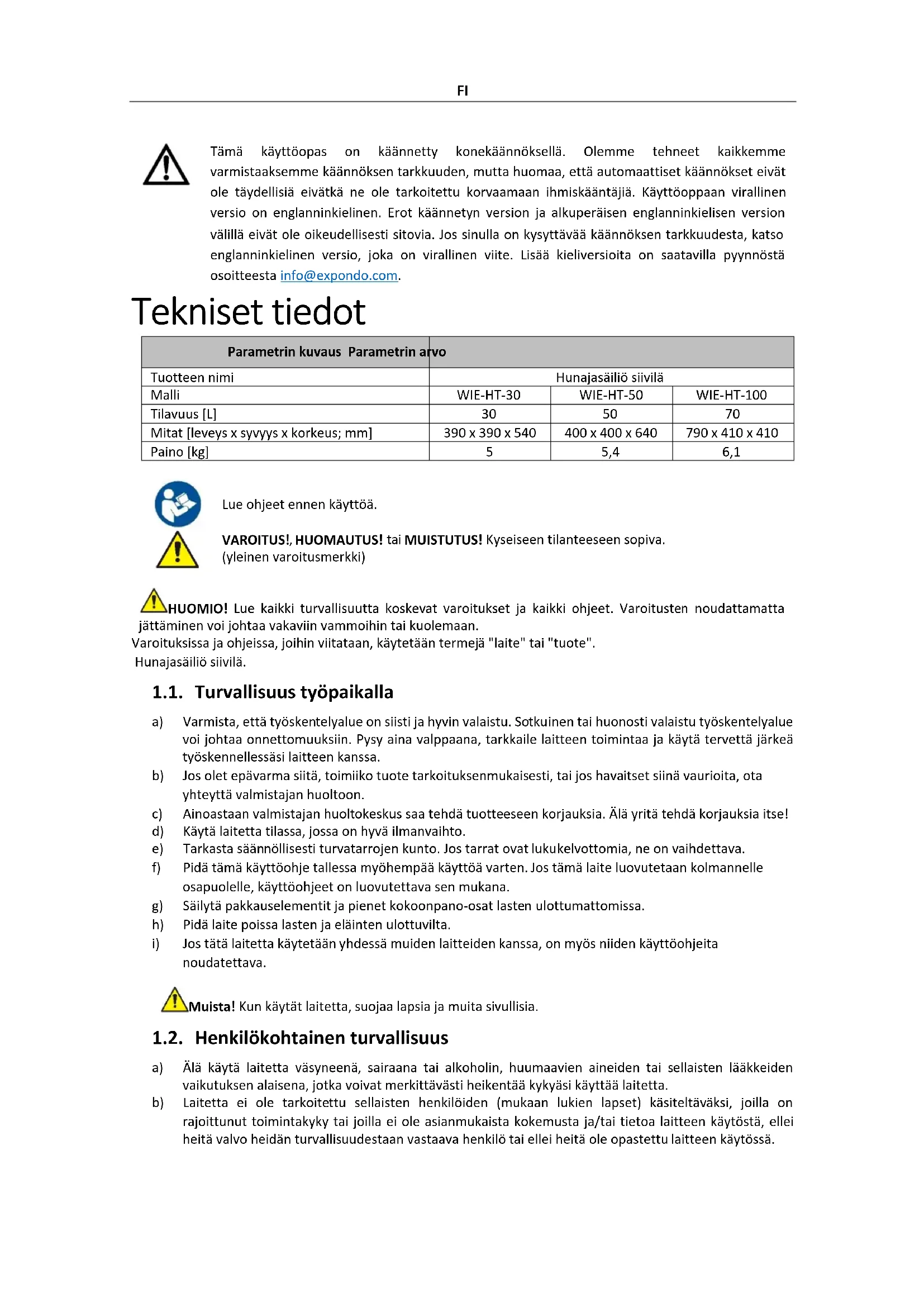 HUOMAUTUS! tai MUISTUTUS! Kyseiseen tilanteeseen sopiva. (yleinen varoitusmerkki) HUOMIO! Lue kaikki turvallisuutta koskevat varoitukset ja kaikki ohjeet. Varoitusten noudattamatta jättäminen voi johtaa vakaviin vammoihin tai kuolemaan. Varoituksissa ja ohjeissa, joihin viitataan, käytetään termejä "laite" tai "tuote". Hunajasäiliö siivilä. 1.1. Turvallisuus työpaikalla a) Varmista, että työskentelyalue on siisti ja hyvin valaistu. Sotkuinen tai huonosti valaistu työskentelyalue voi johtaa onnettomuuksiin. Pysy aina valppaana, tarkkaile laitteen toimintaa ja käytä tervettä järkeä työskennellessäsi laitteen kanssa. b) Jos olet epävarma siitä, toimiiko tuote tarkoituksenmukaisesti, tai jos havaitset siinä vaurioita, ota yhteyttä valmistajan huoltoon. c) Ainoastaan valmistajan huoltokeskus saa tehdä tuotteeseen korjauksia. Älä yritä tehdä korjauksia itse! d) Käytä laitetta tilassa, jossa on hyvä ilmanvaihto. e) Tarkasta säännöllisesti turvatarrojen kunto. Jos tarrat ovat lukukelvottomia, ne on vaihdettava. f) Pidä tämä käyttöohje tallessa myöhempää käyttöä varten. Jos tämä laite luovutetaan kolmannelle osapuolelle, käyttöohjeet on luovutettava sen mukana. g) Säilytä pakkauselementit ja pienet kokoonpano-osat lasten ulottumattomissa. h) Pidä laite poissa lasten ja eläinten ulottuvilta.
