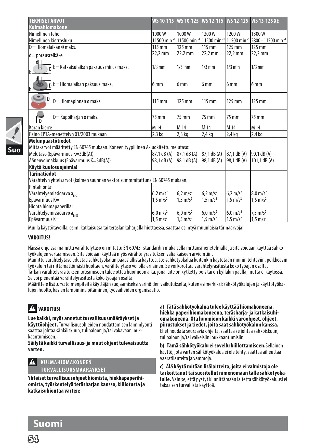 TEKNISET ARVOT Kulmahiomakone Nimellinen teho Nimellinen kierrosluku D= Hiomalaikan Ø maks. d= porausreikä-ø Suo WS 10-115 WS 10-125 WS 12-115 WS 12-125 WS 13-125 XE 1000 W 1000 W 1200 W 1200 W 1300 W 11500 min -1 11500 min -1 11500 min -1 11500 min -1 2800 - 11500 min -1 115 mm 125 mm 115 mm 125 mm 125 mm 22,2 mm 22,2 mm 22,2 mm 22,2 mm 22,2 mm b= Katkaisulaikan paksuus min. / maks. 1/3 mm 1/3 mm 1/3 mm 1/3 mm 1/3 mm b= Hiomalaikan paksuus maks. 6 mm 6 mm 6 mm 6 mm 6 mm D= Hiomapinnan ø maks. 115 mm 125 mm 115 mm 125 mm 125 mm D= Kuppiharjan ø maks. 75 mm 75 mm 75 mm 75 mm 75 mm Karan kierre M 14 M 14 M 14 M 14 Paino EPTA-menettelyn 01/2003 mukaan 2,3 kg 2,3 kg 2,4 kg 2,4 kg Melunpäästötiedot Mitta-arvot määritetty EN 60745 mukaan. Koneen tyypillinen A-luokitettu melutaso: Melutaso (Epävarmuus K=3dB(A)) 87,1 dB (A) 87,1 dB (A) 87,1 dB (A) 87,1 dB (A) Äänenvoimakkuus (Epävarmuus K=3dB(A)) 98,1 dB (A) 98,1 dB (A) 98,1 dB (A) 98,1 dB (A) Käytä kuulosuojaimia! Tärinätiedot Värähtelyn yhteisarvot (kolmen suunnan vektorisummmitattuna EN 60745 mukaan. Pintahionta: Värähtelyemissioarvo ah,SG 6,2 m/s2 6,2 m/s2 6,2 m/s2 6,2 m/s2