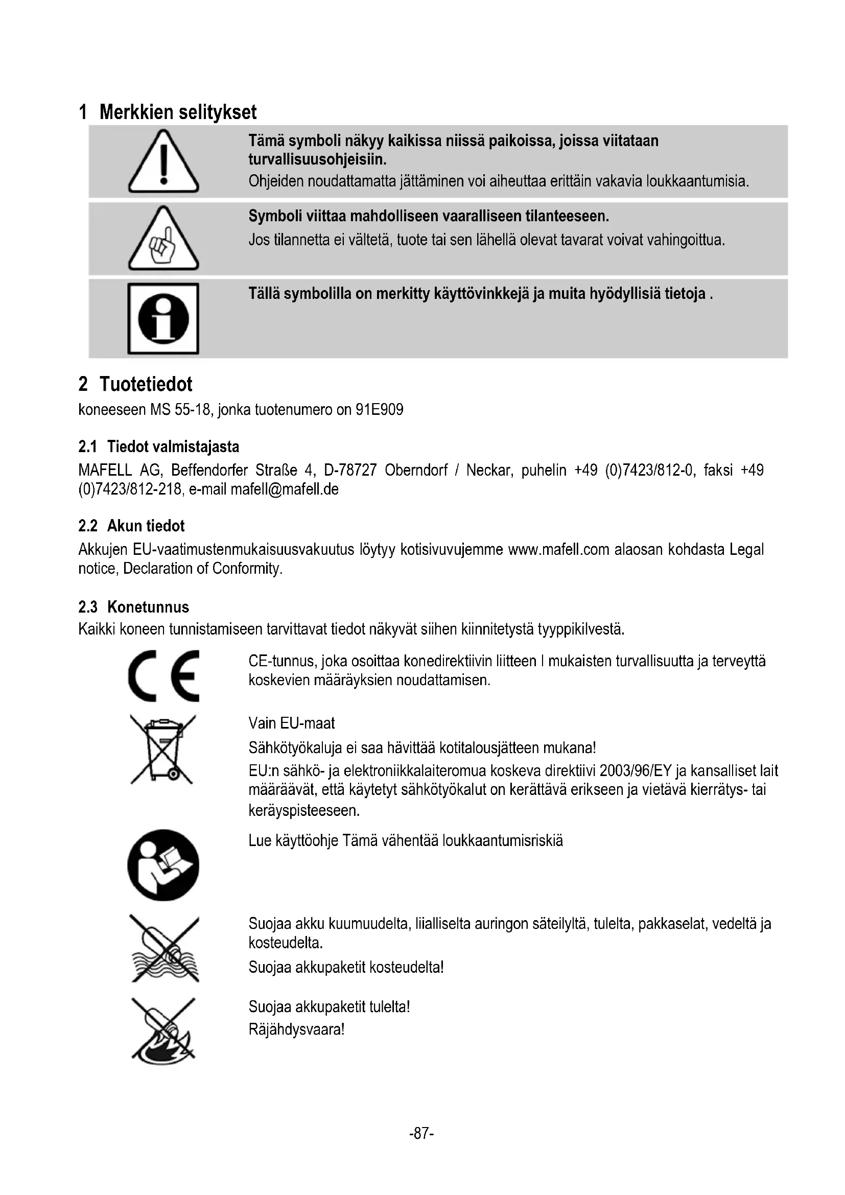 Akkujen EU-vaatimustenmukaisuusvakuutus löytyy kotisivuvujemme www.mafell.com alaosan kohdasta Legal notice, Declaration of Conformity.