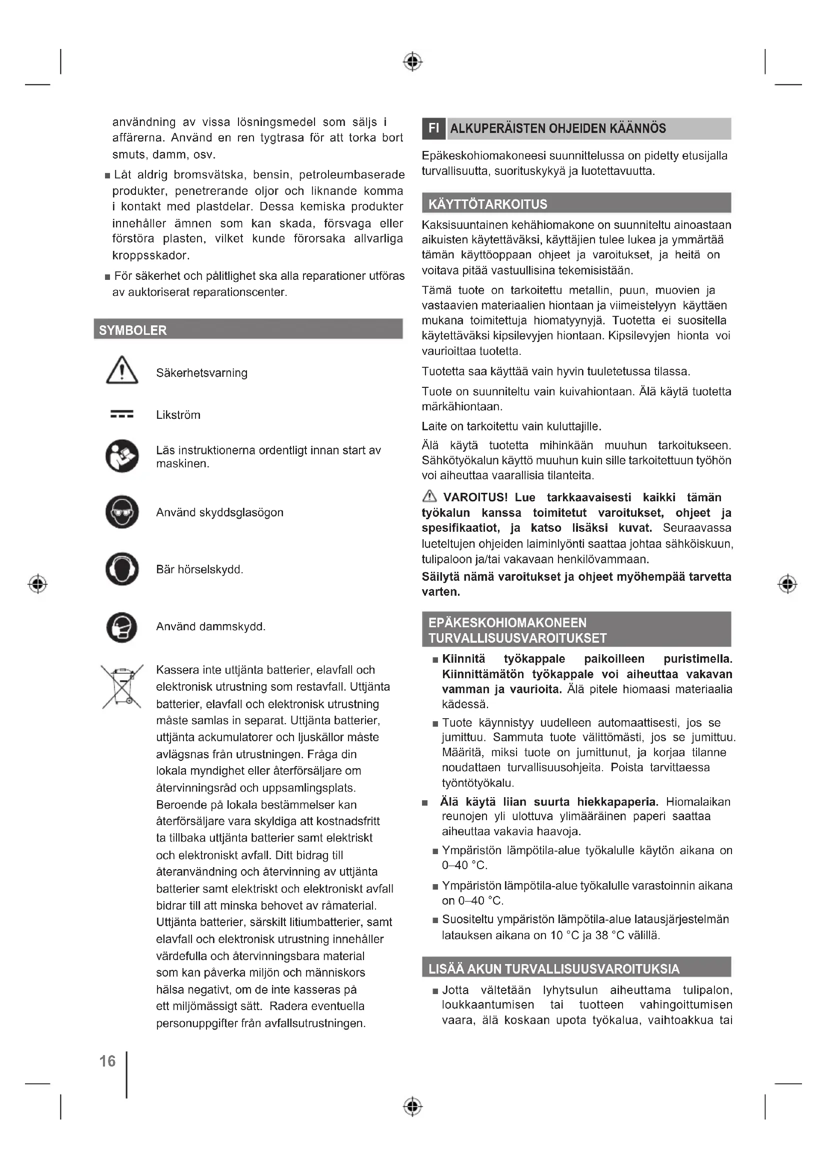 HUOLTO ■ Tuotetta ei tule koskaan kytkeä pistorasiaan osia koottaessa, säätöjä tehtäessä, puhdistettaessa, huollon aikana tai kun tuotetta ei aiota käyttää. Laitteen irrottaminen virtalähteestä estää vahingossa tapahtuvan käynnistymisen, mikä voi aiheuttaa vakavan loukkaantumisen. ■ Käytä huollossa ainoastaan alkuperäisiä valmistajan tuottamia varaosia, lisälaitteita ja lisävarusteita. Muunlaisten osien käyttö voi aiheuttaa vaaran tai vioittaa laitetta. ■ Älä puhdista muoviosia liuottimilla. Suurin osa muoveista ei siedä markkinoilla olevia määrättyjä liuotteita, jotka vahingoittavat niitä. Käytä puhdasta riepua lian, pölyn jne. puhdistukseen. ■ Älä koskaan päästä jarrunesteitä, bensiiniä, öljytuotteita, läpäiseviä öljyjä tms. kosketuksiin muoviosien kanssa. Nämä kemialliset tuotteet sisältävät aineitta, jotka voivat vaurioittaa, heikentää tai tuhota muovin minkä seurauksena voi aiheutua vakavia ruumiinvammoja. ■ Jotta laite toimisi turvallisesti ja luotettavasti, kaikki korjaukset tulee antaa valtuutetun huoltopisteen hoidettavaksi. SYMBOLIT Turvallisuusvaroitus Tasavirta Lue ohjeet huolellisesti ennen laitteen käynnistämistä. Käytä suojalaseja Käytä kuulosuojaimia Käytä pölynaamaria. Älä hävitä käytettyjä akkuja sekä sähkö- ja elektroniikkalaiteromua lajittelemattomana yhdyskuntajätteenä. Käytetyt akut sekä sähkö- ja elektroniikkalaiteromu on kerättävä erikseen. Käytetyt paristot ja akut ja hukkavalonlähteet on poistettava laitteista. Kysy paikalliselta viranomaiselta tai jälleenmyyjältä kierrätysneuvoja ja tietoja keräyspisteistä. Paikallisten määräysten mukaan jälleenmyyjillä voi olla velvollisuus ottaa käytetyt akut sekä sähkö- ja elektroniikkalaiteromu takaisin veloituksetta. Panoksesi käytettyjen akkujen sekä sähkö- ja elektroniikkalaiteromun uudelleenkäyttöön ja kierrätykseen auttaa vähentämään raaka- aineiden kysyntää. Käytetyt, erityisesti litiumia sisältävät akut sekä sähkö- ja elektroniikkalaiteromu sisältävät arvokkaita ja kierrätettäviä materiaaleja, jotka voivat vaikuttaa haitallisesti ympäristöön ja ihmisten terveyteen, jos niitä ei hävitetä ympäristöystävällisellä tavalla. Poista mahdolliset henkilötiedot jätelaitteista. SUOMI