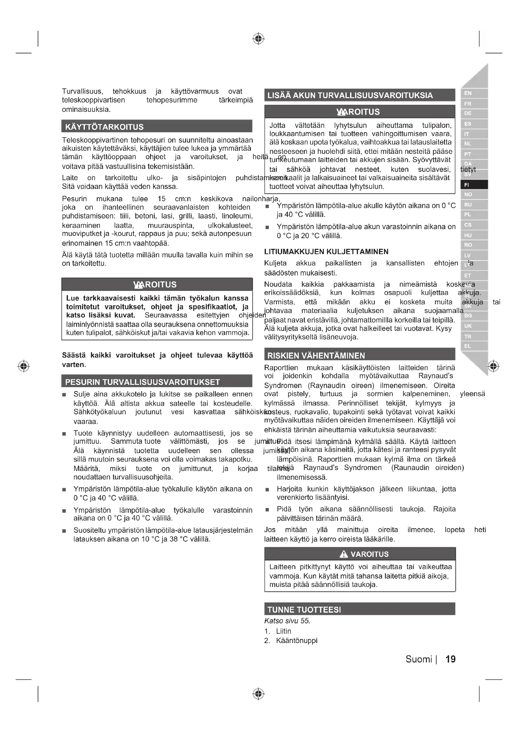 Teleskooppivartinen tehopesuri on suunniteltu ainoastaan DLNXLVWHQNl\WHWWlYlNVLNl\WWlMLHQWXOHHOXNHDMD\PPlUWll WlPlQ Nl\WW|RSSDDQ RKMHHW MD YDURLWXNVHW MD KHLWl RQ voitava pitää vastuullisina tekemisistään. /DLWH RQ WDUNRLWHWWX XONR MD VLVlSLQWRMHQ SXKGLVWDPLVHHQ Sitä voidaan käyttää veden kanssa.