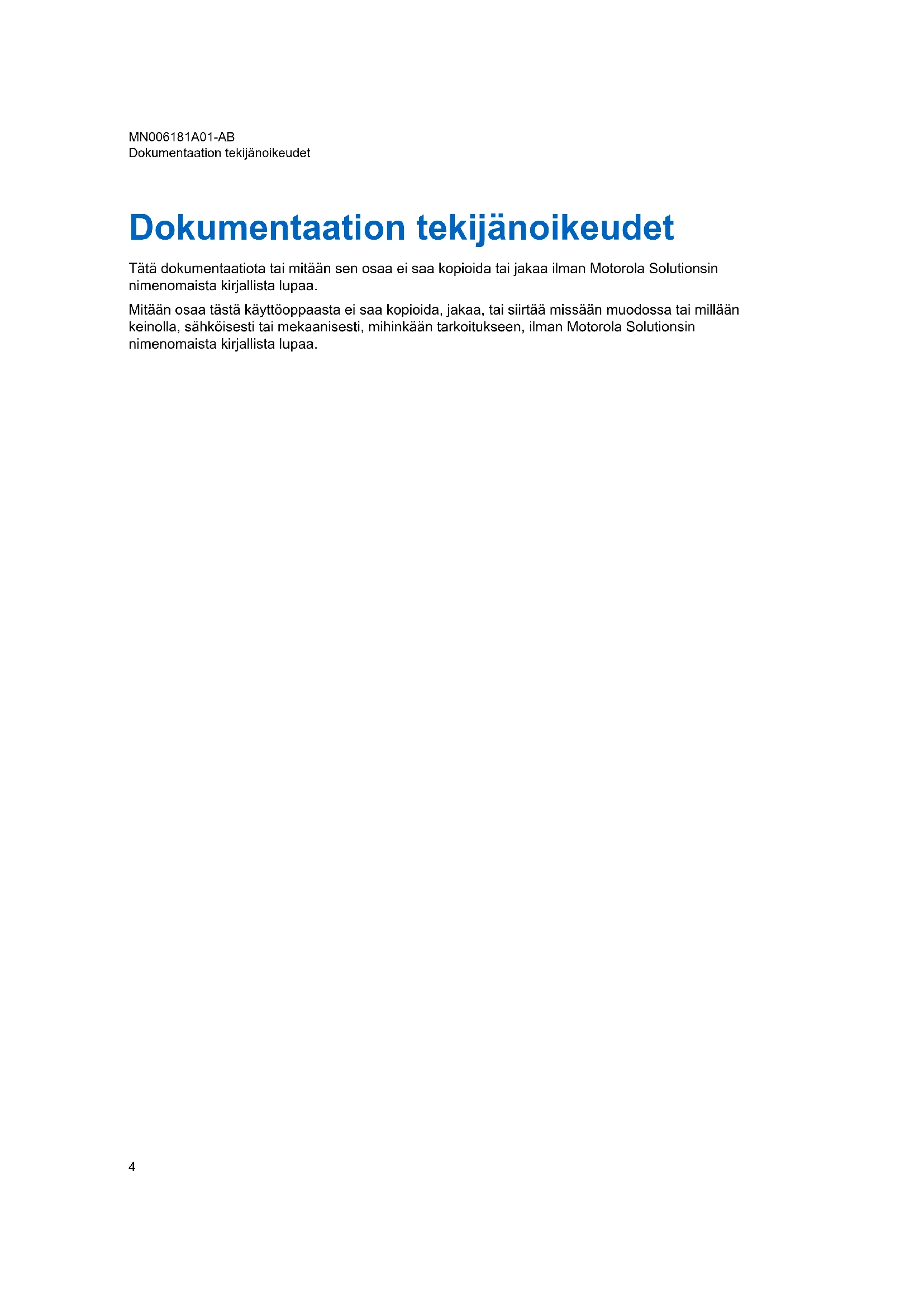 Luku 11: Lisävarusteet............................................................................................ 48 MN006181A01-AB Sisältö 3Dokumentaation tekijänoikeudet Tätä dokumentaatiota tai mitään sen osaa ei saa kopioida tai jakaa ilman Motorola Solutionsin nimenomaista kirjallista lupaa. Mitään osaa tästä käyttöoppaasta ei saa kopioida, jakaa, tai siirtää missään muodossa tai millään keinolla, sähköisesti tai mekaanisesti, mihinkään tarkoitukseen, ilman Motorola Solutionsin nimenomaista kirjallista lupaa. MN006181A01-AB Dokumentaation tekijänoikeudet 4Vastuuvapautuslauseke Tässä asiakirjassa olevat tiedot on tarkastettu huolellisesti, ja niitä pidetään täysin luotettavina. Vastuut epätarkkuuksista kuitenkin torjutaan. Motorola Solutions lisäksi pidättää itsellään oikeuden tehdä tässä mainittuihin tuotteisiin mitä tahansa muutoksia luettavuuden, toimivuuden tai muotoilun parantamiseksi. Motorola Solutions ei ole vastuussa mistään ongelmista, jotka aiheutuvat tässä kuvatuista ohjelmistoista tai tässä kuvattujen tuotteiden tai piirien käytöstä; se ei myöskään anna mitään lisenssiä patenttioikeuksiinsa eikä muiden osapuolten oikeuksiin. MN006181A01-AB Vastuuvapautuslauseke 5Tietokoneohjelmistojen tekijänoikeudet Tässä oppaassa kuvatut Motorola Solutionsin tuotteet saattavat sisältää Motorola Solutionsin tekijänoikeuksin suojattuja tietokoneohjelmia, puolijohdemuisteja tai muita tallennusvälineitä. Yhdysvaltain ja muiden maiden lait takaavat Motorola Solutionsille tietyt yksinoikeudet tekijänoikeuksin suojattuihin tietokoneohjelmiin. Näihin oikeuksiin kuuluvat muun muassa yksinomaiset oikeudet kopioida ja tuottaa uudelleen millä tahansa tavalla tekijänoikeuksin suojattuja tietokoneohjelmia. Näissä käyttöohjeissa kuvattujen Motorola Solutionsin tuotteiden Motorola Solutions -tietokoneohjelmia ei saa kopioida, jäljentää, muokata tai jakaa millään tavalla ilman Motorola Solutionsin nimenomaista kirjallista lupaa, eikä niiden valmistustapaa saa selvittää millään tavalla. Motorola Solutionsin tuotteiden ostaminen ei myöskään myönnä suoraan tai epäsuorasti mitään lisenssiä Motorola Solutionsin tekijänoikeuksiin, patentteihin tai patenttihakemuksiin, lukuun ottamatta tavanomaista lain mukaan ostajalle kuuluvaa lupaa käyttää tuotetta. MN006181A01-AB Tietokoneohjelmistojen tekijänoikeudet 6Turvallisuustietoja akuista, latureista ja äänilisävarusteista Tämä asiakirja sisältää tärkeitä turva- ja käyttöohjeita. Lue ohjeet huolellisesti ja pidä ne tallessa. Lue ennen akkulaturin käyttöä kaikki käyttöohjeet ja varoitusmerkinnät, jotka ovat