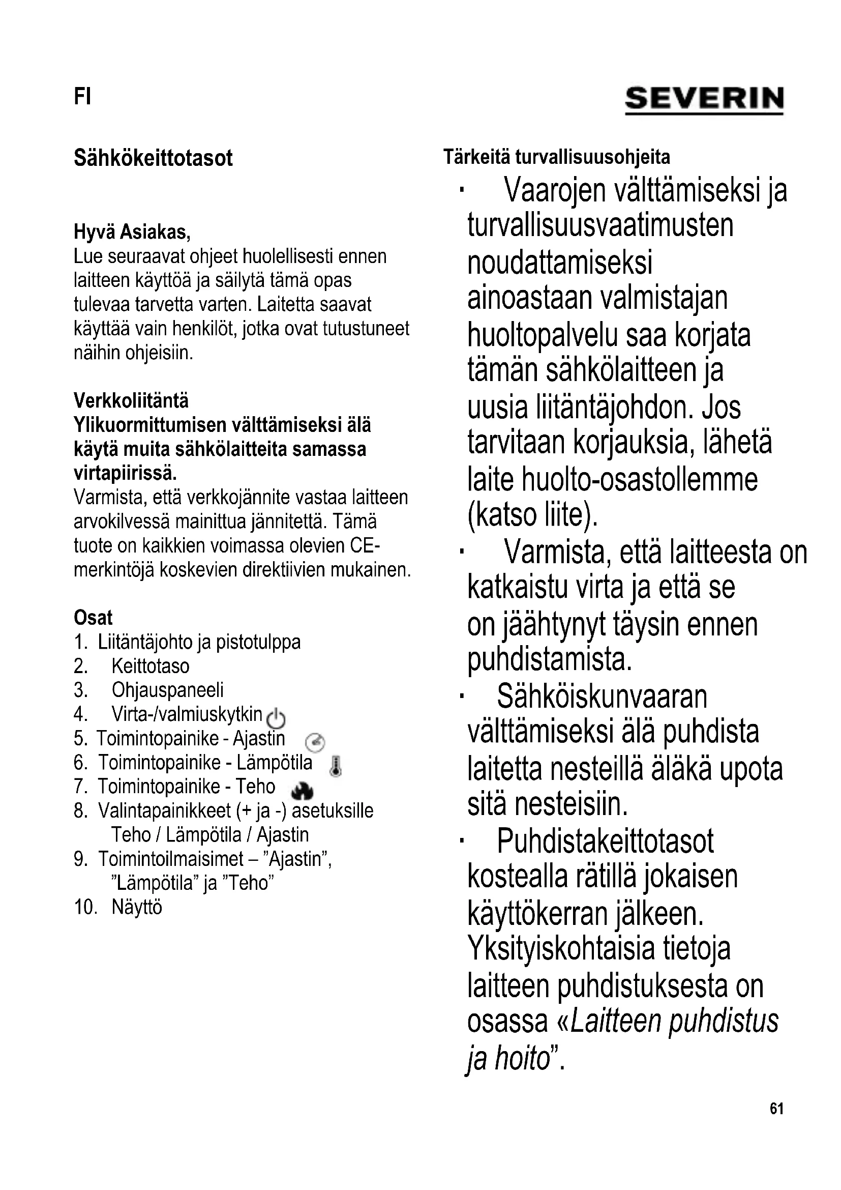 Tärkeitä turvallisuusohjeita ∙ Vaarojen välttämiseksi ja turvallisuusvaatimusten noudattamiseksi ainoastaan valmistajan huoltopalvelu saa korjata tämän sähkölaitteen ja uusia liitäntäjohdon. Jos tarvitaan korjauksia, lähetä laite huolto-osastollemme (katso liite). ∙ Varmista, että laitteesta on katkaistu virta ja että se on jäähtynyt täysin ennen puhdistamista. ∙ Sähköiskun vaaran välttämiseksi älä puhdista laitetta nesteillä äläkä upota sitä nesteisiin. ∙ Puhdista keittotasot kostealla rätillä jokaisen käyttökerran jälkeen. Yksityiskohtaisia tietoja laitteen puhdistuksesta on osassa «Laitteen puhdistus ja hoito”. FI62 104 x 142 mm ∙ Varoitus: Jos pinnassa näkyy halkeamien tai vastaavien vaurioiden merkkejä, laitteesta täytyy sähköiskujen vaaran välttämiseksi katkaista virta ja se tulee irrottaa pistorasiasta. ∙ Tätä laitetta ei ole tarkoitettu käytettäväksi erillisen ajastimen tai kaukosäätimen kanssa. ∙ Älä sijoita keittotasoille metalliesineitä (esim. veitsiä, haarukoita tai lusikoita), koska tällaiset esineet voivat kuumeta. ∙ Tämä laite on tarkoitettu kotitalouskäyttöön tai vastaavaan, kuten - ruokalat, toimistot ja muut kaupalliset ympäristöt - maatalousyritykset - hotellien, motellien jne. ja vastaavien yritysten asiakkaat - aamiaisen ja majoituksen tarjoavat majatalot. ∙ Tätä laitetta saavat käyttää lapset (vähintään 8-vuotiaat) sekä henkilöt, joilla on fyysisesti, aistillisesti tai henkisesti rajoittunut toimintakyky tai joilla on puuttuvat tai vajavaiset tiedot laitteen toiminnasta, mikäli heitä valvotaan tai ohjataan laitteen käytössä ja he ymmärtävät täysin kaikki käyttöön liittyvät vaarat ja turvatoimenpiteet. ∙ Lasten ei saa antaa leikkiä laitteella. ∙ Lasten ei saa antaa tehdä laitteen puhdistus- tai huoltotoimenpiteitä, elleivät he ole aikuisen valvonnassa sekä vähintään 8 vuotta vanhoja. ∙ Laite ja sen liitäntäjohto täytyy aina pitää104 x 142 mm