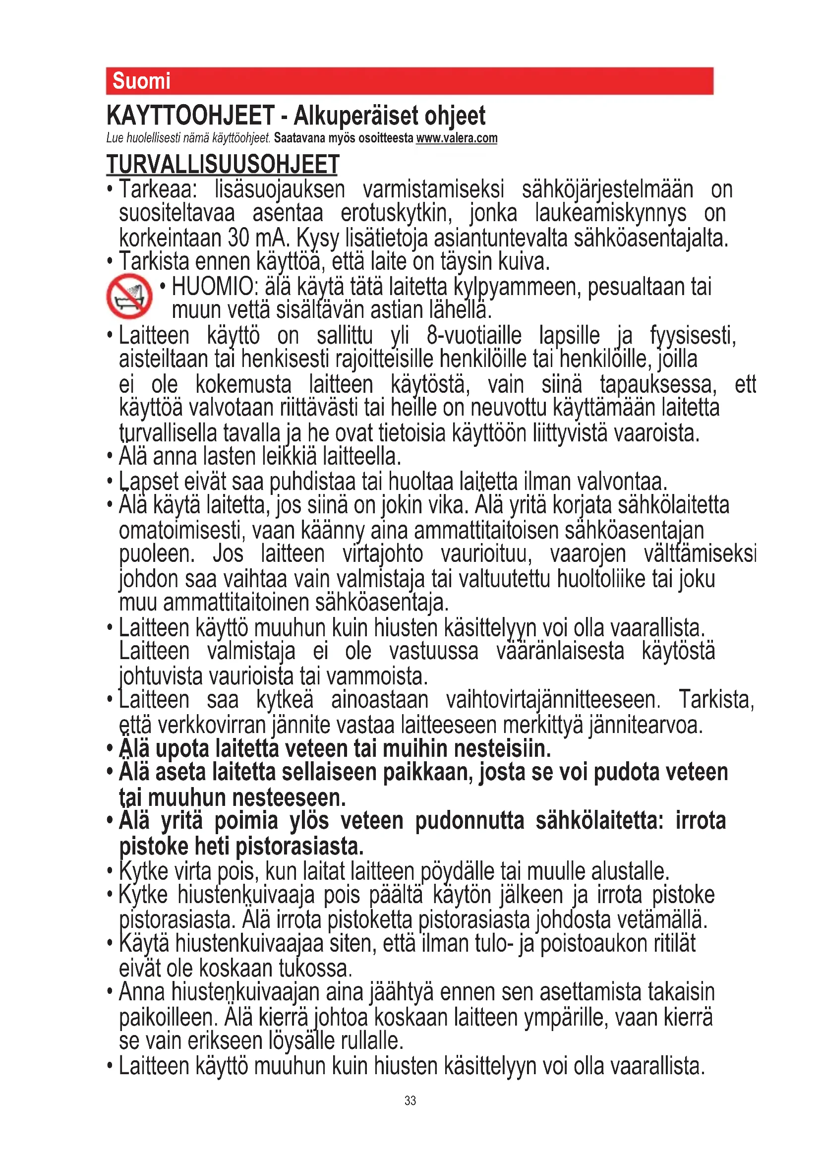 VALERA är ett registrerat LIGO PATENTS SA varumärke - Schweiz33 Suomi KAYTTOOHJEET - Alkuperäiset ohjeet Lue huolellisesti nämä käyttöohjeet. Saatavana myös osoitteesta www.valera.com TURVALLISUUSOHJEET