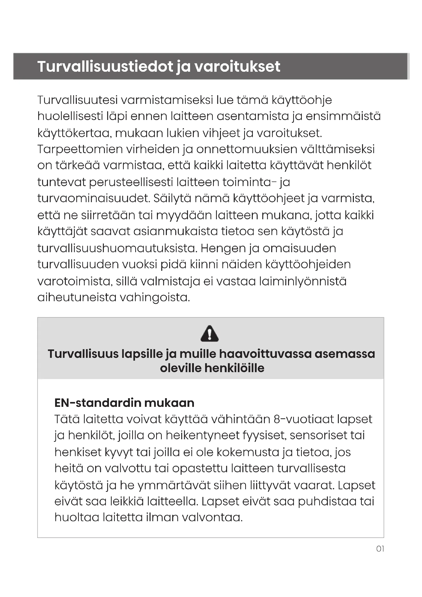 Turvallisuustiedot ja varoituksetVAROITUS Tämä laite on tarkoitettu käytettäväksi kotitalouksissa ja vastaavissa paikoissa, kuten
