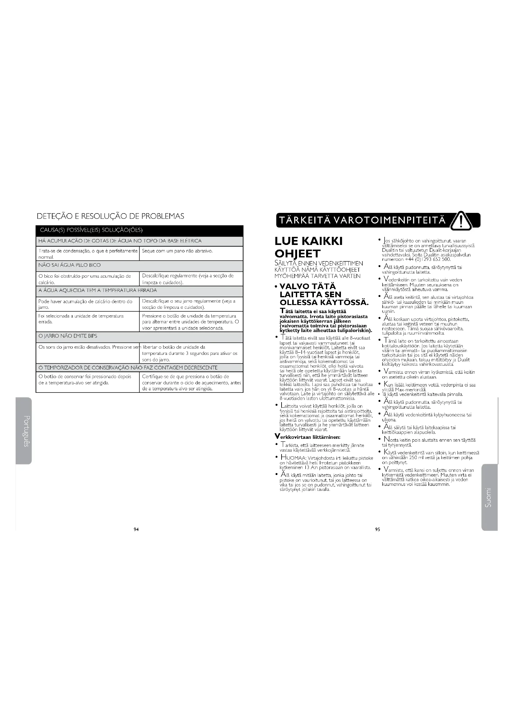 - Vesi on kuumaa melko pitkään kuumentamisen jälkeen, joten se voi aiheuttaa palovammoja. Varmista, etteivät vedenkeitin, alusta ja virtajohto ole työtason reunalla ja että ne ovat lasten ulottumattomissa. VAROITUS: Tässä vedenkeittimessä on pitotoiminto, joka ylläpitää lämpötilan vielä 5 minuuttia tavoitelämpötilan saavuttamisen jälkeen. Palovammavaara. Säilytettävä lasten ulottumattomissa.