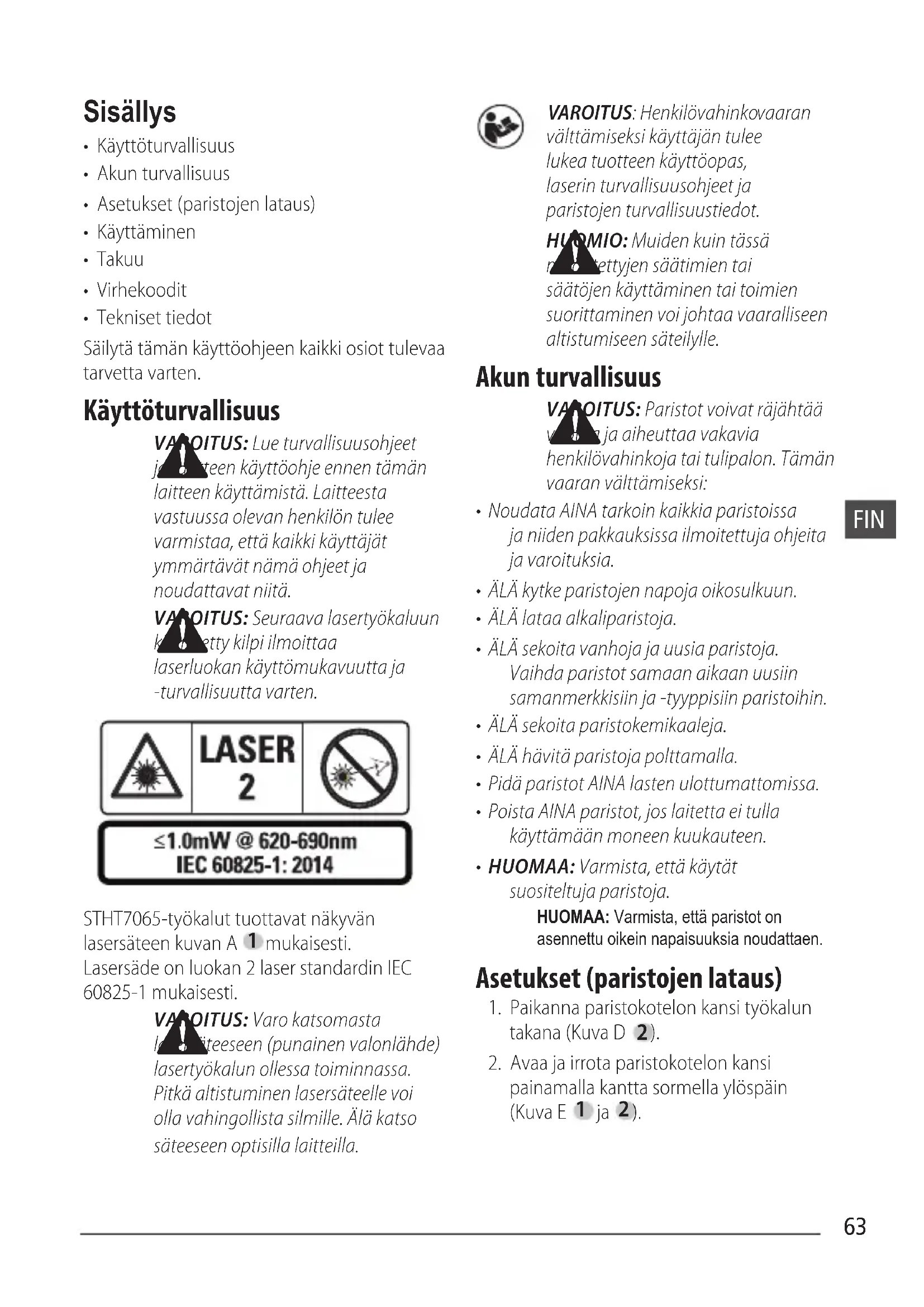 STHT7065-työkalut tuottavat näkyvän lasersäteen kuvan A mukaisesti. Lasersäde on luokan 2laser standardin IEC 60825-1mukaisesti. VAROITUS: Varo katsomasta lasersäteeseen (punainen valonlähde) lasertyökalun ollessa toiminnassa. Pitkä altistuminen lasersäteelle voi olla vahingollista silmille. Älä katso säteeseen optisillalaitteilla. VAROITUS: Henkilövahinkovaaran välttämiseksi käyttäjän tulee lukea tuotteen käyttöopas, laserin turvallisuusohjeet ja paristojenturvallisuustiedot. HUOMIO: Muiden kuin tässä määritettyjen säätimien tai säätöjen käyttäminen tai toimien suorittaminen voi johtaa vaaralliseen altistumiseensäteilylle. Akun turvallisuus