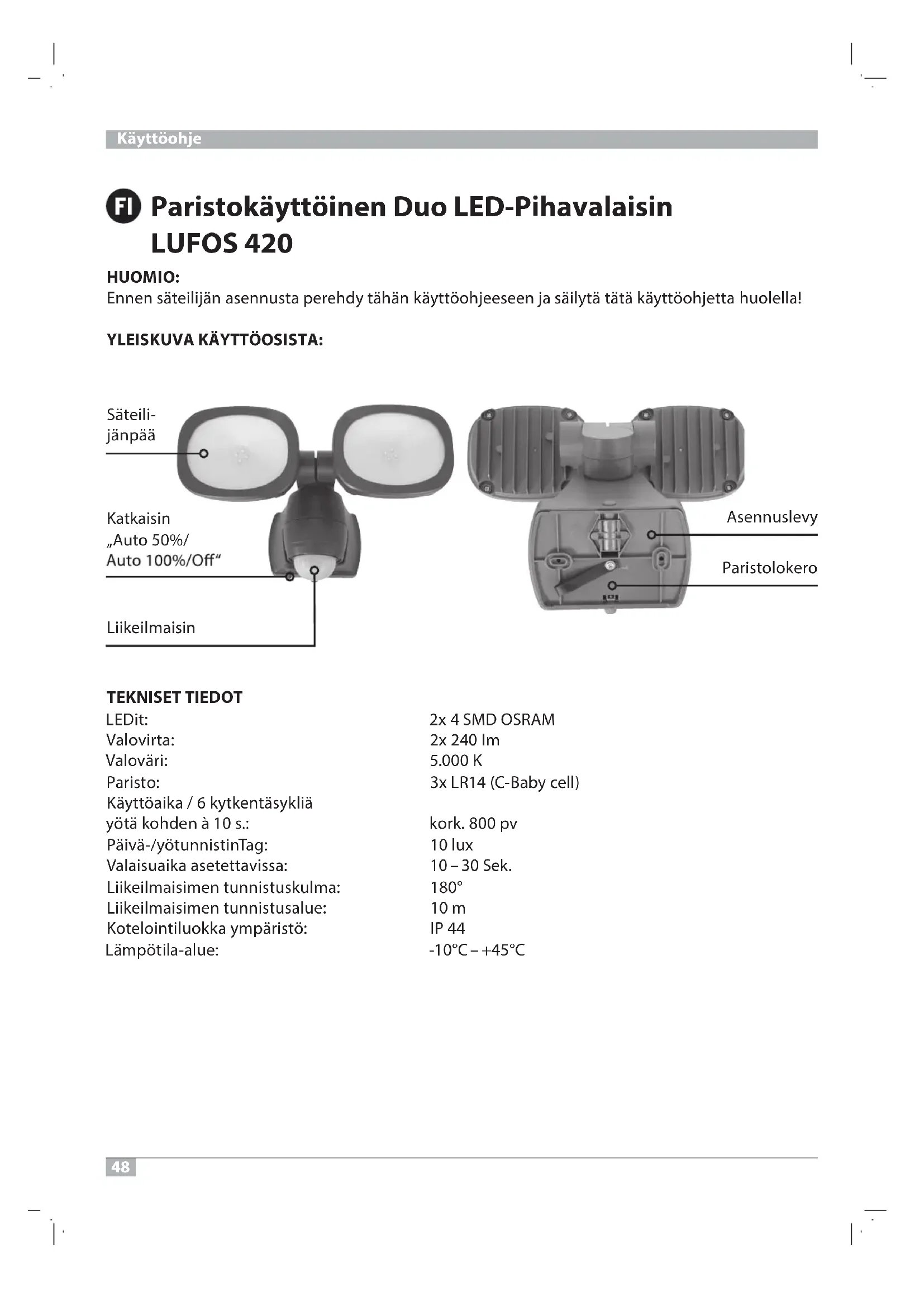 Molempia kohdevalon päitä voidaan kääntää vaakasuorassa tai taivuttaa pystysuorassa erikseen tai yhdessä. Säätö tapahtuu portaattomasti ja ilman työkaluja. Paristokäyttöinen Duo LED-Pihavalaisin LUFOS50 Paristokäyttöinen Duo LED-Pihavalaisin LUFOS TOIMINNANKUVAUS Painikkeella ”AUTO 50 % / AUTO 100 % / OFF” voidaan valita 50-prosenttinen tai 100-prosenttinen valaisuteho tai sammuttaa valaisin kokonaan (kuva 8). Näin akun käyttöikä voi kasvaa 400 päivästä (100 % valaistus) 800 päivään (50 % valaistus). Säteilijä on varustettu päivä-/yö- ja infrapunatunnistimella. Päivä-/yötunnistin aktivoi säteilijän. Säteilijä kytkeytyy automaattisesti päälle, kun infrapunatunnistin havaitsee liikettä ympäristössä. Älä kohdista liikeilmaisinta mahdollisuuksien mukaan uima-altaaseen, kuumanilman poistokana- vaan, ilmastointilaitteeseen tai kohteisiin, jotka on altistettu huomattaville lämpötilanvaihteluille. Vältä kohdistamatta liikeilmaisinta puihin ja pusikoihin tai paikkoihin, jossa lemmikkieläimet viihtyvät. Liikeilmaisinta voidaan kääntää vaakasuorassa oikealle ja vasemmalle ja tunnistusaluetta voidaan siis muuttaa näin. Huomaa säteilijän kiinnityksen yhteydessä, että liikeilmaisin reagoi herkimmin liikkeisiin, jotka läpäisevät sen tunnistuskentän poikittain ja vähiten liikkeisiin, jotka on suunnattu suoraan laitetta kohden. Kytkentäaika voidaan säätää liikeilmaisimesta (kuva 7). Käännä tätä varten liikeilmaisimen päätä niin pitkälle, kunnes säädin tulee näkyviin. Tämän säätimen avulla voit valita toivomasi kytkentäa- jan 10 ja 30 sekunnin väliltä sen jälkeen, kun viimeinen liike tunnistettiin. Kääntämällä TIME- ajastinta myötäpäivään aikaväli pitenee ja vastapäivään kääntämällä se lyhenee. Paristojen vaihto (kuva 9 – 13) Paristot on vaihdettava, kun lamppu alkaa vilkkua. Avaa kiinnitysruuvi (kuva 9.1) kiertämällä sitä kevyesti auki. Paina avausnuppia (kuva 9.2) ja vedä säteilijä irti asennuslevystä (kuva 9.3). Vedä paristo ulos "poistoliuskan" avulla paristolokerosta (kuva 10). Varustele paristolokero uusilla paristoilla. Aseta tätä varten "poistoliuska" paristojen alle. Paristojen oikeanlainen napaisuus on merkitty paristolokeroon (kuva 11). Paina avausnuppia (kuva 12.1) ja paina säteilijää ruuvattua asennuslevyä vasten (kuva 12.2). Kierrä kiinnitysruuvi (kuva 12.3) taas kireälle. HUOLTO Tämän säteilijän valolähdettä ei voi korvata. Kun valolähde on saavuttanut lopullisen elinikänsä, koko säteilijä on korvattava. PUHDISTUS Älä käytä liuotinaineita, syövyttäviä puhdistusaineita tms. Käytä puhdistukseen vain kuivaa tai hieman kostutettua liinaa.51