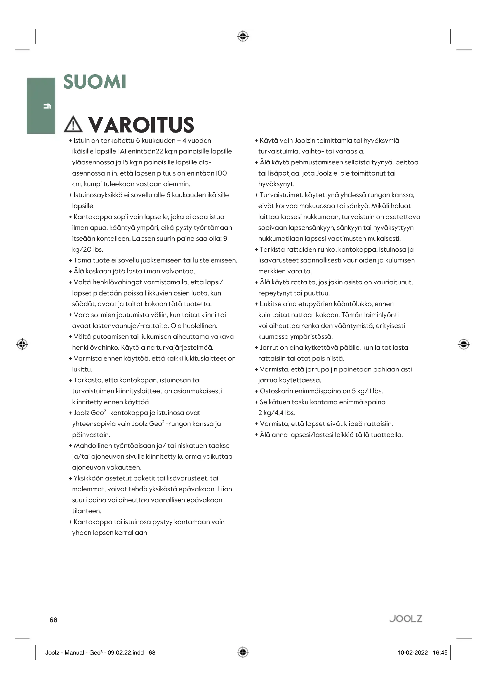 Sikkerhet var en viktig faktor under utviklingen av Joolz Geo³. Våre produkter er oppfyller derfor følgende sikkerhetsstandarder: Europe: EN1888-2:2018 & EN 1466:2014/AC:2015 United States: ASTM F833-21, ASTM F2050-19 Canada: SOR/2016-167 Australia: AS/NZS 2088:2013 Besøk joolz.com, facebook.com/myjoolz eller ta kontakt med forhandleren din for spørsmål og/eller kommentarer. Joolz - Manual - Geo³ - 09.02.22.indd 67Joolz - Manual - Geo³ - 09.02.22.indd 67 10-02-2022 16:4510-02-2022 16:4568 SUOMI VAROITUS + Istuin on tarkoitettu 6 kuukauden – 4 vuoden ikäisille lapsilleTAI enintään22 kg:n painoisille lapsille yläasennossa ja 15 kg:n painoisille lapsille ala- asennossa niin, että lapsen pituus on enintään 100 cm, kumpi tuleekaan vastaan aiemmin. + Istuinosayksikkö ei sovellu alle 6 kuukauden ikäisille lapsille. + Kantokoppa sopii vain lapselle, joka ei osaa istua ilman apua, kääntyä ympäri, eikä pysty työntämaan itseään kontalleen. Lapsen suurin paino saa olla: 9 kg/20 lbs. + Tämä tuote ei sovellu juoksemiseen tai luistelemiseen. + Älä koskaan jätä lasta ilman valvontaa. + Vältä henkilövahingot varmistamalla, että lapsi/ lapset pidetään poissa liikkuvien osien luota, kun säädät, avaat ja taitat kokoon tätä tuotetta. + Varo sormien joutumista väliin, kun taitat kiinni tai avaat lastenvaunuja/-rattaita. Ole huolellinen. + Vältä putoamisen tai liukumisen aiheuttama vakava henkilövahinko. Käytä aina turvajärjestelmää. + Varmista ennen käyttöä, että kaikki lukituslaitteet on lukittu. + Tarkasta, että kantokopan, istuinosan tai turvaistuimen kiinnityslaitteet on asianmukaisesti kiinnitetty ennen käyttöä + Joolz Geo³ -kantokoppa ja istuinosa ovat yhteensopivia vain Joolz Geo³ -rungon kanssa ja päinvastoin. + Mahdollinen työntöaisaan ja/ tai niskatuen taakse ja/tai ajoneuvon sivulle kiinnitetty kuorma vaikuttaa ajoneuvon vakauteen. + Yksikköön asetetut paketit tai lisävarusteet, tai molemmat, voivat tehdä yksiköstä epävakaan. Liian suuri paino voi aiheuttaa vaarallisen epävakaan tilanteen. + Kantokoppa tai istuinosa pystyy kantamaan vain yhden lapsen kerrallaan + Käytä vain Joolzin toimittamia tai hyväksymiä turvaistuimia, vaihto- tai varaosia. + Älä käytä pehmustamiseen sellaista tyynyä, peittoa tai lisäpatjaa, jota Joolz ei ole toimittanut tai hyväksynyt. + Turvaistuimet, käytettynä yhdessä rungon kanssa, eivät korvaa makuuosaa tai sänkyä. Mikäli haluat laittaa lapsesi nukkumaan, turvaistuin on asetettava sopivaan lapsensänkyyn, sänkyyn tai hyväksyttyyn nukkumatilaan lapsesi vaatimusten mukaisesti. + Tarkista rattaiden runko, kantokoppa, istuinosa ja lisävarusteet säännöllisesti vaurioiden ja kulumisen merkkien varalta. + Älä käytä rattaita, jos jokin osista on vaurioitunut, repeytynyt tai puuttuu. + Lukitse aina etupyörien kääntölukko, ennen kuin taitat rattaat kokoon. Tämän laiminlyönti voi aiheuttaa renkaiden vääntymistä, erityisesti kuumassa ympäristössä. + Jarrut on aina kytkettävä päälle, kun laitat lasta rattaisiin tai otat pois niistä. + Varmista, että jarrupoljin painetaan pohjaan asti jarrua käytettäessä. + Ostoskorin enimmäispaino on 5 kg/11 lbs. + Selkätuen tasku kantama enimmäispaino 2 kg/4,4 lbs. + Varmista, että lapset eivät kiipeä rattaisiin. + Älä anna lapsesi/lastesi leikkiä tällä tuotteella.