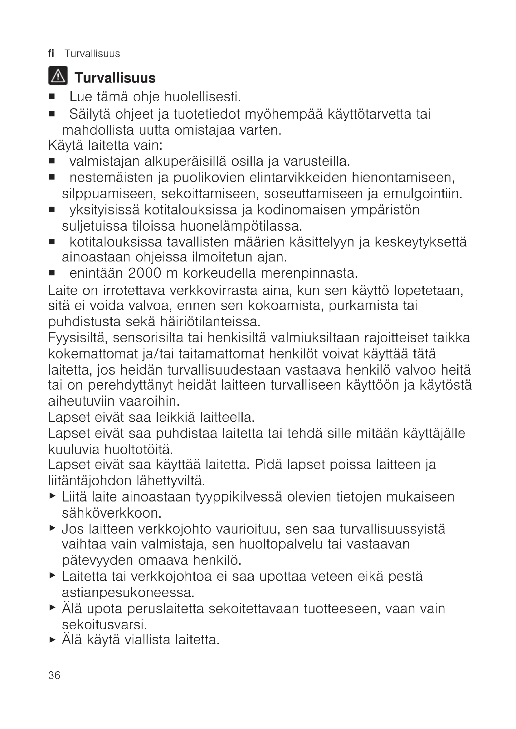 Turvallisuus ¡ Lue tämä ohje huolellisesti. ¡ Säilytä ohjeet ja tuotetiedot myöhempää käyttötarvetta tai mahdollista uutta omistajaa varten. Käytä laitetta vain: ¡ valmistajan alkuperäisillä osilla ja varusteilla. ¡ nestemäisten ja puolikovien elintarvikkeiden hienontamiseen, silppuamiseen, sekoittamiseen, soseuttamiseen ja emulgointiin. ¡ yksityisissä kotitalouksissa ja kodinomaisen ympäristön suljetuissa tiloissa huonelämpötilassa. ¡ kotitalouksissa tavallisten määrien käsittelyyn ja keskeytyksettä ainoastaan ohjeissa ilmoitetun ajan. ¡ enintään 2000m korkeudella merenpinnasta. Laite on irrotettava verkkovirrasta aina, kun sen käyttö lopetetaan, sitä ei voida valvoa, ennen sen kokoamista, purkamista tai puhdistusta sekä häiriötilanteissa. Fyysisiltä, sensorisilta tai henkisiltä valmiuksiltaan rajoitteiset taikka kokemattomat ja/tai taitamattomat henkilöt voivat käyttää tätä laitetta, jos heidän turvallisuudestaan vastaava henkilö valvoo heitä tai on perehdyttänyt heidät laitteen turvalliseen käyttöön ja käytöstä aiheutuviin vaaroihin. Lapset eivät saa leikkiä laitteella. Lapset eivät saa puhdistaa laitetta tai tehdä sille mitään käyttäjälle kuuluvia huoltotöitä. Lapset eivät saa käyttää laitetta. Pidä lapset poissa laitteen ja liitäntäjohdon lähettyviltä.