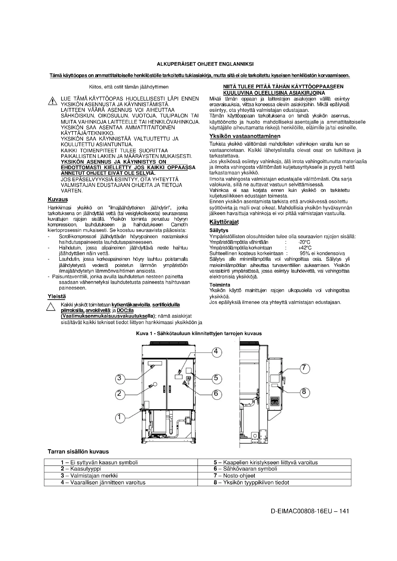 Kuva 1 - Sähkötauluun kiinnitettyjen tarrojen kuvaus Tarran sisällön kuvaus 1 – Ei syttyvän kaasun symboli 5 – Kaapelien kiristykseen liittyvä varoitus 2 – Kaasutyyppi 6 – Sähkövaaran symboli 3 – Valmistajan merkki 7 – Nosto-ohjeet 4 – Vaarallisen jännitteen varoitus 8 – Yksikön tyyppikilven tiedotD-EIMAC00808-16EU – 142